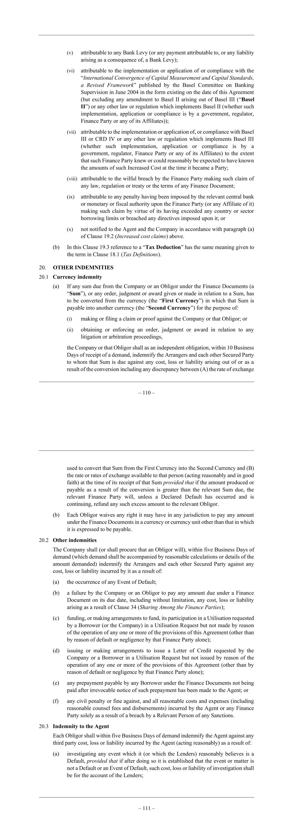 – 110 – (v) attributable to any Bank Levy (or any payment attributable to, or any liability arising as a consequence of, a Bank Levy); (vi) attributable to the implementation or application of or compliance with the “International Convergence of Capital Measurement and Capital Standards, a Revised Framework” published by the Basel Committee on Banking Supervision in June 2004 in the form existing on the date of this Agreement (but excluding any amendment to Basel II arising out of Basel III (“Basel II”) or any other law or regulation which implements Basel II (whether such implementation, application or compliance is by a government, regulator, Finance Party or any of its Affiliates)); (vii) attributable to the implementation or application of, or compliance with Basel III or CRD IV or any other law or regulation which implements Basel III (whether such implementation, application or compliance is by a government, regulator, Finance Party or any of its Affiliates) to the extent that such Finance Party knew or could reasonably be expected to have known the amounts of such Increased Cost at the time it became a Party; (viii) attributable to the wilful breach by the Finance Party making such claim of any law, regulation or treaty or the terms of any Finance Document; (ix) attributable to any penalty having been imposed by the relevant central bank or monetary or fiscal authority upon the Finance Party (or any Affiliate of it) making such claim by virtue of its having exceeded any country or sector borrowing limits or breached any directives imposed upon it; or (x) not notified to the Agent and the Company in accordance with paragraph (a) of Clause 19.2 (Increased cost claims) above. (b) In this Clause 19.3 reference to a “Tax Deduction” has the same meaning given to the term in Clause 18.1 (Tax Definitions). 20. OTHER INDEMNITIES 20.1 Currency indemnity (a) If any sum due from the Company or an Obligor under the Finance Documents (a “Sum”), or any order, judgment or award given or made in relation to a Sum, has to be converted from the currency (the “First Currency”) in which that Sum is payable into another currency (the “Second Currency”) for the purpose of: (i) making or filing a claim or proof against the Company or that Obligor; or (ii) obtaining or enforcing an order, judgment or award in relation to any litigation or arbitration proceedings, the Company or that Obligor shall as an independent obligation, within 10 Business Days of receipt of a demand, indemnify the Arrangers and each other Secured Party to whom that Sum is due against any cost, loss or liability arising out of or as a result of the conversion including any discrepancy between (A) the rate of exchange – 111 – used to convert that Sum from the First Currency into the Second Currency and (B) the rate or rates of exchange available to that person (acting reasonably and in good faith) at the time of its receipt of that Sum provided that if the amount produced or payable as a result of the conversion is greater than the relevant Sum due, the relevant Finance Party will, unless a Declared Default has occurred and is continuing, refund any such excess amount to the relevant Obligor. (b) Each Obligor waives any right it may have in any jurisdiction to pay any amount under the Finance Documents in a currency or currency unit other than that in which it is expressed to be payable. 20.2 Other indemnities The Company shall (or shall procure that an Obligor will), within five Business Days of demand (which demand shall be accompanied by reasonable calculations or details of the amount demanded) indemnify the Arrangers and each other Secured Party against any cost, loss or liability incurred by it as a result of: (a) the occurrence of any Event of Default; (b) a failure by the Company or an Obligor to pay any amount due under a Finance Document on its due date, including without limitation, any cost, loss or liability arising as a result of Clause 34 (Sharing Among the Finance Parties); (c) funding, or making arrangements to fund, its participation in a Utilisation requested by a Borrower (or the Company) in a Utilisation Request but not made by reason of the operation of any one or more of the provisions of this Agreement (other than by reason of default or negligence by that Finance Party alone); (d) issuing or making arrangements to issue a Letter of Credit requested by the Company or a Borrower in a Utilisation Request but not issued by reason of the operation of any one or more of the provisions of this Agreement (other than by reason of default or negligence by that Finance Party alone); (e) any prepayment payable by any Borrower under the Finance Documents not being paid after irrevocable notice of such prepayment has been made to the Agent; or (f) any civil penalty or fine against, and all reasonable costs and expenses (including reasonable counsel fees and disbursements) incurred by the Agent or any Finance Party solely as a result of a breach by a Relevant Person of any Sanctions. 20.3 Indemnity to the Agent Each Obligor shall within five Business Days of demand indemnify the Agent against any third party cost, loss or liability incurred by the Agent (acting reasonably) as a result of: (a) investigating any event which it (or which the Lenders) reasonably believes is a Default, provided that if after doing so it is established that the event or matter is not a Default or an Event of Default, such cost, loss or liability of investigation shall be for the account of the Lenders;