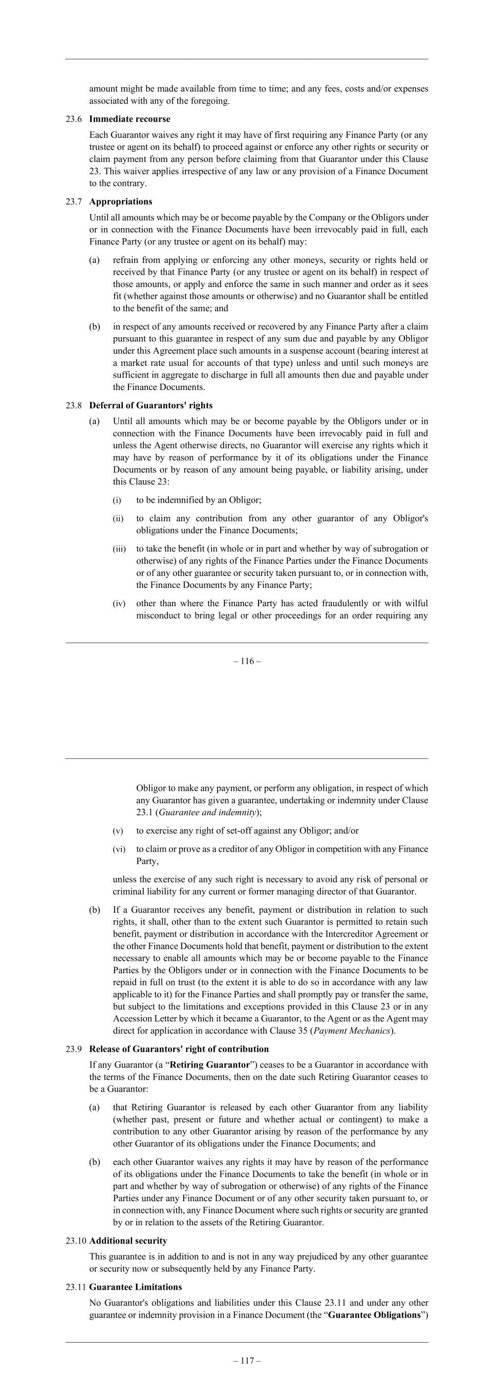 – 116 – amount might be made available from time to time; and any fees, costs and/or expenses associated with any of the foregoing. 23.6 Immediate recourse Each Guarantor waives any right it may have of first requiring any Finance Party (or any trustee or agent on its behalf) to proceed against or enforce any other rights or security or claim payment from any person before claiming from that Guarantor under this Clause 23. This waiver applies irrespective of any law or any provision of a Finance Document to the contrary. 23.7 Appropriations Until all amounts which may be or become payable by the Company or the Obligors under or in connection with the Finance Documents have been irrevocably paid in full, each Finance Party (or any trustee or agent on its behalf) may: (a) refrain from applying or enforcing any other moneys, security or rights held or received by that Finance Party (or any trustee or agent on its behalf) in respect of those amounts, or apply and enforce the same in such manner and order as it sees fit (whether against those amounts or otherwise) and no Guarantor shall be entitled to the benefit of the same; and (b) in respect of any amounts received or recovered by any Finance Party after a claim pursuant to this guarantee in respect of any sum due and payable by any Obligor under this Agreement place such amounts in a suspense account (bearing interest at a market rate usual for accounts of that type) unless and until such moneys are sufficient in aggregate to discharge in full all amounts then due and payable under the Finance Documents. 23.8 Deferral of Guarantors' rights (a) Until all amounts which may be or become payable by the Obligors under or in connection with the Finance Documents have been irrevocably paid in full and unless the Agent otherwise directs, no Guarantor will exercise any rights which it may have by reason of performance by it of its obligations under the Finance Documents or by reason of any amount being payable, or liability arising, under this Clause 23: (i) to be indemnified by an Obligor; (ii) to claim any contribution from any other guarantor of any Obligor's obligations under the Finance Documents; (iii) to take the benefit (in whole or in part and whether by way of subrogation or otherwise) of any rights of the Finance Parties under the Finance Documents or of any other guarantee or security taken pursuant to, or in connection with, the Finance Documents by any Finance Party; (iv) other than where the Finance Party has acted fraudulently or with wilful misconduct to bring legal or other proceedings for an order requiring any – 117 – Obligor to make any payment, or perform any obligation, in respect of which any Guarantor has given a guarantee, undertaking or indemnity under Clause 23.1 (Guarantee and indemnity); (v) to exercise any right of set-off against any Obligor; and/or (vi) to claim or prove as a creditor of any Obligor in competition with any Finance Party, unless the exercise of any such right is necessary to avoid any risk of personal or criminal liability for any current or former managing director of that Guarantor. (b) If a Guarantor receives any benefit, payment or distribution in relation to such rights, it shall, other than to the extent such Guarantor is permitted to retain such benefit, payment or distribution in accordance with the Intercreditor Agreement or the other Finance Documents hold that benefit, payment or distribution to the extent necessary to enable all amounts which may be or become payable to the Finance Parties by the Obligors under or in connection with the Finance Documents to be repaid in full on trust (to the extent it is able to do so in accordance with any law applicable to it) for the Finance Parties and shall promptly pay or transfer the same, but subject to the limitations and exceptions provided in this Clause 23 or in any Accession Letter by which it became a Guarantor, to the Agent or as the Agent may direct for application in accordance with Clause 35 (Payment Mechanics). 23.9 Release of Guarantors' right of contribution If any Guarantor (a “Retiring Guarantor”) ceases to be a Guarantor in accordance with the terms of the Finance Documents, then on the date such Retiring Guarantor ceases to be a Guarantor: (a) that Retiring Guarantor is released by each other Guarantor from any liability (whether past, present or future and whether actual or contingent) to make a contribution to any other Guarantor arising by reason of the performance by any other Guarantor of its obligations under the Finance Documents; and (b) each other Guarantor waives any rights it may have by reason of the performance of its obligations under the Finance Documents to take the benefit (in whole or in part and whether by way of subrogation or otherwise) of any rights of the Finance Parties under any Finance Document or of any other security taken pursuant to, or in connection with, any Finance Document where such rights or security are granted by or in relation to the assets of the Retiring Guarantor. 23.10 Additional security This guarantee is in addition to and is not in any way prejudiced by any other guarantee or security now or subsequently held by any Finance Party. 23.11 Guarantee Limitations No Guarantor's obligations and liabilities under this Clause 23.11 and under any other guarantee or indemnity provision in a Finance Document (the “Guarantee Obligations”)