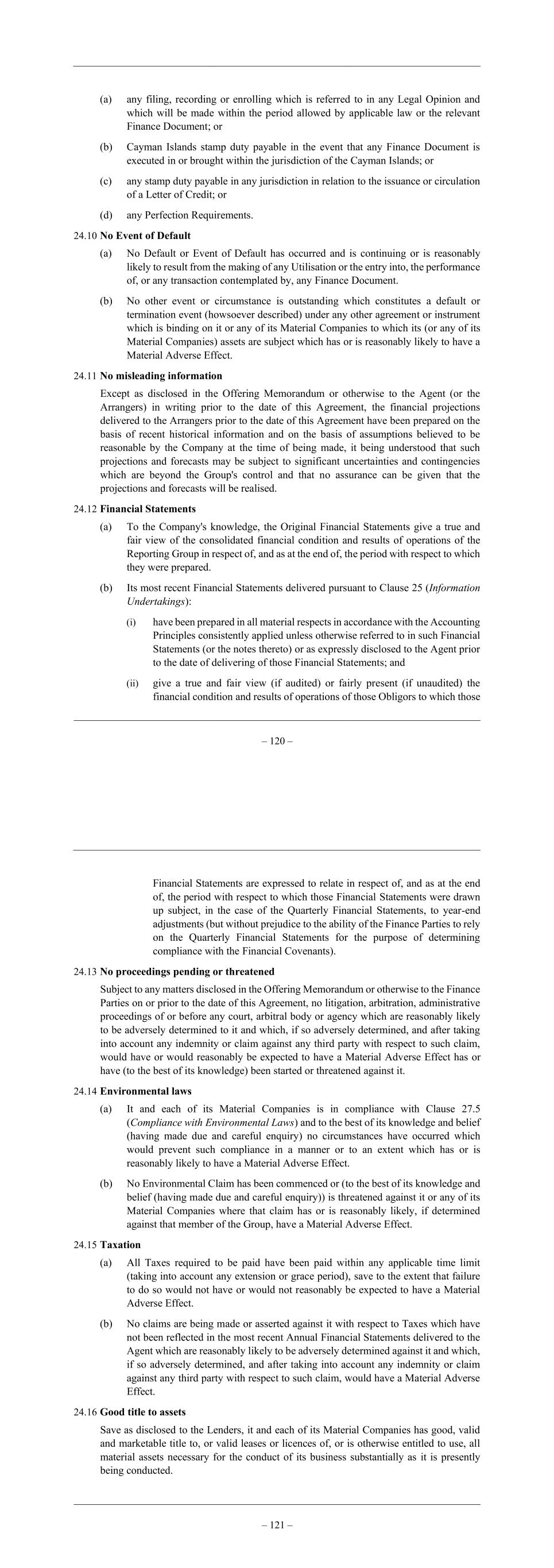 – 120 – (a) any filing, recording or enrolling which is referred to in any Legal Opinion and which will be made within the period allowed by applicable law or the relevant Finance Document; or (b) Cayman Islands stamp duty payable in the event that any Finance Document is executed in or brought within the jurisdiction of the Cayman Islands; or (c) any stamp duty payable in any jurisdiction in relation to the issuance or circulation of a Letter of Credit; or (d) any Perfection Requirements. 24.10 No Event of Default (a) No Default or Event of Default has occurred and is continuing or is reasonably likely to result from the making of any Utilisation or the entry into, the performance of, or any transaction contemplated by, any Finance Document. (b) No other event or circumstance is outstanding which constitutes a default or termination event (howsoever described) under any other agreement or instrument which is binding on it or any of its Material Companies to which its (or any of its Material Companies) assets are subject which has or is reasonably likely to have a Material Adverse Effect. 24.11 No misleading information Except as disclosed in the Offering Memorandum or otherwise to the Agent (or the Arrangers) in writing prior to the date of this Agreement, the financial projections delivered to the Arrangers prior to the date of this Agreement have been prepared on the basis of recent historical information and on the basis of assumptions believed to be reasonable by the Company at the time of being made, it being understood that such projections and forecasts may be subject to significant uncertainties and contingencies which are beyond the Group's control and that no assurance can be given that the projections and forecasts will be realised. 24.12 Financial Statements (a) To the Company's knowledge, the Original Financial Statements give a true and fair view of the consolidated financial condition and results of operations of the Reporting Group in respect of, and as at the end of, the period with respect to which they were prepared. (b) Its most recent Financial Statements delivered pursuant to Clause 25 (Information Undertakings): (i) have been prepared in all material respects in accordance with the Accounting Principles consistently applied unless otherwise referred to in such Financial Statements (or the notes thereto) or as expressly disclosed to the Agent prior to the date of delivering of those Financial Statements; and (ii) give a true and fair view (if audited) or fairly present (if unaudited) the financial condition and results of operations of those Obligors to which those – 121 – Financial Statements are expressed to relate in respect of, and as at the end of, the period with respect to which those Financial Statements were drawn up subject, in the case of the Quarterly Financial Statements, to year-end adjustments (but without prejudice to the ability of the Finance Parties to rely on the Quarterly Financial Statements for the purpose of determining compliance with the Financial Covenants). 24.13 No proceedings pending or threatened Subject to any matters disclosed in the Offering Memorandum or otherwise to the Finance Parties on or prior to the date of this Agreement, no litigation, arbitration, administrative proceedings of or before any court, arbitral body or agency which are reasonably likely to be adversely determined to it and which, if so adversely determined, and after taking into account any indemnity or claim against any third party with respect to such claim, would have or would reasonably be expected to have a Material Adverse Effect has or have (to the best of its knowledge) been started or threatened against it. 24.14 Environmental laws (a) It and each of its Material Companies is in compliance with Clause 27.5 (Compliance with Environmental Laws) and to the best of its knowledge and belief (having made due and careful enquiry) no circumstances have occurred which would prevent such compliance in a manner or to an extent which has or is reasonably likely to have a Material Adverse Effect. (b) No Environmental Claim has been commenced or (to the best of its knowledge and belief (having made due and careful enquiry)) is threatened against it or any of its Material Companies where that claim has or is reasonably likely, if determined against that member of the Group, have a Material Adverse Effect. 24.15 Taxation (a) All Taxes required to be paid have been paid within any applicable time limit (taking into account any extension or grace period), save to the extent that failure to do so would not have or would not reasonably be expected to have a Material Adverse Effect. (b) No claims are being made or asserted against it with respect to Taxes which have not been reflected in the most recent Annual Financial Statements delivered to the Agent which are reasonably likely to be adversely determined against it and which, if so adversely determined, and after taking into account any indemnity or claim against any third party with respect to such claim, would have a Material Adverse Effect. 24.16 Good title to assets Save as disclosed to the Lenders, it and each of its Material Companies has good, valid and marketable title to, or valid leases or licences of, or is otherwise entitled to use, all material assets necessary for the conduct of its business substantially as it is presently being conducted.