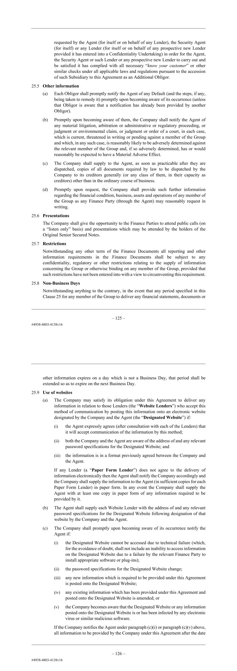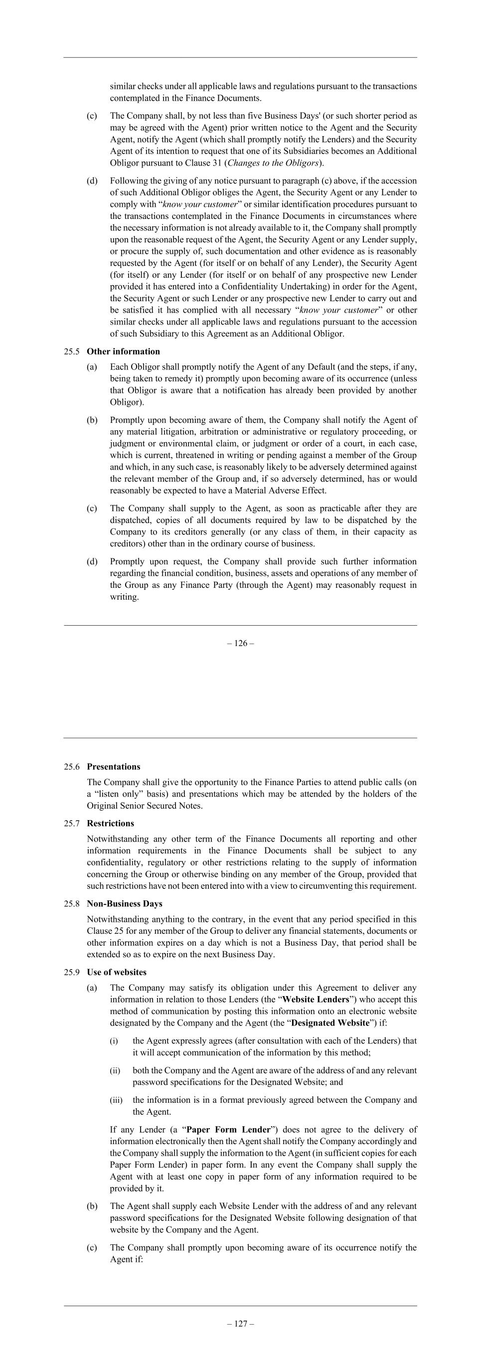 – 126 – similar checks under all applicable laws and regulations pursuant to the transactions contemplated in the Finance Documents. (c) The Company shall, by not less than five Business Days' (or such shorter period as may be agreed with the Agent) prior written notice to the Agent and the Security Agent, notify the Agent (which shall promptly notify the Lenders) and the Security Agent of its intention to request that one of its Subsidiaries becomes an Additional Obligor pursuant to Clause 31 (Changes to the Obligors). (d) Following the giving of any notice pursuant to paragraph (c) above, if the accession of such Additional Obligor obliges the Agent, the Security Agent or any Lender to comply with “know your customer” or similar identification procedures pursuant to the transactions contemplated in the Finance Documents in circumstances where the necessary information is not already available to it, the Company shall promptly upon the reasonable request of the Agent, the Security Agent or any Lender supply, or procure the supply of, such documentation and other evidence as is reasonably requested by the Agent (for itself or on behalf of any Lender), the Security Agent (for itself) or any Lender (for itself or on behalf of any prospective new Lender provided it has entered into a Confidentiality Undertaking) in order for the Agent, the Security Agent or such Lender or any prospective new Lender to carry out and be satisfied it has complied with all necessary “know your customer” or other similar checks under all applicable laws and regulations pursuant to the accession of such Subsidiary to this Agreement as an Additional Obligor. 25.5 Other information (a) Each Obligor shall promptly notify the Agent of any Default (and the steps, if any, being taken to remedy it) promptly upon becoming aware of its occurrence (unless that Obligor is aware that a notification has already been provided by another Obligor). (b) Promptly upon becoming aware of them, the Company shall notify the Agent of any material litigation, arbitration or administrative or regulatory proceeding, or judgment or environmental claim, or judgment or order of a court, in each case, which is current, threatened in writing or pending against a member of the Group and which, in any such case, is reasonably likely to be adversely determined against the relevant member of the Group and, if so adversely determined, has or would reasonably be expected to have a Material Adverse Effect. (c) The Company shall supply to the Agent, as soon as practicable after they are dispatched, copies of all documents required by law to be dispatched by the Company to its creditors generally (or any class of them, in their capacity as creditors) other than in the ordinary course of business. (d) Promptly upon request, the Company shall provide such further information regarding the financial condition, business, assets and operations of any member of the Group as any Finance Party (through the Agent) may reasonably request in writing. – 127 – 25.6 Presentations The Company shall give the opportunity to the Finance Parties to attend public calls (on a “listen only” basis) and presentations which may be attended by the holders of the Original Senior Secured Notes. 25.7 Restrictions Notwithstanding any other term of the Finance Documents all reporting and other information requirements in the Finance Documents shall be subject to any confidentiality, regulatory or other restrictions relating to the supply of information concerning the Group or otherwise binding on any member of the Group, provided that such restrictions have not been entered into with a view to circumventing this requirement. 25.8 Non-Business Days Notwithstanding anything to the contrary, in the event that any period specified in this Clause 25 for any member of the Group to deliver any financial statements, documents or other information expires on a day which is not a Business Day, that period shall be extended so as to expire on the next Business Day. 25.9 Use of websites (a) The Company may satisfy its obligation under this Agreement to deliver any information in relation to those Lenders (the “Website Lenders”) who accept this method of communication by posting this information onto an electronic website designated by the Company and the Agent (the “Designated Website”) if: (i) the Agent expressly agrees (after consultation with each of the Lenders) that it will accept communication of the information by this method; (ii) both the Company and the Agent are aware of the address of and any relevant password specifications for the Designated Website; and (iii) the information is in a format previously agreed between the Company and the Agent. If any Lender (a “Paper Form Lender”) does not agree to the delivery of information electronically then the Agent shall notify the Company accordingly and the Company shall supply the information to the Agent (in sufficient copies for each Paper Form Lender) in paper form. In any event the Company shall supply the Agent with at least one copy in paper form of any information required to be provided by it. (b) The Agent shall supply each Website Lender with the address of and any relevant password specifications for the Designated Website following designation of that website by the Company and the Agent. (c) The Company shall promptly upon becoming aware of its occurrence notify the Agent if: