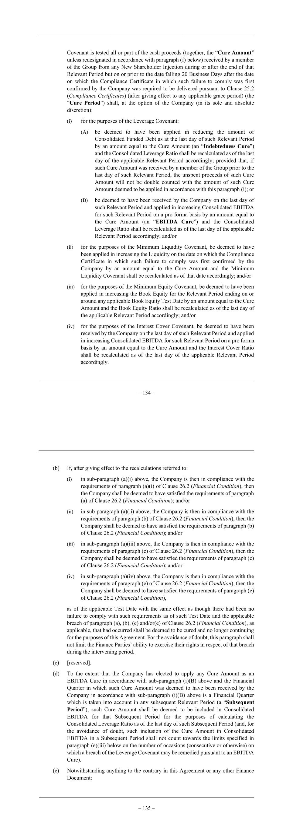 – 134 – Covenant is tested all or part of the cash proceeds (together, the “Cure Amount” unless redesignated in accordance with paragraph (f) below) received by a member of the Group from any New Shareholder Injection during or after the end of that Relevant Period but on or prior to the date falling 20 Business Days after the date on which the Compliance Certificate in which such failure to comply was first confirmed by the Company was required to be delivered pursuant to Clause 25.2 (Compliance Certificates) (after giving effect to any applicable grace period) (the “Cure Period”) shall, at the option of the Company (in its sole and absolute discretion): (i) for the purposes of the Leverage Covenant: (A) be deemed to have been applied in reducing the amount of Consolidated Funded Debt as at the last day of such Relevant Period by an amount equal to the Cure Amount (an “Indebtedness Cure”) and the Consolidated Leverage Ratio shall be recalculated as of the last day of the applicable Relevant Period accordingly; provided that, if such Cure Amount was received by a member of the Group prior to the last day of such Relevant Period, the unspent proceeds of such Cure Amount will not be double counted with the amount of such Cure Amount deemed to be applied in accordance with this paragraph (i); or (B) be deemed to have been received by the Company on the last day of such Relevant Period and applied in increasing Consolidated EBITDA for such Relevant Period on a pro forma basis by an amount equal to the Cure Amount (an “EBITDA Cure”) and the Consolidated Leverage Ratio shall be recalculated as of the last day of the applicable Relevant Period accordingly; and/or (ii) for the purposes of the Minimum Liquidity Covenant, be deemed to have been applied in increasing the Liquidity on the date on which the Compliance Certificate in which such failure to comply was first confirmed by the Company by an amount equal to the Cure Amount and the Minimum Liquidity Covenant shall be recalculated as of that date accordingly; and/or (iii) for the purposes of the Minimum Equity Covenant, be deemed to have been applied in increasing the Book Equity for the Relevant Period ending on or around any applicable Book Equity Test Date by an amount equal to the Cure Amount and the Book Equity Ratio shall be recalculated as of the last day of the applicable Relevant Period accordingly; and/or (iv) for the purposes of the Interest Cover Covenant, be deemed to have been received by the Company on the last day of such Relevant Period and applied in increasing Consolidated EBITDA for such Relevant Period on a pro forma basis by an amount equal to the Cure Amount and the Interest Cover Ratio shall be recalculated as of the last day of the applicable Relevant Period accordingly. – 135 – (b) If, after giving effect to the recalculations referred to: (i) in sub-paragraph (a)(i) above, the Company is then in compliance with the requirements of paragraph (a)(i) of Clause 26.2 (Financial Condition), then the Company shall be deemed to have satisfied the requirements of paragraph (a) of Clause 26.2 (Financial Condition); and/or (ii) in sub-paragraph (a)(ii) above, the Company is then in compliance with the requirements of paragraph (b) of Clause 26.2 (Financial Condition), then the Company shall be deemed to have satisfied the requirements of paragraph (b) of Clause 26.2 (Financial Condition); and/or (iii) in sub-paragraph (a)(iii) above, the Company is then in compliance with the requirements of paragraph (c) of Clause 26.2 (Financial Condition), then the Company shall be deemed to have satisfied the requirements of paragraph (c) of Clause 26.2 (Financial Condition); and/or (iv) in sub-paragraph (a)(iv) above, the Company is then in compliance with the requirements of paragraph (e) of Clause 26.2 (Financial Condition), then the Company shall be deemed to have satisfied the requirements of paragraph (e) of Clause 26.2 (Financial Condition), as of the applicable Test Date with the same effect as though there had been no failure to comply with such requirements as of such Test Date and the applicable breach of paragraph (a), (b), (c) and/or(e) of Clause 26.2 (Financial Condition), as applicable, that had occurred shall be deemed to be cured and no longer continuing for the purposes of this Agreement. For the avoidance of doubt, this paragraph shall not limit the Finance Parties’ ability to exercise their rights in respect of that breach during the intervening period. (c) [reserved]. (d) To the extent that the Company has elected to apply any Cure Amount as an EBITDA Cure in accordance with sub-paragraph (i)(B) above and the Financial Quarter in which such Cure Amount was deemed to have been received by the Company in accordance with sub-paragraph (i)(B) above is a Financial Quarter which is taken into account in any subsequent Relevant Period (a “Subsequent Period”), such Cure Amount shall be deemed to be included in Consolidated EBITDA for that Subsequent Period for the purposes of calculating the Consolidated Leverage Ratio as of the last day of such Subsequent Period (and, for the avoidance of doubt, such inclusion of the Cure Amount in Consolidated EBITDA in a Subsequent Period shall not count towards the limits specified in paragraph (e)(iii) below on the number of occasions (consecutive or otherwise) on which a breach of the Leverage Covenant may be remedied pursuant to an EBITDA Cure). (e) Notwithstanding anything to the contrary in this Agreement or any other Finance Document: