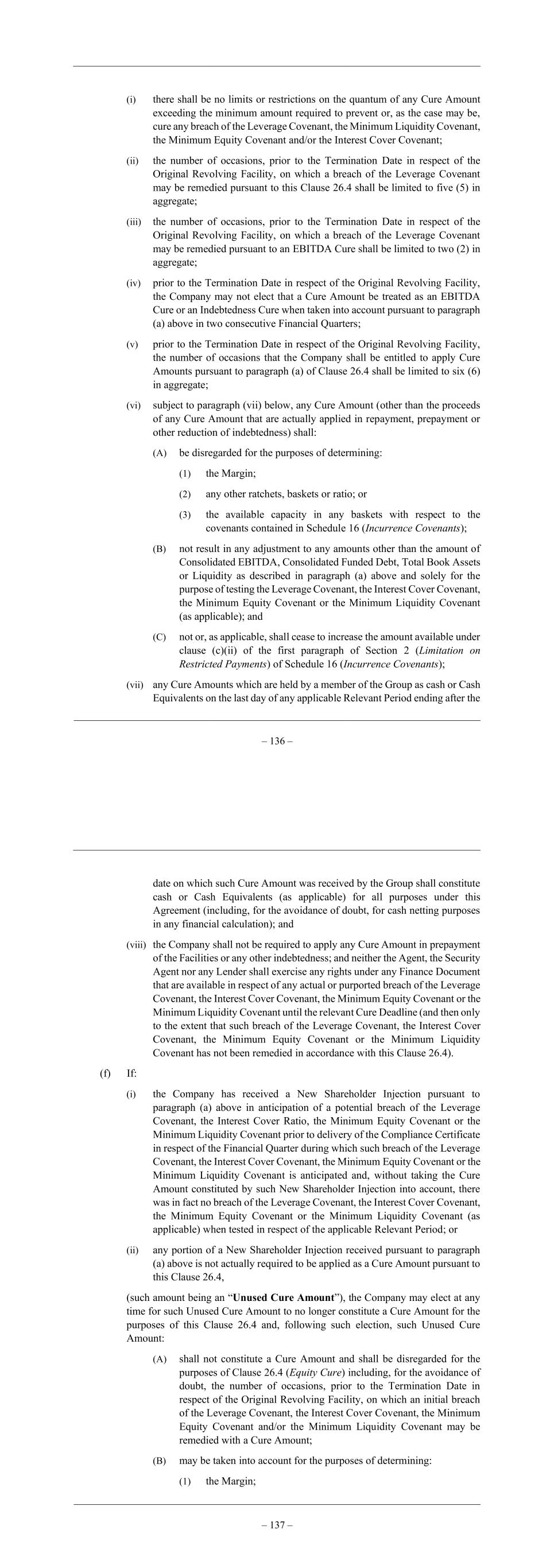 – 136 – (i) there shall be no limits or restrictions on the quantum of any Cure Amount exceeding the minimum amount required to prevent or, as the case may be, cure any breach of the Leverage Covenant, the Minimum Liquidity Covenant, the Minimum Equity Covenant and/or the Interest Cover Covenant; (ii) the number of occasions, prior to the Termination Date in respect of the Original Revolving Facility, on which a breach of the Leverage Covenant may be remedied pursuant to this Clause 26.4 shall be limited to five (5) in aggregate; (iii) the number of occasions, prior to the Termination Date in respect of the Original Revolving Facility, on which a breach of the Leverage Covenant may be remedied pursuant to an EBITDA Cure shall be limited to two (2) in aggregate; (iv) prior to the Termination Date in respect of the Original Revolving Facility, the Company may not elect that a Cure Amount be treated as an EBITDA Cure or an Indebtedness Cure when taken into account pursuant to paragraph (a) above in two consecutive Financial Quarters; (v) prior to the Termination Date in respect of the Original Revolving Facility, the number of occasions that the Company shall be entitled to apply Cure Amounts pursuant to paragraph (a) of Clause 26.4 shall be limited to six (6) in aggregate; (vi) subject to paragraph (vii) below, any Cure Amount (other than the proceeds of any Cure Amount that are actually applied in repayment, prepayment or other reduction of indebtedness) shall: (A) be disregarded for the purposes of determining: (1) the Margin; (2) any other ratchets, baskets or ratio; or (3) the available capacity in any baskets with respect to the covenants contained in Schedule 16 (Incurrence Covenants); (B) not result in any adjustment to any amounts other than the amount of Consolidated EBITDA, Consolidated Funded Debt, Total Book Assets or Liquidity as described in paragraph (a) above and solely for the purpose of testing the Leverage Covenant, the Interest Cover Covenant, the Minimum Equity Covenant or the Minimum Liquidity Covenant (as applicable); and (C) not or, as applicable, shall cease to increase the amount available under clause (c)(ii) of the first paragraph of Section 2 (Limitation on Restricted Payments) of Schedule 16 (Incurrence Covenants); (vii) any Cure Amounts which are held by a member of the Group as cash or Cash Equivalents on the last day of any applicable Relevant Period ending after the – 137 – date on which such Cure Amount was received by the Group shall constitute cash or Cash Equivalents (as applicable) for all purposes under this Agreement (including, for the avoidance of doubt, for cash netting purposes in any financial calculation); and (viii) the Company shall not be required to apply any Cure Amount in prepayment of the Facilities or any other indebtedness; and neither the Agent, the Security Agent nor any Lender shall exercise any rights under any Finance Document that are available in respect of any actual or purported breach of the Leverage Covenant, the Interest Cover Covenant, the Minimum Equity Covenant or the Minimum Liquidity Covenant until the relevant Cure Deadline (and then only to the extent that such breach of the Leverage Covenant, the Interest Cover Covenant, the Minimum Equity Covenant or the Minimum Liquidity Covenant has not been remedied in accordance with this Clause 26.4). (f) If: (i) the Company has received a New Shareholder Injection pursuant to paragraph (a) above in anticipation of a potential breach of the Leverage Covenant, the Interest Cover Ratio, the Minimum Equity Covenant or the Minimum Liquidity Covenant prior to delivery of the Compliance Certificate in respect of the Financial Quarter during which such breach of the Leverage Covenant, the Interest Cover Covenant, the Minimum Equity Covenant or the Minimum Liquidity Covenant is anticipated and, without taking the Cure Amount constituted by such New Shareholder Injection into account, there was in fact no breach of the Leverage Covenant, the Interest Cover Covenant, the Minimum Equity Covenant or the Minimum Liquidity Covenant (as applicable) when tested in respect of the applicable Relevant Period; or (ii) any portion of a New Shareholder Injection received pursuant to paragraph (a) above is not actually required to be applied as a Cure Amount pursuant to this Clause 26.4, (such amount being an “Unused Cure Amount”), the Company may elect at any time for such Unused Cure Amount to no longer constitute a Cure Amount for the purposes of this Clause 26.4 and, following such election, such Unused Cure Amount: (A) shall not constitute a Cure Amount and shall be disregarded for the purposes of Clause 26.4 (Equity Cure) including, for the avoidance of doubt, the number of occasions, prior to the Termination Date in respect of the Original Revolving Facility, on which an initial breach of the Leverage Covenant, the Interest Cover Covenant, the Minimum Equity Covenant and/or the Minimum Liquidity Covenant may be remedied with a Cure Amount; (B) may be taken into account for the purposes of determining: (1) the Margin;