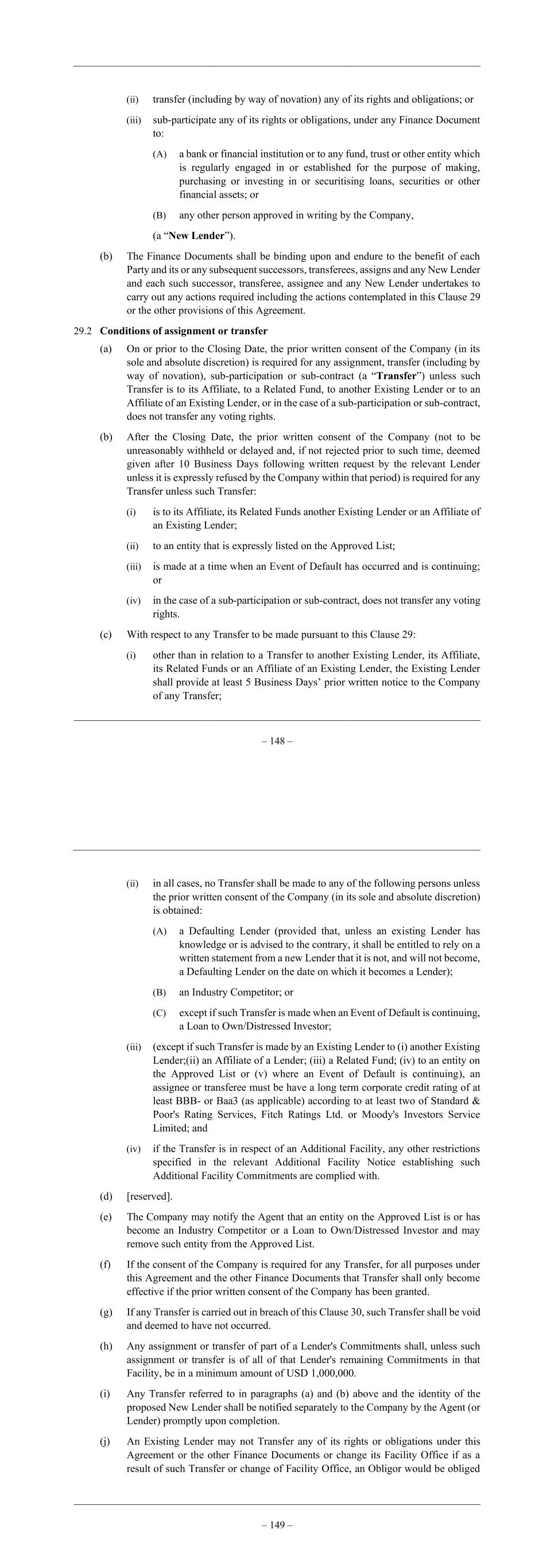 – 148 – (ii) transfer (including by way of novation) any of its rights and obligations; or (iii) sub-participate any of its rights or obligations, under any Finance Document to: (A) a bank or financial institution or to any fund, trust or other entity which is regularly engaged in or established for the purpose of making, purchasing or investing in or securitising loans, securities or other financial assets; or (B) any other person approved in writing by the Company, (a “New Lender”). (b) The Finance Documents shall be binding upon and endure to the benefit of each Party and its or any subsequent successors, transferees, assigns and any New Lender and each such successor, transferee, assignee and any New Lender undertakes to carry out any actions required including the actions contemplated in this Clause 29 or the other provisions of this Agreement. 29.2 Conditions of assignment or transfer (a) On or prior to the Closing Date, the prior written consent of the Company (in its sole and absolute discretion) is required for any assignment, transfer (including by way of novation), sub-participation or sub-contract (a “Transfer”) unless such Transfer is to its Affiliate, to a Related Fund, to another Existing Lender or to an Affiliate of an Existing Lender, or in the case of a sub-participation or sub-contract, does not transfer any voting rights. (b) After the Closing Date, the prior written consent of the Company (not to be unreasonably withheld or delayed and, if not rejected prior to such time, deemed given after 10 Business Days following written request by the relevant Lender unless it is expressly refused by the Company within that period) is required for any Transfer unless such Transfer: (i) is to its Affiliate, its Related Funds another Existing Lender or an Affiliate of an Existing Lender; (ii) to an entity that is expressly listed on the Approved List; (iii) is made at a time when an Event of Default has occurred and is continuing; or (iv) in the case of a sub-participation or sub-contract, does not transfer any voting rights. (c) With respect to any Transfer to be made pursuant to this Clause 29: (i) other than in relation to a Transfer to another Existing Lender, its Affiliate, its Related Funds or an Affiliate of an Existing Lender, the Existing Lender shall provide at least 5 Business Days’ prior written notice to the Company of any Transfer; – 149 – (ii) in all cases, no Transfer shall be made to any of the following persons unless the prior written consent of the Company (in its sole and absolute discretion) is obtained: (A) a Defaulting Lender (provided that, unless an existing Lender has knowledge or is advised to the contrary, it shall be entitled to rely on a written statement from a new Lender that it is not, and will not become, a Defaulting Lender on the date on which it becomes a Lender); (B) an Industry Competitor; or (C) except if such Transfer is made when an Event of Default is continuing, a Loan to Own/Distressed Investor; (iii) (except if such Transfer is made by an Existing Lender to (i) another Existing Lender;(ii) an Affiliate of a Lender; (iii) a Related Fund; (iv) to an entity on the Approved List or (v) where an Event of Default is continuing), an assignee or transferee must be have a long term corporate credit rating of at least BBB- or Baa3 (as applicable) according to at least two of Standard & Poor's Rating Services, Fitch Ratings Ltd. or Moody's Investors Service Limited; and (iv) if the Transfer is in respect of an Additional Facility, any other restrictions specified in the relevant Additional Facility Notice establishing such Additional Facility Commitments are complied with. (d) [reserved]. (e) The Company may notify the Agent that an entity on the Approved List is or has become an Industry Competitor or a Loan to Own/Distressed Investor and may remove such entity from the Approved List. (f) If the consent of the Company is required for any Transfer, for all purposes under this Agreement and the other Finance Documents that Transfer shall only become effective if the prior written consent of the Company has been granted. (g) If any Transfer is carried out in breach of this Clause 30, such Transfer shall be void and deemed to have not occurred. (h) Any assignment or transfer of part of a Lender's Commitments shall, unless such assignment or transfer is of all of that Lender's remaining Commitments in that Facility, be in a minimum amount of USD 1,000,000. (i) Any Transfer referred to in paragraphs (a) and (b) above and the identity of the proposed New Lender shall be notified separately to the Company by the Agent (or Lender) promptly upon completion. (j) An Existing Lender may not Transfer any of its rights or obligations under this Agreement or the other Finance Documents or change its Facility Office if as a result of such Transfer or change of Facility Office, an Obligor would be obliged