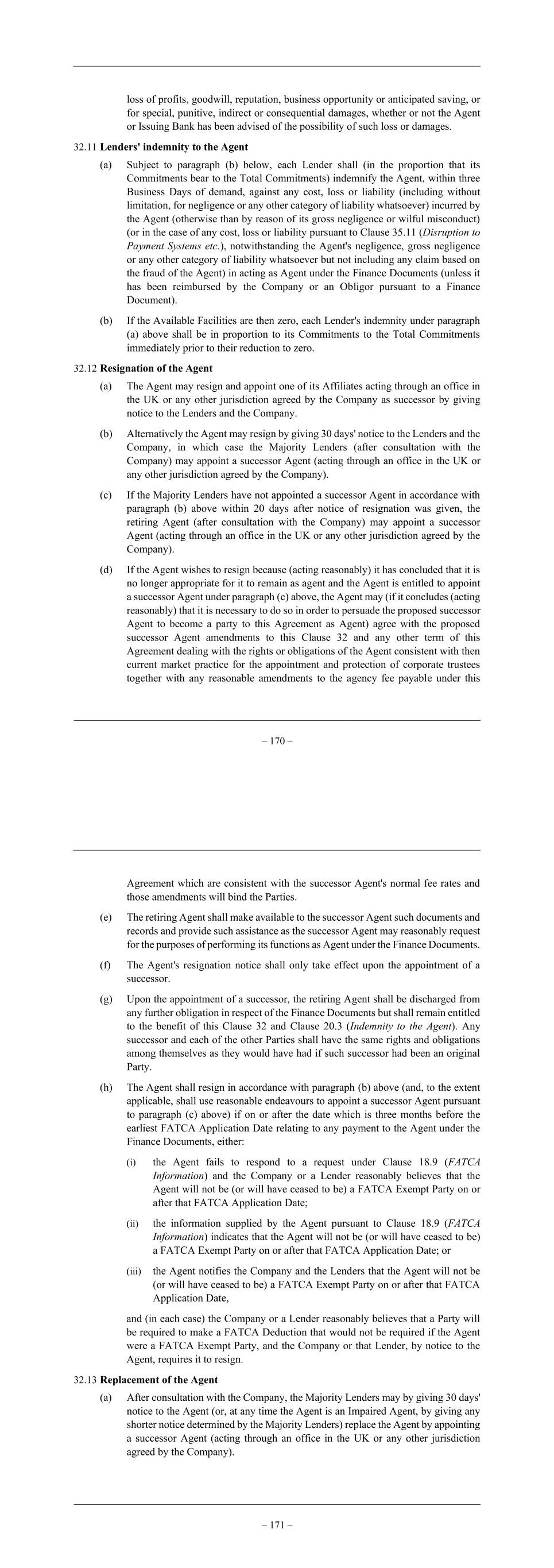 – 170 – loss of profits, goodwill, reputation, business opportunity or anticipated saving, or for special, punitive, indirect or consequential damages, whether or not the Agent or Issuing Bank has been advised of the possibility of such loss or damages. 32.11 Lenders' indemnity to the Agent (a) Subject to paragraph (b) below, each Lender shall (in the proportion that its Commitments bear to the Total Commitments) indemnify the Agent, within three Business Days of demand, against any cost, loss or liability (including without limitation, for negligence or any other category of liability whatsoever) incurred by the Agent (otherwise than by reason of its gross negligence or wilful misconduct) (or in the case of any cost, loss or liability pursuant to Clause 35.11 (Disruption to Payment Systems etc.), notwithstanding the Agent's negligence, gross negligence or any other category of liability whatsoever but not including any claim based on the fraud of the Agent) in acting as Agent under the Finance Documents (unless it has been reimbursed by the Company or an Obligor pursuant to a Finance Document). (b) If the Available Facilities are then zero, each Lender's indemnity under paragraph (a) above shall be in proportion to its Commitments to the Total Commitments immediately prior to their reduction to zero. 32.12 Resignation of the Agent (a) The Agent may resign and appoint one of its Affiliates acting through an office in the UK or any other jurisdiction agreed by the Company as successor by giving notice to the Lenders and the Company. (b) Alternatively the Agent may resign by giving 30 days' notice to the Lenders and the Company, in which case the Majority Lenders (after consultation with the Company) may appoint a successor Agent (acting through an office in the UK or any other jurisdiction agreed by the Company). (c) If the Majority Lenders have not appointed a successor Agent in accordance with paragraph (b) above within 20 days after notice of resignation was given, the retiring Agent (after consultation with the Company) may appoint a successor Agent (acting through an office in the UK or any other jurisdiction agreed by the Company). (d) If the Agent wishes to resign because (acting reasonably) it has concluded that it is no longer appropriate for it to remain as agent and the Agent is entitled to appoint a successor Agent under paragraph (c) above, the Agent may (if it concludes (acting reasonably) that it is necessary to do so in order to persuade the proposed successor Agent to become a party to this Agreement as Agent) agree with the proposed successor Agent amendments to this Clause 32 and any other term of this Agreement dealing with the rights or obligations of the Agent consistent with then current market practice for the appointment and protection of corporate trustees together with any reasonable amendments to the agency fee payable under this – 171 – Agreement which are consistent with the successor Agent's normal fee rates and those amendments will bind the Parties. (e) The retiring Agent shall make available to the successor Agent such documents and records and provide such assistance as the successor Agent may reasonably request for the purposes of performing its functions as Agent under the Finance Documents. (f) The Agent's resignation notice shall only take effect upon the appointment of a successor. (g) Upon the appointment of a successor, the retiring Agent shall be discharged from any further obligation in respect of the Finance Documents but shall remain entitled to the benefit of this Clause 32 and Clause 20.3 (Indemnity to the Agent). Any successor and each of the other Parties shall have the same rights and obligations among themselves as they would have had if such successor had been an original Party. (h) The Agent shall resign in accordance with paragraph (b) above (and, to the extent applicable, shall use reasonable endeavours to appoint a successor Agent pursuant to paragraph (c) above) if on or after the date which is three months before the earliest FATCA Application Date relating to any payment to the Agent under the Finance Documents, either: (i) the Agent fails to respond to a request under Clause 18.9 (FATCA Information) and the Company or a Lender reasonably believes that the Agent will not be (or will have ceased to be) a FATCA Exempt Party on or after that FATCA Application Date; (ii) the information supplied by the Agent pursuant to Clause 18.9 (FATCA Information) indicates that the Agent will not be (or will have ceased to be) a FATCA Exempt Party on or after that FATCA Application Date; or (iii) the Agent notifies the Company and the Lenders that the Agent will not be (or will have ceased to be) a FATCA Exempt Party on or after that FATCA Application Date, and (in each case) the Company or a Lender reasonably believes that a Party will be required to make a FATCA Deduction that would not be required if the Agent were a FATCA Exempt Party, and the Company or that Lender, by notice to the Agent, requires it to resign. 32.13 Replacement of the Agent (a) After consultation with the Company, the Majority Lenders may by giving 30 days' notice to the Agent (or, at any time the Agent is an Impaired Agent, by giving any shorter notice determined by the Majority Lenders) replace the Agent by appointing a successor Agent (acting through an office in the UK or any other jurisdiction agreed by the Company).