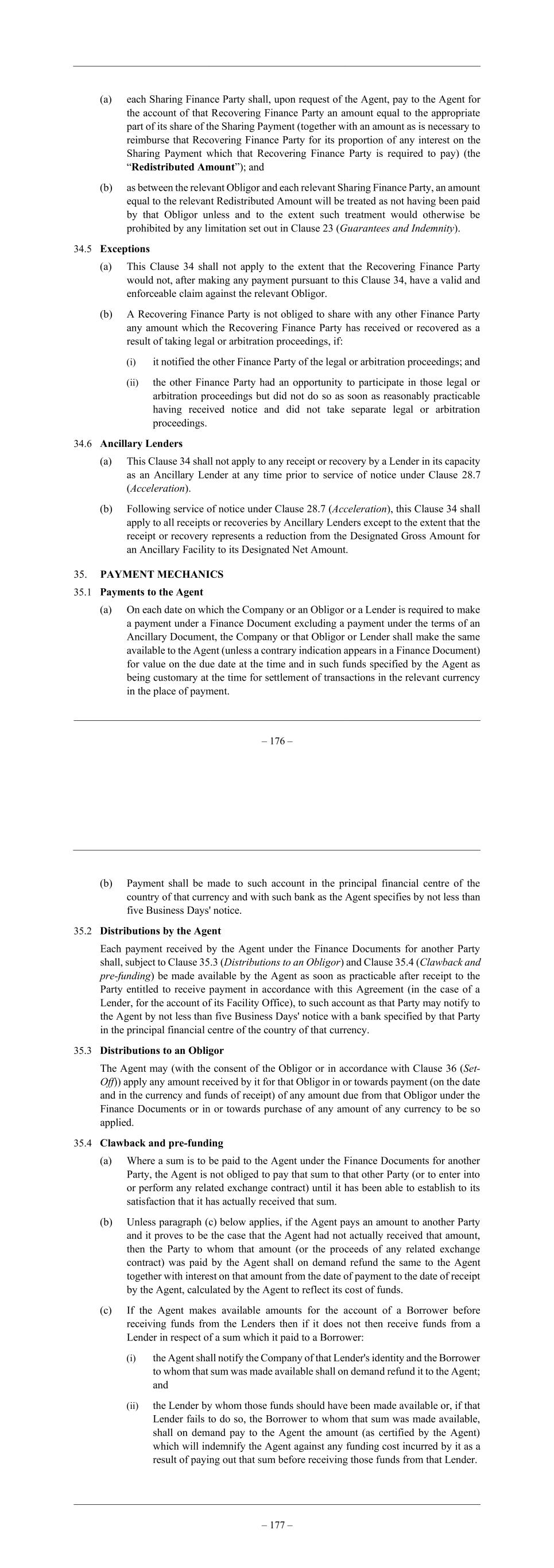 – 176 – (a) each Sharing Finance Party shall, upon request of the Agent, pay to the Agent for the account of that Recovering Finance Party an amount equal to the appropriate part of its share of the Sharing Payment (together with an amount as is necessary to reimburse that Recovering Finance Party for its proportion of any interest on the Sharing Payment which that Recovering Finance Party is required to pay) (the “Redistributed Amount”); and (b) as between the relevant Obligor and each relevant Sharing Finance Party, an amount equal to the relevant Redistributed Amount will be treated as not having been paid by that Obligor unless and to the extent such treatment would otherwise be prohibited by any limitation set out in Clause 23 (Guarantees and Indemnity). 34.5 Exceptions (a) This Clause 34 shall not apply to the extent that the Recovering Finance Party would not, after making any payment pursuant to this Clause 34, have a valid and enforceable claim against the relevant Obligor. (b) A Recovering Finance Party is not obliged to share with any other Finance Party any amount which the Recovering Finance Party has received or recovered as a result of taking legal or arbitration proceedings, if: (i) it notified the other Finance Party of the legal or arbitration proceedings; and (ii) the other Finance Party had an opportunity to participate in those legal or arbitration proceedings but did not do so as soon as reasonably practicable having received notice and did not take separate legal or arbitration proceedings. 34.6 Ancillary Lenders (a) This Clause 34 shall not apply to any receipt or recovery by a Lender in its capacity as an Ancillary Lender at any time prior to service of notice under Clause 28.7 (Acceleration). (b) Following service of notice under Clause 28.7 (Acceleration), this Clause 34 shall apply to all receipts or recoveries by Ancillary Lenders except to the extent that the receipt or recovery represents a reduction from the Designated Gross Amount for an Ancillary Facility to its Designated Net Amount. 35. PAYMENT MECHANICS 35.1 Payments to the Agent (a) On each date on which the Company or an Obligor or a Lender is required to make a payment under a Finance Document excluding a payment under the terms of an Ancillary Document, the Company or that Obligor or Lender shall make the same available to the Agent (unless a contrary indication appears in a Finance Document) for value on the due date at the time and in such funds specified by the Agent as being customary at the time for settlement of transactions in the relevant currency in the place of payment. – 177 – (b) Payment shall be made to such account in the principal financial centre of the country of that currency and with such bank as the Agent specifies by not less than five Business Days' notice. 35.2 Distributions by the Agent Each payment received by the Agent under the Finance Documents for another Party shall, subject to Clause 35.3 (Distributions to an Obligor) and Clause 35.4 (Clawback and pre-funding) be made available by the Agent as soon as practicable after receipt to the Party entitled to receive payment in accordance with this Agreement (in the case of a Lender, for the account of its Facility Office), to such account as that Party may notify to the Agent by not less than five Business Days' notice with a bank specified by that Party in the principal financial centre of the country of that currency. 35.3 Distributions to an Obligor The Agent may (with the consent of the Obligor or in accordance with Clause 36 (Set- Off)) apply any amount received by it for that Obligor in or towards payment (on the date and in the currency and funds of receipt) of any amount due from that Obligor under the Finance Documents or in or towards purchase of any amount of any currency to be so applied. 35.4 Clawback and pre-funding (a) Where a sum is to be paid to the Agent under the Finance Documents for another Party, the Agent is not obliged to pay that sum to that other Party (or to enter into or perform any related exchange contract) until it has been able to establish to its satisfaction that it has actually received that sum. (b) Unless paragraph (c) below applies, if the Agent pays an amount to another Party and it proves to be the case that the Agent had not actually received that amount, then the Party to whom that amount (or the proceeds of any related exchange contract) was paid by the Agent shall on demand refund the same to the Agent together with interest on that amount from the date of payment to the date of receipt by the Agent, calculated by the Agent to reflect its cost of funds. (c) If the Agent makes available amounts for the account of a Borrower before receiving funds from the Lenders then if it does not then receive funds from a Lender in respect of a sum which it paid to a Borrower: (i) the Agent shall notify the Company of that Lender's identity and the Borrower to whom that sum was made available shall on demand refund it to the Agent; and (ii) the Lender by whom those funds should have been made available or, if that Lender fails to do so, the Borrower to whom that sum was made available, shall on demand pay to the Agent the amount (as certified by the Agent) which will indemnify the Agent against any funding cost incurred by it as a result of paying out that sum before receiving those funds from that Lender.