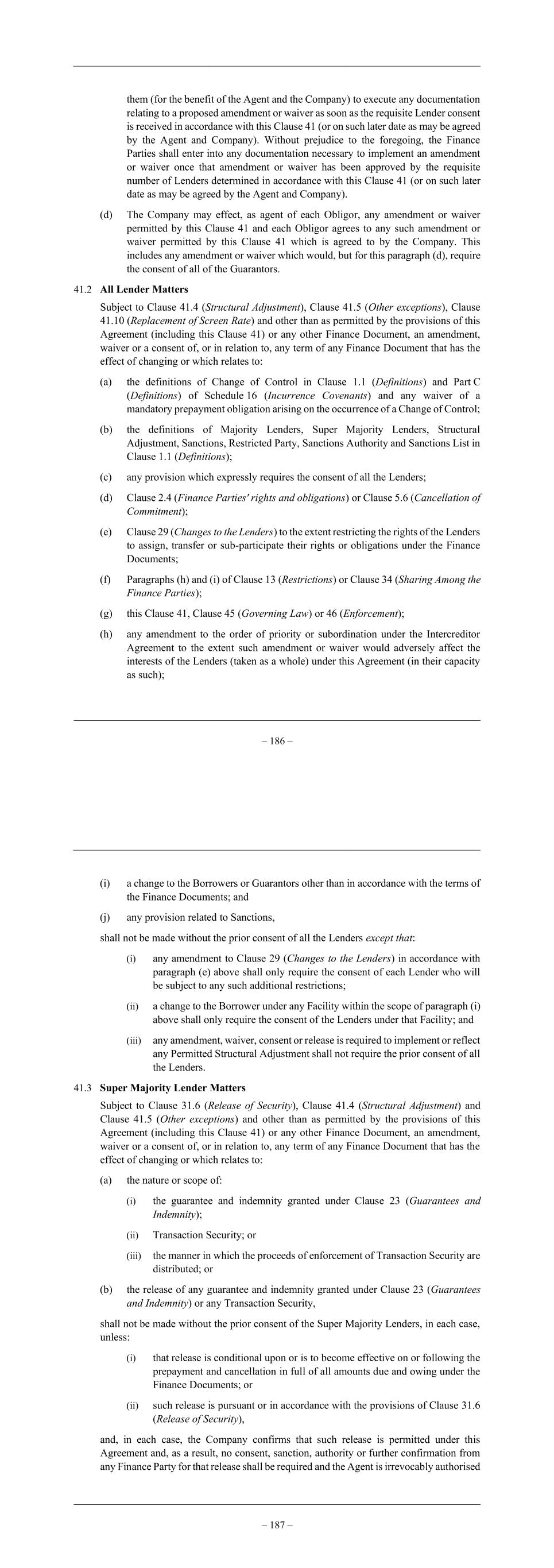 – 190 – (g) Notwithstanding anything to the contrary, no amendment or waiver of this Agreement or any other Finance Document made or effected in accordance with the provisions of Clause 2.2 (Additional Facilities) or Clause 2.3 (Increase) shall require the consent, sanction, authority or further confirmation of any Finance Party (unless expressly required under the provisions of such Clauses) and shall be binding on all Parties. (h) Any term of the Finance Documents (other than any Fee Letter or any Ancillary Document) may be amended or waived by the Company and the Agent (or, if applicable, the Security Agent) without the consent, sanction, authority or further confirmation of any other Party if that amendment or waiver is: (i) a Permitted Structural Adjustment; (ii) to cure defects or omissions, resolve ambiguities or inconsistencies (including any manifest error) or reflect changes of a minor, technical or administrative nature; (iii) consequential on, incidental to, or required to implement an approved amendment, waiver, consent or release provided that such waiver or amendment does not adversely affect the interests of the other Lenders whose consent is not required for the applicable amendment; or (iv) otherwise for the benefit of all of the Lenders. (i) An amendment or waiver which relates to the specific rights or obligations of the Agent, the Security Agent, the Arrangers, any Issuing Bank or any Ancillary Lender (each in their capacity as such) may not be effected without the consent of the Agent, the Security Agent, the Arrangers, the relevant Issuing Bank or the relevant Ancillary Lender (as applicable) provided that nothing in this provision shall entitle any Party to refuse its consent to any release of a guarantee or Security which would otherwise be permitted under Clause 41.9 (Implementation of Additional Facilities and other Permitted Structural Adjustments) or another provision of the Finance Documents. (j) Any amendment or waiver which relates only to the provisions governing transfers, assignments or sub-participations by Lenders and which makes such provisions more restrictive for any of the Lenders shall only require the consent of each Lender who will be subject to the resulting additional restrictions. (k) If the Company or the Agent (at the request of the Company) has requested the Finance Parties (or any of them) to give a consent in relation to, or to agree a release, waiver or amendment of, any provision of the Finance Documents or other vote of Lenders under the terms of this Agreement, then in the case of: (i) any Finance Party who has delivered a consent or agreement to such request, on and from the date of notification thereof to the Agent; and (ii) any other Non-Consenting Lender and its applicable participation (without prejudice to paragraph (i) above) on and from the date such Lender is – 191 – replaced in accordance with the provisions of Clause 41.7 (Replacement of Lender), a consent or agreement to such request shall be treated and deemed as having been made by such Finance Party and Non-Consenting Lender and received by the Agent, and (unless otherwise agreed by the Company or stipulated by the relevant Lender), subject to paragraph (m) below, such consent or agreement shall from such time be irrevocable and binding on such Finance Party and Non-Consenting Lender (as applicable) and any permitted assignee, transferee or counterparty to a sub- participation. (l) Any Finance Party (not being an Excluded Lender) or its permitted assignee or transferee that has expressly not consented or not agreed to a request for an amendment, waiver, consent or release shall always have the right to change or revoke their decision and subsequently deliver to the Agent a consent or agreement to such request at any time during the period for which the vote and request process is open for consents and acceptances as notified by the Agent to such Lender (and subject to any extension of such period as agreed between the Company and the Agent). (m) At the request of the Company or the Agent, the Agent and the Company will promptly enter into any amendments to this Agreement necessary to ensure that the terms of Schedule 15 (Information Undertakings), Schedule 16 (Incurrence Covenants) or Schedule 17 (Events of Default) accurately reflect the equivalent terms of the Original Senior Secured Notes (subject to any agreed changes between the Company and the Agent) as set out in the Original Senior Secured Notes Indenture in its original form (any such change, a “Conforming Covenant Change”). The Agent is authorised and instructed by each Finance Party hereto (without any further consent, sanction, authority or further confirmation from them) to enter into such documentation as is reasonably required to make any such Conforming Covenant Changes and shall promptly enter into such documentation on the request and at the cost of the Agent or the Company. The Company (or the Agent on its behalf) shall promptly inform the Finance Parties of such Conforming Covenant Changes. 41.6 Non-Responding Lender (Snooze you lose) (a) If any Lender fails to accept or reject a request for a consent, waiver or amendment of or in relation to any of the terms of any Finance Document or other vote of Lenders under the terms of this Agreement within 15 Business Days (unless the Company and the Agent agree to a longer time period in relation to any request including where such longer time period may be agreed following the submission of such request) of that request being made (such Lender being a “Non-Responding Lender”); or (b) any Lender fails to assist with any step required to implement the Company's right to prepay or to replace that Lender pursuant to and as contemplated by Clause 41.7