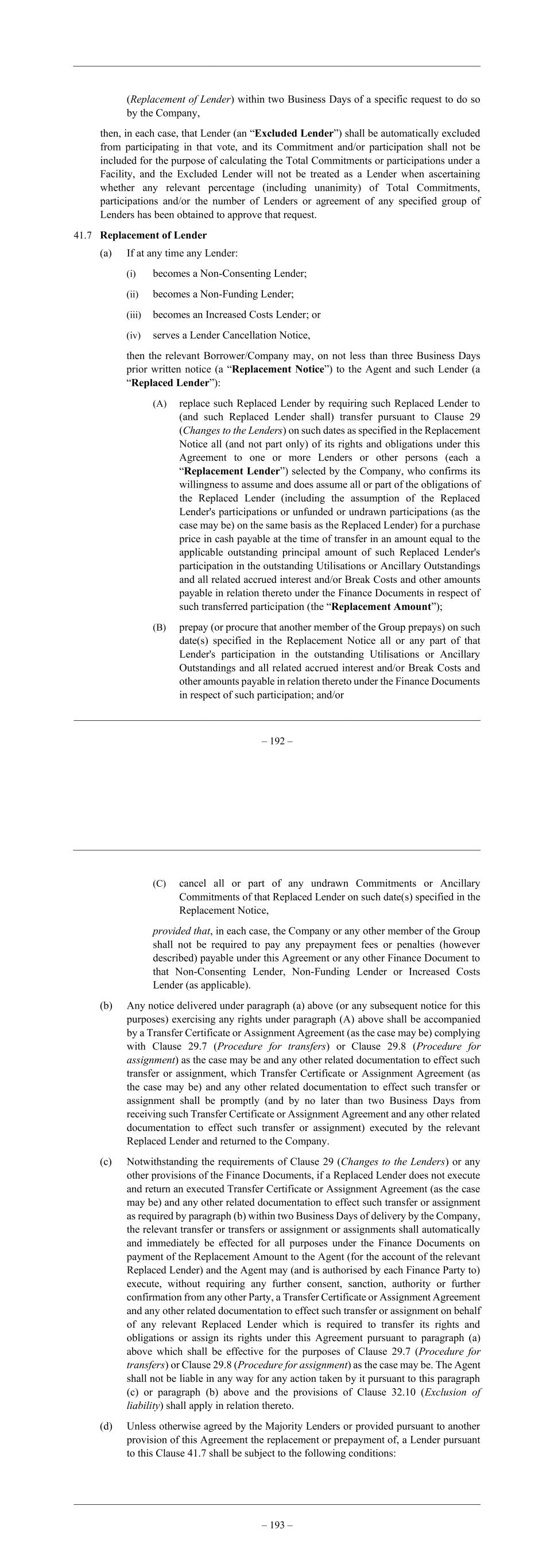 – 192 – (Replacement of Lender) within two Business Days of a specific request to do so by the Company, then, in each case, that Lender (an “Excluded Lender”) shall be automatically excluded from participating in that vote, and its Commitment and/or participation shall not be included for the purpose of calculating the Total Commitments or participations under a Facility, and the Excluded Lender will not be treated as a Lender when ascertaining whether any relevant percentage (including unanimity) of Total Commitments, participations and/or the number of Lenders or agreement of any specified group of Lenders has been obtained to approve that request. 41.7 Replacement of Lender (a) If at any time any Lender: (i) becomes a Non-Consenting Lender; (ii) becomes a Non-Funding Lender; (iii) becomes an Increased Costs Lender; or (iv) serves a Lender Cancellation Notice, then the relevant Borrower/Company may, on not less than three Business Days prior written notice (a “Replacement Notice”) to the Agent and such Lender (a “Replaced Lender”): (A) replace such Replaced Lender by requiring such Replaced Lender to (and such Replaced Lender shall) transfer pursuant to Clause 29 (Changes to the Lenders) on such dates as specified in the Replacement Notice all (and not part only) of its rights and obligations under this Agreement to one or more Lenders or other persons (each a “Replacement Lender”) selected by the Company, who confirms its willingness to assume and does assume all or part of the obligations of the Replaced Lender (including the assumption of the Replaced Lender's participations or unfunded or undrawn participations (as the case may be) on the same basis as the Replaced Lender) for a purchase price in cash payable at the time of transfer in an amount equal to the applicable outstanding principal amount of such Replaced Lender's participation in the outstanding Utilisations or Ancillary Outstandings and all related accrued interest and/or Break Costs and other amounts payable in relation thereto under the Finance Documents in respect of such transferred participation (the “Replacement Amount”); (B) prepay (or procure that another member of the Group prepays) on such date(s) specified in the Replacement Notice all or any part of that Lender's participation in the outstanding Utilisations or Ancillary Outstandings and all related accrued interest and/or Break Costs and other amounts payable in relation thereto under the Finance Documents in respect of such participation; and/or – 193 – (C) cancel all or part of any undrawn Commitments or Ancillary Commitments of that Replaced Lender on such date(s) specified in the Replacement Notice, provided that, in each case, the Company or any other member of the Group shall not be required to pay any prepayment fees or penalties (however described) payable under this Agreement or any other Finance Document to that Non-Consenting Lender, Non-Funding Lender or Increased Costs Lender (as applicable). (b) Any notice delivered under paragraph (a) above (or any subsequent notice for this purposes) exercising any rights under paragraph (A) above shall be accompanied by a Transfer Certificate or Assignment Agreement (as the case may be) complying with Clause 29.7 (Procedure for transfers) or Clause 29.8 (Procedure for assignment) as the case may be and any other related documentation to effect such transfer or assignment, which Transfer Certificate or Assignment Agreement (as the case may be) and any other related documentation to effect such transfer or assignment shall be promptly (and by no later than two Business Days from receiving such Transfer Certificate or Assignment Agreement and any other related documentation to effect such transfer or assignment) executed by the relevant Replaced Lender and returned to the Company. (c) Notwithstanding the requirements of Clause 29 (Changes to the Lenders) or any other provisions of the Finance Documents, if a Replaced Lender does not execute and return an executed Transfer Certificate or Assignment Agreement (as the case may be) and any other related documentation to effect such transfer or assignment as required by paragraph (b) within two Business Days of delivery by the Company, the relevant transfer or transfers or assignment or assignments shall automatically and immediately be effected for all purposes under the Finance Documents on payment of the Replacement Amount to the Agent (for the account of the relevant Replaced Lender) and the Agent may (and is authorised by each Finance Party to) execute, without requiring any further consent, sanction, authority or further confirmation from any other Party, a Transfer Certificate or Assignment Agreement and any other related documentation to effect such transfer or assignment on behalf of any relevant Replaced Lender which is required to transfer its rights and obligations or assign its rights under this Agreement pursuant to paragraph (a) above which shall be effective for the purposes of Clause 29.7 (Procedure for transfers) or Clause 29.8 (Procedure for assignment) as the case may be. The Agent shall not be liable in any way for any action taken by it pursuant to this paragraph (c) or paragraph (b) above and the provisions of Clause 32.10 (Exclusion of liability) shall apply in relation thereto. (d) Unless otherwise agreed by the Majority Lenders or provided pursuant to another provision of this Agreement the replacement or prepayment of, a Lender pursuant to this Clause 41.7 shall be subject to the following conditions: