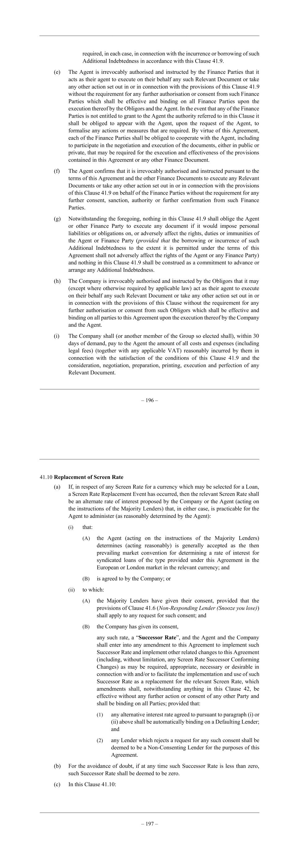 – 196 – required, in each case, in connection with the incurrence or borrowing of such Additional Indebtedness in accordance with this Clause 41.9. (e) The Agent is irrevocably authorised and instructed by the Finance Parties that it acts as their agent to execute on their behalf any such Relevant Document or take any other action set out in or in connection with the provisions of this Clause 41.9 without the requirement for any further authorisation or consent from such Finance Parties which shall be effective and binding on all Finance Parties upon the execution thereof by the Obligors and the Agent. In the event that any of the Finance Parties is not entitled to grant to the Agent the authority referred to in this Clause it shall be obliged to appear with the Agent, upon the request of the Agent, to formalise any actions or measures that are required. By virtue of this Agreement, each of the Finance Parties shall be obliged to cooperate with the Agent, including to participate in the negotiation and execution of the documents, either in public or private, that may be required for the execution and effectiveness of the provisions contained in this Agreement or any other Finance Document. (f) The Agent confirms that it is irrevocably authorised and instructed pursuant to the terms of this Agreement and the other Finance Documents to execute any Relevant Documents or take any other action set out in or in connection with the provisions of this Clause 41.9 on behalf of the Finance Parties without the requirement for any further consent, sanction, authority or further confirmation from such Finance Parties. (g) Notwithstanding the foregoing, nothing in this Clause 41.9 shall oblige the Agent or other Finance Party to execute any document if it would impose personal liabilities or obligations on, or adversely affect the rights, duties or immunities of the Agent or Finance Party (provided that the borrowing or incurrence of such Additional Indebtedness to the extent it is permitted under the terms of this Agreement shall not adversely affect the rights of the Agent or any Finance Party) and nothing in this Clause 41.9 shall be construed as a commitment to advance or arrange any Additional Indebtedness. (h) The Company is irrevocably authorised and instructed by the Obligors that it may (except where otherwise required by applicable law) act as their agent to execute on their behalf any such Relevant Document or take any other action set out in or in connection with the provisions of this Clause without the requirement for any further authorisation or consent from such Obligors which shall be effective and binding on all parties to this Agreement upon the execution thereof by the Company and the Agent. (i) The Company shall (or another member of the Group so elected shall), within 30 days of demand, pay to the Agent the amount of all costs and expenses (including legal fees) (together with any applicable VAT) reasonably incurred by them in connection with the satisfaction of the conditions of this Clause 41.9 and the consideration, negotiation, preparation, printing, execution and perfection of any Relevant Document. – 197 – 41.10 Replacement of Screen Rate (a) If, in respect of any Screen Rate for a currency which may be selected for a Loan, a Screen Rate Replacement Event has occurred, then the relevant Screen Rate shall be an alternate rate of interest proposed by the Company or the Agent (acting on the instructions of the Majority Lenders) that, in either case, is practicable for the Agent to administer (as reasonably determined by the Agent): (i) that: (A) the Agent (acting on the instructions of the Majority Lenders) determines (acting reasonably) is generally accepted as the then prevailing market convention for determining a rate of interest for syndicated loans of the type provided under this Agreement in the European or London market in the relevant currency; and (B) is agreed to by the Company; or (ii) to which: (A) the Majority Lenders have given their consent, provided that the provisions of Clause 41.6 (Non-Responding Lender (Snooze you lose)) shall apply to any request for such consent; and (B) the Company has given its consent, any such rate, a “Successor Rate”, and the Agent and the Company shall enter into any amendment to this Agreement to implement such Successor Rate and implement other related changes to this Agreement (including, without limitation, any Screen Rate Successor Conforming Changes) as may be required, appropriate, necessary or desirable in connection with and/or to facilitate the implementation and use of such Successor Rate as a replacement for the relevant Screen Rate, which amendments shall, notwithstanding anything in this Clause 42, be effective without any further action or consent of any other Party and shall be binding on all Parties; provided that: (1) any alternative interest rate agreed to pursuant to paragraph (i) or (ii) above shall be automatically binding on a Defaulting Lender; and (2) any Lender which rejects a request for any such consent shall be deemed to be a Non-Consenting Lender for the purposes of this Agreement. (b) For the avoidance of doubt, if at any time such Successor Rate is less than zero, such Successor Rate shall be deemed to be zero. (c) In this Clause 41.10: