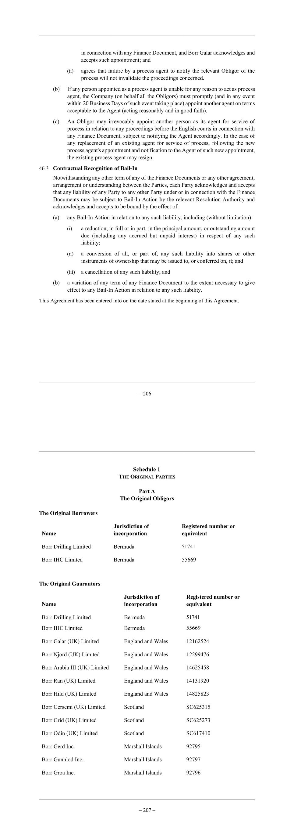 – 206 – in connection with any Finance Document, and Borr Galar acknowledges and accepts such appointment; and (ii) agrees that failure by a process agent to notify the relevant Obligor of the process will not invalidate the proceedings concerned. (b) If any person appointed as a process agent is unable for any reason to act as process agent, the Company (on behalf all the Obligors) must promptly (and in any event within 20 Business Days of such event taking place) appoint another agent on terms acceptable to the Agent (acting reasonably and in good faith). (c) An Obligor may irrevocably appoint another person as its agent for service of process in relation to any proceedings before the English courts in connection with any Finance Document, subject to notifying the Agent accordingly. In the case of any replacement of an existing agent for service of process, following the new process agent's appointment and notification to the Agent of such new appointment, the existing process agent may resign. 46.3 Contractual Recognition of Bail-In Notwithstanding any other term of any of the Finance Documents or any other agreement, arrangement or understanding between the Parties, each Party acknowledges and accepts that any liability of any Party to any other Party under or in connection with the Finance Documents may be subject to Bail-In Action by the relevant Resolution Authority and acknowledges and accepts to be bound by the effect of: (a) any Bail-In Action in relation to any such liability, including (without limitation): (i) a reduction, in full or in part, in the principal amount, or outstanding amount due (including any accrued but unpaid interest) in respect of any such liability; (ii) a conversion of all, or part of, any such liability into shares or other instruments of ownership that may be issued to, or conferred on, it; and (iii) a cancellation of any such liability; and (b) a variation of any term of any Finance Document to the extent necessary to give effect to any Bail-In Action in relation to any such liability. This Agreement has been entered into on the date stated at the beginning of this Agreement. – 207 – Schedule 1 THE ORIGINAL PARTIES Part A The Original Obligors The Original Borrowers Name Jurisdiction of incorporation Registered number or equivalent Borr Drilling Limited Bermuda 51741 Borr IHC Limited Bermuda 55669 The Original Guarantors Name Jurisdiction of incorporation Registered number or equivalent Borr Drilling Limited Borr IHC Limited Bermuda Bermuda 51741 55669 Borr Galar (UK) Limited England and Wales 12162524 Borr Njord (UK) Limited England and Wales 12299476 Borr Arabia III (UK) Limited England and Wales 14625458 Borr Ran (UK) Limited England and Wales 14131920 Borr Hild (UK) Limited England and Wales 14825823 Borr Gersemi (UK) Limited Scotland SC625315 Borr Grid (UK) Limited Scotland SC625273 Borr Odin (UK) Limited Scotland SC617410 Borr Gerd Inc. Marshall Islands 92795 Borr Gunnlod Inc. Marshall Islands 92797 Borr Groa Inc. Marshall Islands 92796
