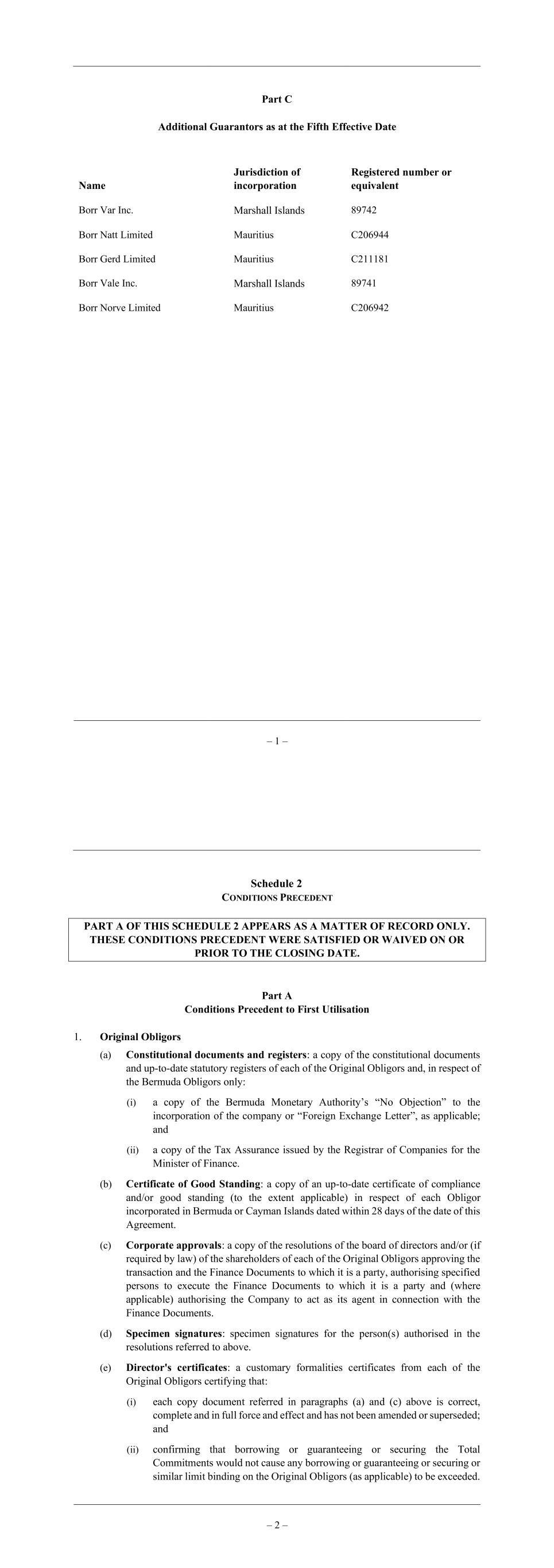 – 1 – Part C Additional Guarantors as at the Fifth Effective Date Name Jurisdiction of incorporation Registered number or equivalent Borr Var Inc. Marshall Islands 89742 Borr Natt Limited Mauritius C206944 Borr Gerd Limited Mauritius C211181 Borr Vale Inc. Marshall Islands 89741 Borr Norve Limited Mauritius C206942 – 2 – Schedule 2 CONDITIONS PRECEDENT PART A OF THIS SCHEDULE 2 APPEARS AS A MATTER OF RECORD ONLY. THESE CONDITIONS PRECEDENT WERE SATISFIED OR WAIVED ON OR PRIOR TO THE CLOSING DATE. Part A Conditions Precedent to First Utilisation 1. Original Obligors (a) Constitutional documents and registers: a copy of the constitutional documents and up-to-date statutory registers of each of the Original Obligors and, in respect of the Bermuda Obligors only: (i) a copy of the Bermuda Monetary Authority’s “No Objection” to the incorporation of the company or “Foreign Exchange Letter”, as applicable; and (ii) a copy of the Tax Assurance issued by the Registrar of Companies for the Minister of Finance. (b) Certificate of Good Standing: a copy of an up-to-date certificate of compliance and/or good standing (to the extent applicable) in respect of each Obligor incorporated in Bermuda or Cayman Islands dated within 28 days of the date of this Agreement. (c) Corporate approvals: a copy of the resolutions of the board of directors and/or (if required by law) of the shareholders of each of the Original Obligors approving the transaction and the Finance Documents to which it is a party, authorising specified persons to execute the Finance Documents to which it is a party and (where applicable) authorising the Company to act as its agent in connection with the Finance Documents. (d) Specimen signatures: specimen signatures for the person(s) authorised in the resolutions referred to above. (e) Director's certificates: a customary formalities certificates from each of the Original Obligors certifying that: (i) each copy document referred in paragraphs (a) and (c) above is correct, complete and in full force and effect and has not been amended or superseded; and (ii) confirming that borrowing or guaranteeing or securing the Total Commitments would not cause any borrowing or guaranteeing or securing or similar limit binding on the Original Obligors (as applicable) to be exceeded.