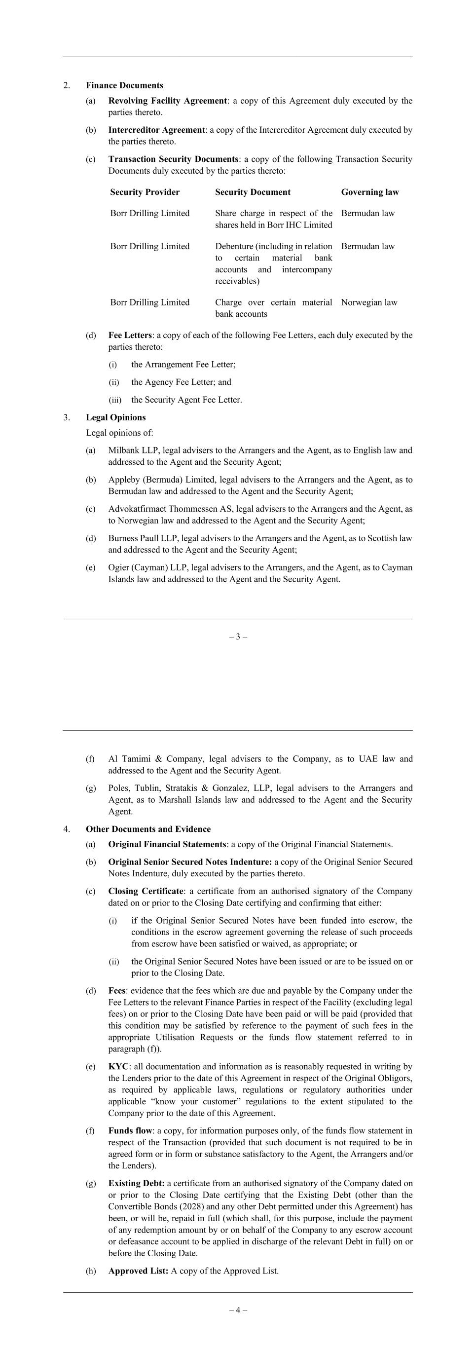 – 3 – 2. Finance Documents (a) Revolving Facility Agreement: a copy of this Agreement duly executed by the parties thereto. (b) Intercreditor Agreement: a copy of the Intercreditor Agreement duly executed by the parties thereto. (c) Transaction Security Documents: a copy of the following Transaction Security Documents duly executed by the parties thereto: Security Provider Security Document Governing law Borr Drilling Limited Share charge in respect of the shares held in Borr IHC Limited Bermudan law Borr Drilling Limited Debenture (including in relation to certain material bank accounts and intercompany receivables) Bermudan law Borr Drilling Limited Charge over certain material bank accounts Norwegian law (d) Fee Letters: a copy of each of the following Fee Letters, each duly executed by the parties thereto: (i) the Arrangement Fee Letter; (ii) the Agency Fee Letter; and (iii) the Security Agent Fee Letter. 3. Legal Opinions Legal opinions of: (a) Milbank LLP, legal advisers to the Arrangers and the Agent, as to English law and addressed to the Agent and the Security Agent; (b) Appleby (Bermuda) Limited, legal advisers to the Arrangers and the Agent, as to Bermudan law and addressed to the Agent and the Security Agent; (c) Advokatfirmaet Thommessen AS, legal advisers to the Arrangers and the Agent, as to Norwegian law and addressed to the Agent and the Security Agent; (d) Burness Paull LLP, legal advisers to the Arrangers and the Agent, as to Scottish law and addressed to the Agent and the Security Agent; (e) Ogier (Cayman) LLP, legal advisers to the Arrangers, and the Agent, as to Cayman Islands law and addressed to the Agent and the Security Agent. – 4 – (f) Al Tamimi & Company, legal advisers to the Company, as to UAE law and addressed to the Agent and the Security Agent. (g) Poles, Tublin, Stratakis & Gonzalez, LLP, legal advisers to the Arrangers and Agent, as to Marshall Islands law and addressed to the Agent and the Security Agent. 4. Other Documents and Evidence (a) Original Financial Statements: a copy of the Original Financial Statements. (b) Original Senior Secured Notes Indenture: a copy of the Original Senior Secured Notes Indenture, duly executed by the parties thereto. (c) Closing Certificate: a certificate from an authorised signatory of the Company dated on or prior to the Closing Date certifying and confirming that either: (i) if the Original Senior Secured Notes have been funded into escrow, the conditions in the escrow agreement governing the release of such proceeds from escrow have been satisfied or waived, as appropriate; or (ii) the Original Senior Secured Notes have been issued or are to be issued on or prior to the Closing Date. (d) Fees: evidence that the fees which are due and payable by the Company under the Fee Letters to the relevant Finance Parties in respect of the Facility (excluding legal fees) on or prior to the Closing Date have been paid or will be paid (provided that this condition may be satisfied by reference to the payment of such fees in the appropriate Utilisation Requests or the funds flow statement referred to in paragraph (f)). (e) KYC: all documentation and information as is reasonably requested in writing by the Lenders prior to the date of this Agreement in respect of the Original Obligors, as required by applicable laws, regulations or regulatory authorities under applicable “know your customer” regulations to the extent stipulated to the Company prior to the date of this Agreement. (f) Funds flow: a copy, for information purposes only, of the funds flow statement in respect of the Transaction (provided that such document is not required to be in agreed form or in form or substance satisfactory to the Agent, the Arrangers and/or the Lenders). (g) Existing Debt: a certificate from an authorised signatory of the Company dated on or prior to the Closing Date certifying that the Existing Debt (other than the Convertible Bonds (2028) and any other Debt permitted under this Agreement) has been, or will be, repaid in full (which shall, for this purpose, include the payment of any redemption amount by or on behalf of the Company to any escrow account or defeasance account to be applied in discharge of the relevant Debt in full) on or before the Closing Date. (h) Approved List: A copy of the Approved List.