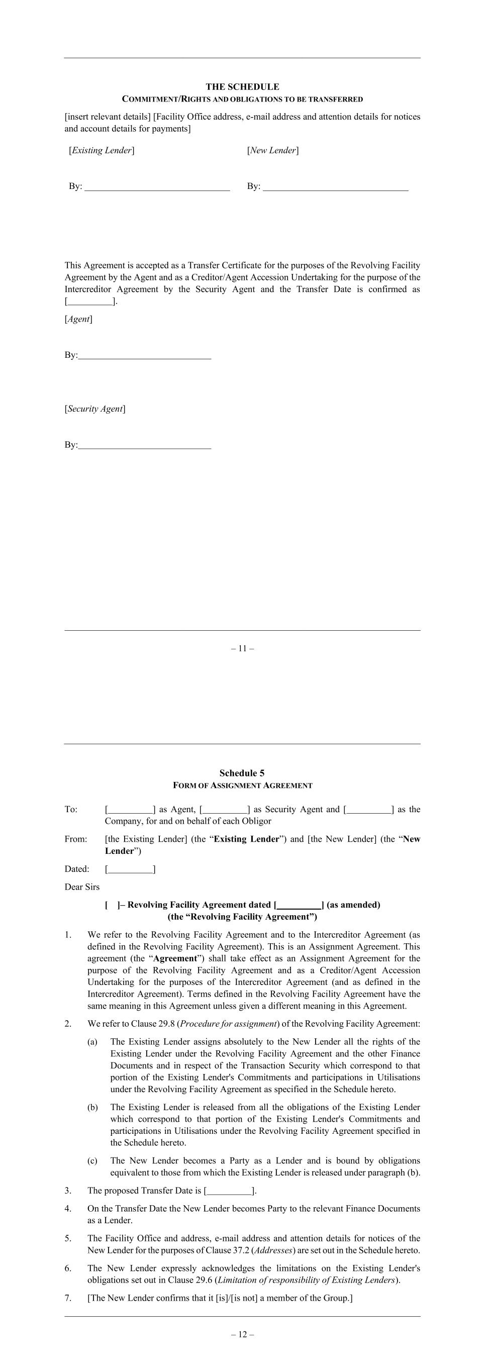 – 11 – THE SCHEDULE COMMITMENT/RIGHTS AND OBLIGATIONS TO BE TRANSFERRED [insert relevant details] [Facility Office address, e-mail address and attention details for notices and account details for payments] [Existing Lender] By: _______________________________ [New Lender] By: _______________________________ This Agreement is accepted as a Transfer Certificate for the purposes of the Revolving Facility Agreement by the Agent and as a Creditor/Agent Accession Undertaking for the purpose of the Intercreditor Agreement by the Security Agent and the Transfer Date is confirmed as [ ]. [Agent] By: [Security Agent] By: – 12 – Schedule 5 FORM OF ASSIGNMENT AGREEMENT To: [ ] as Agent, [ ] as Security Agent and [ ] as the Company, for and on behalf of each Obligor From: [the Existing Lender] (the “Existing Lender”) and [the New Lender] (the “New Lender”) Dated: [ ] Dear Sirs [ ]– Revolving Facility Agreement dated [ ] (as amended) (the “Revolving Facility Agreement”) 1. We refer to the Revolving Facility Agreement and to the Intercreditor Agreement (as defined in the Revolving Facility Agreement). This is an Assignment Agreement. This agreement (the “Agreement”) shall take effect as an Assignment Agreement for the purpose of the Revolving Facility Agreement and as a Creditor/Agent Accession Undertaking for the purposes of the Intercreditor Agreement (and as defined in the Intercreditor Agreement). Terms defined in the Revolving Facility Agreement have the same meaning in this Agreement unless given a different meaning in this Agreement. 2. We refer to Clause 29.8 (Procedure for assignment) of the Revolving Facility Agreement: (a) The Existing Lender assigns absolutely to the New Lender all the rights of the Existing Lender under the Revolving Facility Agreement and the other Finance Documents and in respect of the Transaction Security which correspond to that portion of the Existing Lender's Commitments and participations in Utilisations under the Revolving Facility Agreement as specified in the Schedule hereto. (b) The Existing Lender is released from all the obligations of the Existing Lender which correspond to that portion of the Existing Lender's Commitments and participations in Utilisations under the Revolving Facility Agreement specified in the Schedule hereto. (c) The New Lender becomes a Party as a Lender and is bound by obligations equivalent to those from which the Existing Lender is released under paragraph (b). 3. The proposed Transfer Date is [ ]. 4. On the Transfer Date the New Lender becomes Party to the relevant Finance Documents as a Lender. 5. The Facility Office and address, e-mail address and attention details for notices of the New Lender for the purposes of Clause 37.2 (Addresses) are set out in the Schedule hereto. 6. The New Lender expressly acknowledges the limitations on the Existing Lender's obligations set out in Clause 29.6 (Limitation of responsibility of Existing Lenders). 7. [The New Lender confirms that it [is]/[is not] a member of the Group.]