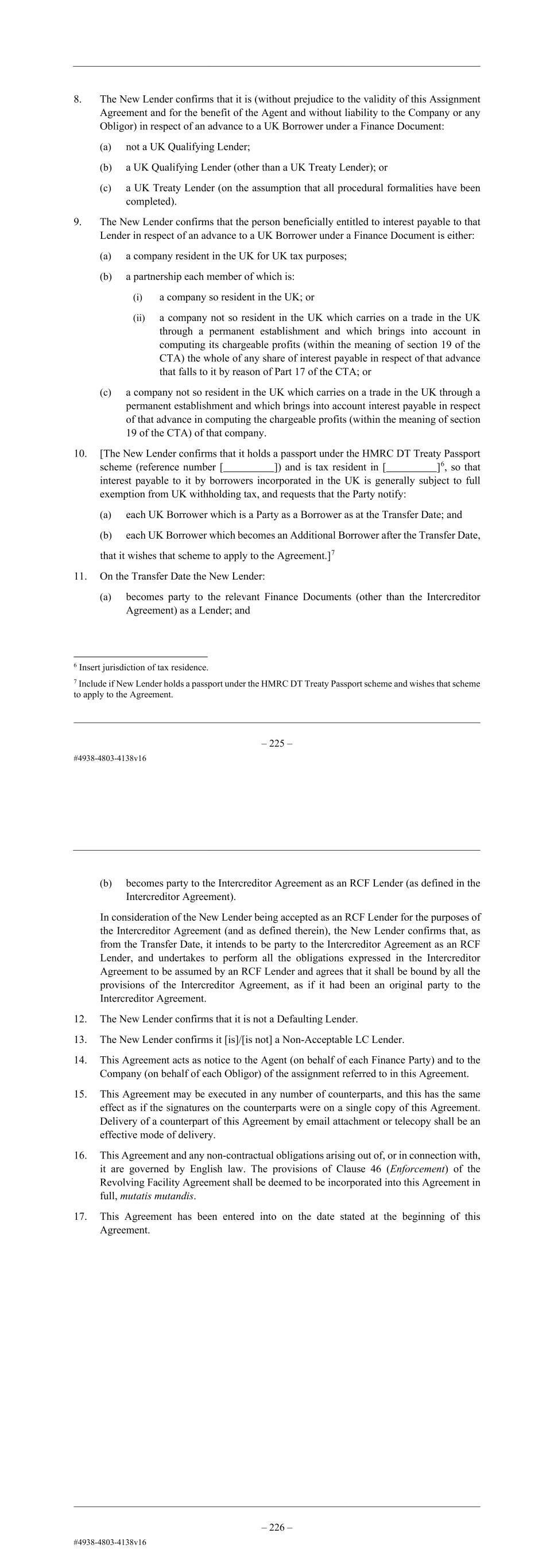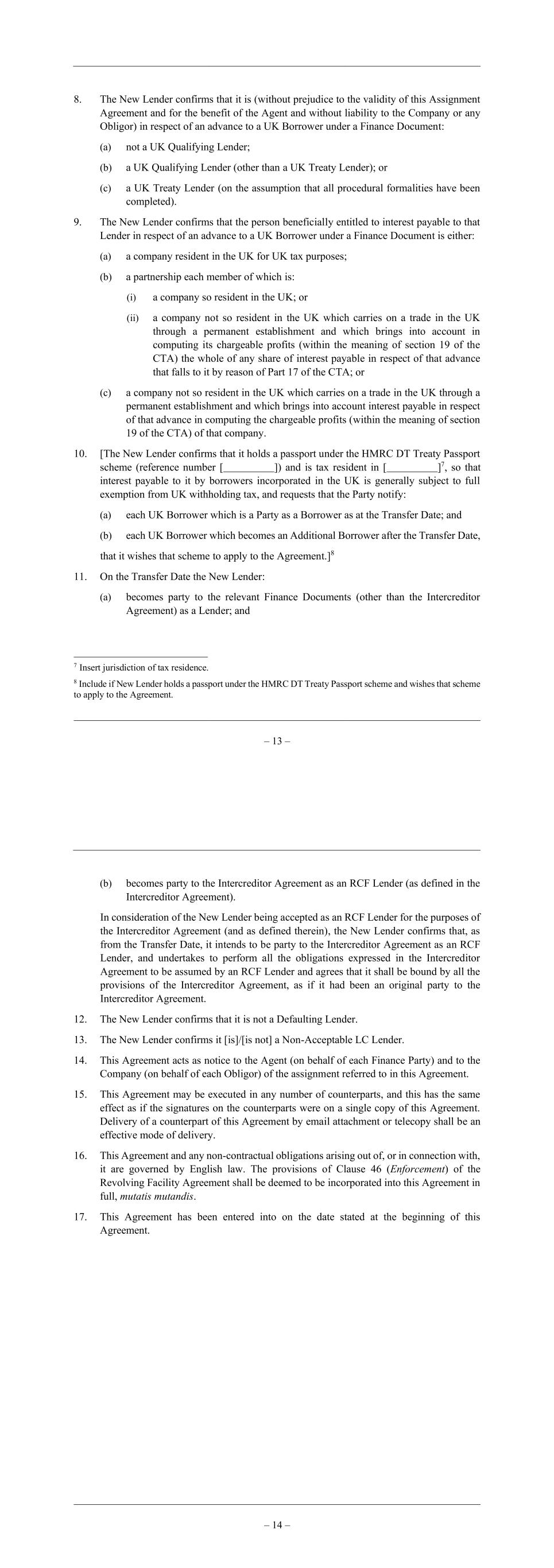 – 13 – 8. The New Lender confirms that it is (without prejudice to the validity of this Assignment Agreement and for the benefit of the Agent and without liability to the Company or any Obligor) in respect of an advance to a UK Borrower under a Finance Document: (a) not a UK Qualifying Lender; (b) a UK Qualifying Lender (other than a UK Treaty Lender); or (c) a UK Treaty Lender (on the assumption that all procedural formalities have been completed). 9. The New Lender confirms that the person beneficially entitled to interest payable to that Lender in respect of an advance to a UK Borrower under a Finance Document is either: (a) a company resident in the UK for UK tax purposes; (b) a partnership each member of which is: (i) a company so resident in the UK; or (ii) a company not so resident in the UK which carries on a trade in the UK through a permanent establishment and which brings into account in computing its chargeable profits (within the meaning of section 19 of the CTA) the whole of any share of interest payable in respect of that advance that falls to it by reason of Part 17 of the CTA; or (c) a company not so resident in the UK which carries on a trade in the UK through a permanent establishment and which brings into account interest payable in respect of that advance in computing the chargeable profits (within the meaning of section 19 of the CTA) of that company. 10. [The New Lender confirms that it holds a passport under the HMRC DT Treaty Passport scheme (reference number [ ]) and is tax resident in [ ]7, so that interest payable to it by borrowers incorporated in the UK is generally subject to full exemption from UK withholding tax, and requests that the Party notify: (a) each UK Borrower which is a Party as a Borrower as at the Transfer Date; and (b) each UK Borrower which becomes an Additional Borrower after the Transfer Date, that it wishes that scheme to apply to the Agreement.]8 11. On the Transfer Date the New Lender: (a) becomes party to the relevant Finance Documents (other than the Intercreditor Agreement) as a Lender; and 7 Insert jurisdiction of tax residence. 8 Include if New Lender holds a passport under the HMRC DT Treaty Passport scheme and wishes that scheme to apply to the Agreement. – 14 – (b) becomes party to the Intercreditor Agreement as an RCF Lender (as defined in the Intercreditor Agreement). In consideration of the New Lender being accepted as an RCF Lender for the purposes of the Intercreditor Agreement (and as defined therein), the New Lender confirms that, as from the Transfer Date, it intends to be party to the Intercreditor Agreement as an RCF Lender, and undertakes to perform all the obligations expressed in the Intercreditor Agreement to be assumed by an RCF Lender and agrees that it shall be bound by all the provisions of the Intercreditor Agreement, as if it had been an original party to the Intercreditor Agreement. 12. The New Lender confirms that it is not a Defaulting Lender. 13. The New Lender confirms it [is]/[is not] a Non-Acceptable LC Lender. 14. This Agreement acts as notice to the Agent (on behalf of each Finance Party) and to the Company (on behalf of each Obligor) of the assignment referred to in this Agreement. 15. This Agreement may be executed in any number of counterparts, and this has the same effect as if the signatures on the counterparts were on a single copy of this Agreement. Delivery of a counterpart of this Agreement by email attachment or telecopy shall be an effective mode of delivery. 16. This Agreement and any non-contractual obligations arising out of, or in connection with, it are governed by English law. The provisions of Clause 46 (Enforcement) of the Revolving Facility Agreement shall be deemed to be incorporated into this Agreement in full, mutatis mutandis. 17. This Agreement has been entered into on the date stated at the beginning of this Agreement.