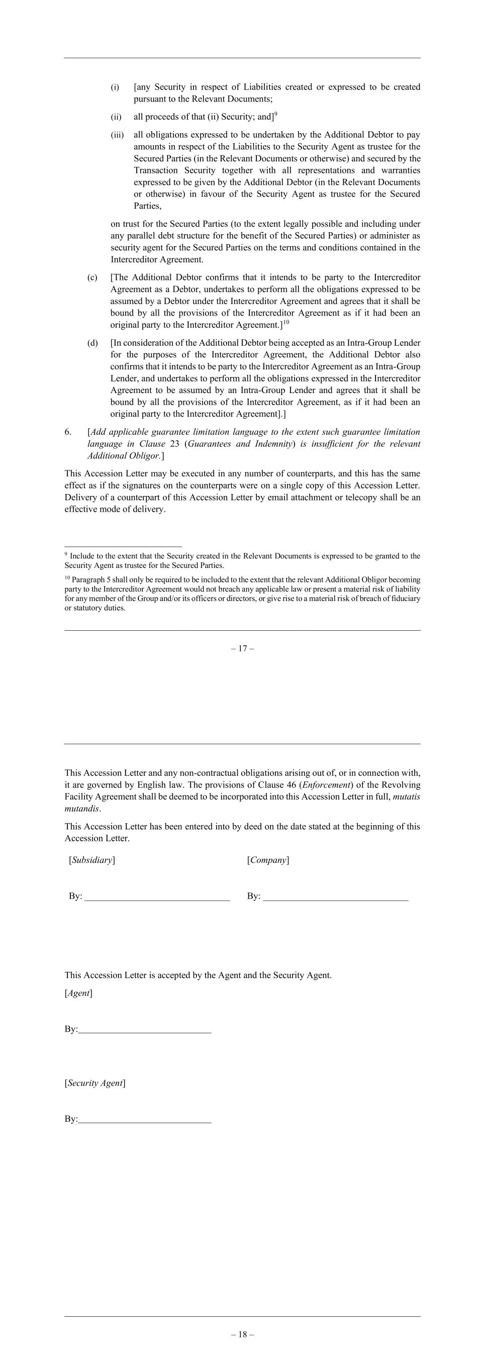 – 17 – (i) [any Security in respect of Liabilities created or expressed to be created pursuant to the Relevant Documents; (ii) all proceeds of that (ii) Security; and]9 (iii) all obligations expressed to be undertaken by the Additional Debtor to pay amounts in respect of the Liabilities to the Security Agent as trustee for the Secured Parties (in the Relevant Documents or otherwise) and secured by the Transaction Security together with all representations and warranties expressed to be given by the Additional Debtor (in the Relevant Documents or otherwise) in favour of the Security Agent as trustee for the Secured Parties, on trust for the Secured Parties (to the extent legally possible and including under any parallel debt structure for the benefit of the Secured Parties) or administer as security agent for the Secured Parties on the terms and conditions contained in the Intercreditor Agreement. (c) [The Additional Debtor confirms that it intends to be party to the Intercreditor Agreement as a Debtor, undertakes to perform all the obligations expressed to be assumed by a Debtor under the Intercreditor Agreement and agrees that it shall be bound by all the provisions of the Intercreditor Agreement as if it had been an original party to the Intercreditor Agreement.]10 (d) [In consideration of the Additional Debtor being accepted as an Intra-Group Lender for the purposes of the Intercreditor Agreement, the Additional Debtor also confirms that it intends to be party to the Intercreditor Agreement as an Intra-Group Lender, and undertakes to perform all the obligations expressed in the Intercreditor Agreement to be assumed by an Intra-Group Lender and agrees that it shall be bound by all the provisions of the Intercreditor Agreement, as if it had been an original party to the Intercreditor Agreement].] 6. [Add applicable guarantee limitation language to the extent such guarantee limitation language in Clause 23 (Guarantees and Indemnity) is insufficient for the relevant Additional Obligor.] This Accession Letter may be executed in any number of counterparts, and this has the same effect as if the signatures on the counterparts were on a single copy of this Accession Letter. Delivery of a counterpart of this Accession Letter by email attachment or telecopy shall be an effective mode of delivery. 9 Include to the extent that the Security created in the Relevant Documents is expressed to be granted to the Security Agent as trustee for the Secured Parties. 10 Paragraph 5 shall only be required to be included to the extent that the relevant Additional Obligor becoming party to the Intercreditor Agreement would not breach any applicable law or present a material risk of liability for any member of the Group and/or its officers or directors, or give rise to a material risk of breach of fiduciary or statutory duties. – 18 – This Accession Letter and any non-contractual obligations arising out of, or in connection with, it are governed by English law. The provisions of Clause 46 (Enforcement) of the Revolving Facility Agreement shall be deemed to be incorporated into this Accession Letter in full, mutatis mutandis. This Accession Letter has been entered into by deed on the date stated at the beginning of this Accession Letter. [Subsidiary] By: _______________________________ [Company] By: _______________________________ This Accession Letter is accepted by the Agent and the Security Agent. [Agent] By: [Security Agent] By:
