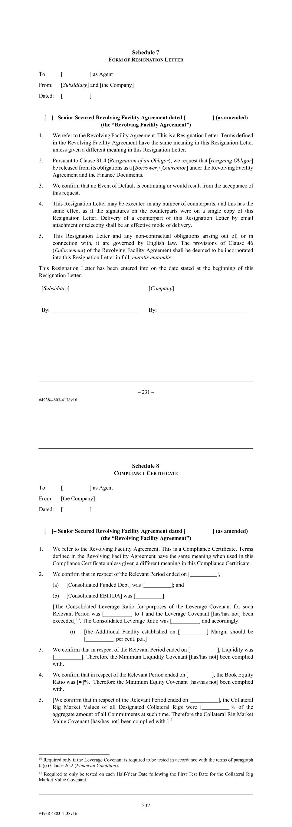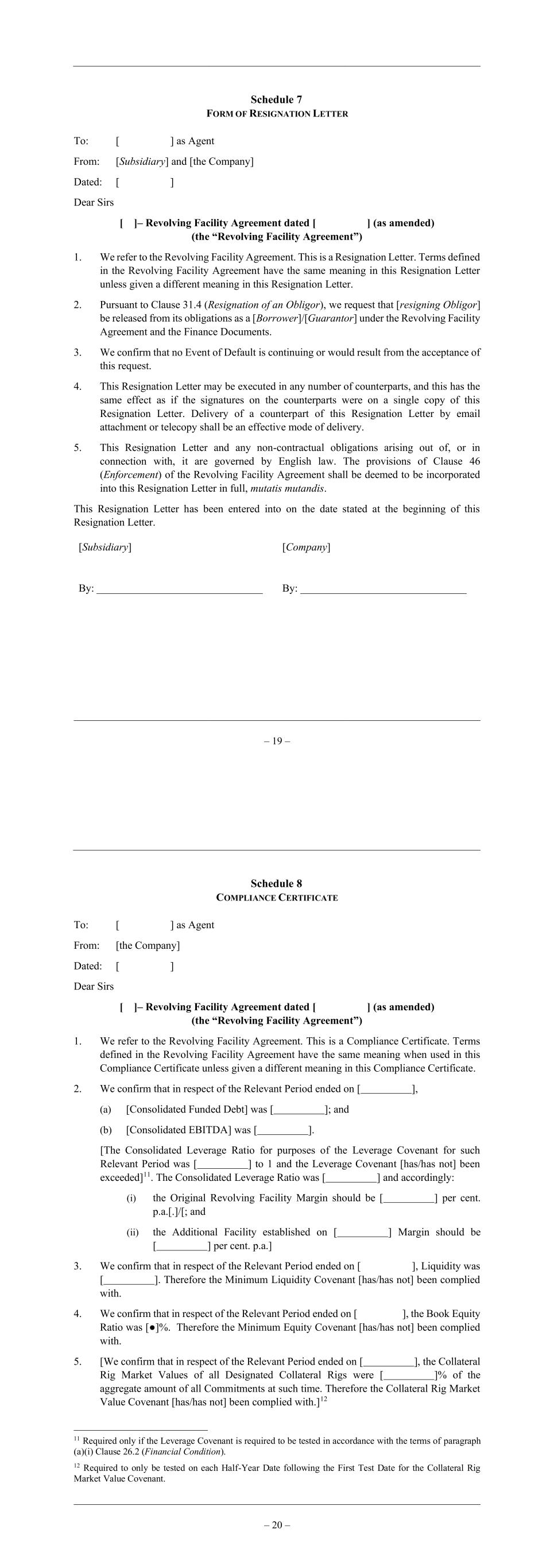 – 19 – Schedule 7 FORM OF RESIGNATION LETTER To: [ ] as Agent From: [Subsidiary] and [the Company] Dated: [ ] Dear Sirs [ ]– Revolving Facility Agreement dated [ ] (as amended) (the “Revolving Facility Agreement”) 1. We refer to the Revolving Facility Agreement. This is a Resignation Letter. Terms defined in the Revolving Facility Agreement have the same meaning in this Resignation Letter unless given a different meaning in this Resignation Letter. 2. Pursuant to Clause 31.4 (Resignation of an Obligor), we request that [resigning Obligor] be released from its obligations as a [Borrower]/[Guarantor] under the Revolving Facility Agreement and the Finance Documents. 3. We confirm that no Event of Default is continuing or would result from the acceptance of this request. 4. This Resignation Letter may be executed in any number of counterparts, and this has the same effect as if the signatures on the counterparts were on a single copy of this Resignation Letter. Delivery of a counterpart of this Resignation Letter by email attachment or telecopy shall be an effective mode of delivery. 5. This Resignation Letter and any non-contractual obligations arising out of, or in connection with, it are governed by English law. The provisions of Clause 46 (Enforcement) of the Revolving Facility Agreement shall be deemed to be incorporated into this Resignation Letter in full, mutatis mutandis. This Resignation Letter has been entered into on the date stated at the beginning of this Resignation Letter. [Subsidiary] By: _______________________________ [Company] By: _______________________________ – 20 – Schedule 8 COMPLIANCE CERTIFICATE To: [ ] as Agent From: [the Company] Dated: [ ] Dear Sirs [ ]– Revolving Facility Agreement dated [ ] (as amended) (the “Revolving Facility Agreement”) 1. We refer to the Revolving Facility Agreement. This is a Compliance Certificate. Terms defined in the Revolving Facility Agreement have the same meaning when used in this Compliance Certificate unless given a different meaning in this Compliance Certificate. 2. We confirm that in respect of the Relevant Period ended on [ ], (a) [Consolidated Funded Debt] was [ ]; and (b) [Consolidated EBITDA] was [ ]. [The Consolidated Leverage Ratio for purposes of the Leverage Covenant for such Relevant Period was [ ] to 1 and the Leverage Covenant [has/has not] been exceeded]11. The Consolidated Leverage Ratio was [ ] and accordingly: (i) the Original Revolving Facility Margin should be [ ] per cent. p.a.[.]/[; and (ii) the Additional Facility established on [ ] Margin should be [ ] per cent. p.a.] 3. We confirm that in respect of the Relevant Period ended on [ ], Liquidity was [ ]. Therefore the Minimum Liquidity Covenant [has/has not] been complied with. 4. We confirm that in respect of the Relevant Period ended on [ ], the Book Equity Ratio was [●]%. Therefore the Minimum Equity Covenant [has/has not] been complied with. 5. [We confirm that in respect of the Relevant Period ended on [ ], the Collateral Rig Market Values of all Designated Collateral Rigs were [ ]% of the aggregate amount of all Commitments at such time. Therefore the Collateral Rig Market Value Covenant [has/has not] been complied with.]12 11 Required only if the Leverage Covenant is required to be tested in accordance with the terms of paragraph (a)(i) Clause 26.2 (Financial Condition). 12 Required to only be tested on each Half-Year Date following the First Test Date for the Collateral Rig Market Value Covenant.