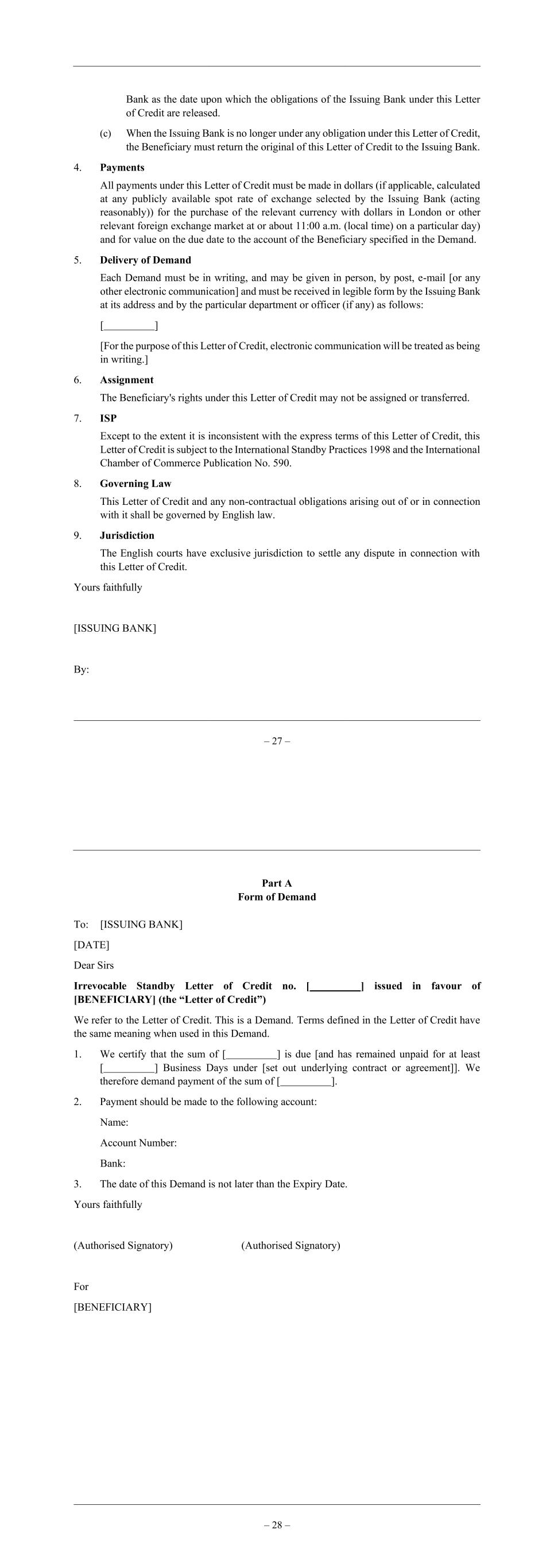 – 27 – Bank as the date upon which the obligations of the Issuing Bank under this Letter of Credit are released. (c) When the Issuing Bank is no longer under any obligation under this Letter of Credit, the Beneficiary must return the original of this Letter of Credit to the Issuing Bank. 4. Payments All payments under this Letter of Credit must be made in dollars (if applicable, calculated at any publicly available spot rate of exchange selected by the Issuing Bank (acting reasonably)) for the purchase of the relevant currency with dollars in London or other relevant foreign exchange market at or about 11:00 a.m. (local time) on a particular day) and for value on the due date to the account of the Beneficiary specified in the Demand. 5. Delivery of Demand Each Demand must be in writing, and may be given in person, by post, e-mail [or any other electronic communication] and must be received in legible form by the Issuing Bank at its address and by the particular department or officer (if any) as follows: [ ] [For the purpose of this Letter of Credit, electronic communication will be treated as being in writing.] 6. Assignment The Beneficiary's rights under this Letter of Credit may not be assigned or transferred. 7. ISP Except to the extent it is inconsistent with the express terms of this Letter of Credit, this Letter of Credit is subject to the International Standby Practices 1998 and the International Chamber of Commerce Publication No. 590. 8. Governing Law This Letter of Credit and any non-contractual obligations arising out of or in connection with it shall be governed by English law. 9. Jurisdiction The English courts have exclusive jurisdiction to settle any dispute in connection with this Letter of Credit. Yours faithfully [ISSUING BANK] By: – 28 – Part A Form of Demand To: [ISSUING BANK] [DATE] Dear Sirs Irrevocable Standby Letter of Credit no. [ ] issued in favour of [BENEFICIARY] (the “Letter of Credit”) We refer to the Letter of Credit. This is a Demand. Terms defined in the Letter of Credit have the same meaning when used in this Demand. 1. We certify that the sum of [ ] is due [and has remained unpaid for at least [ ] Business Days under [set out underlying contract or agreement]]. We therefore demand payment of the sum of [ ]. 2. Payment should be made to the following account: Name: Account Number: Bank: 3. The date of this Demand is not later than the Expiry Date. Yours faithfully (Authorised Signatory) (Authorised Signatory) For [BENEFICIARY]