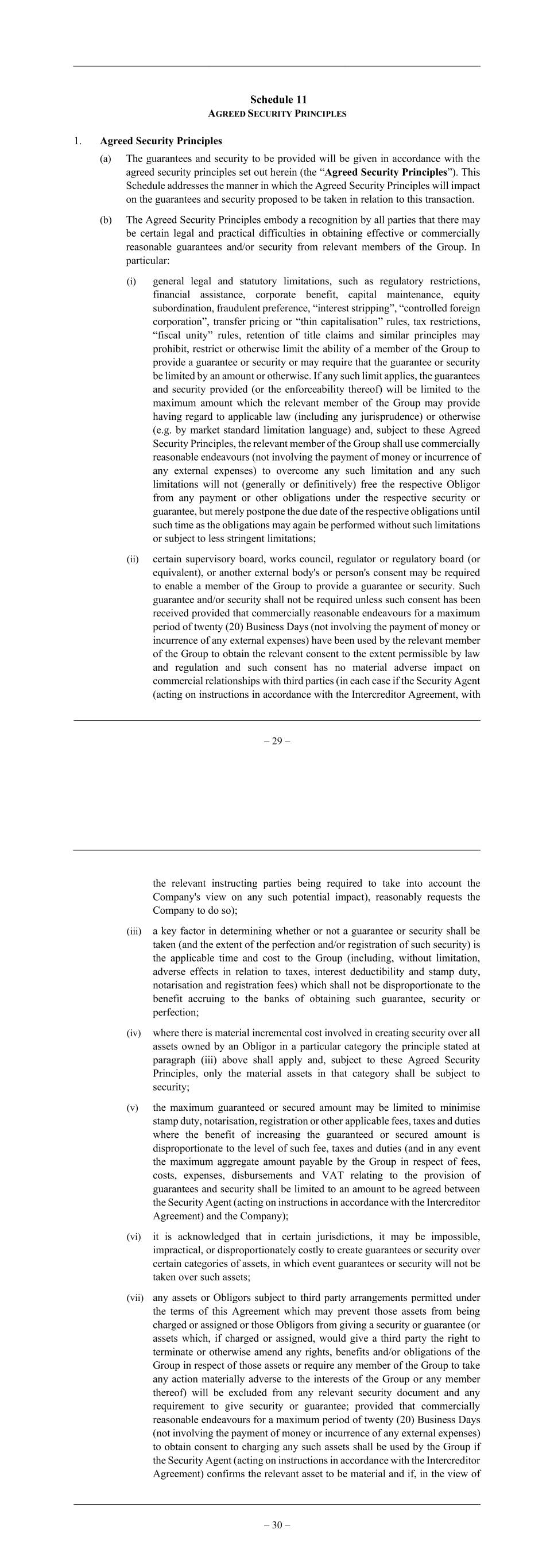 – 29 – Schedule 11 AGREED SECURITY PRINCIPLES 1. Agreed Security Principles (a) The guarantees and security to be provided will be given in accordance with the agreed security principles set out herein (the “Agreed Security Principles”). This Schedule addresses the manner in which the Agreed Security Principles will impact on the guarantees and security proposed to be taken in relation to this transaction. (b) The Agreed Security Principles embody a recognition by all parties that there may be certain legal and practical difficulties in obtaining effective or commercially reasonable guarantees and/or security from relevant members of the Group. In particular: (i) general legal and statutory limitations, such as regulatory restrictions, financial assistance, corporate benefit, capital maintenance, equity subordination, fraudulent preference, “interest stripping”, “controlled foreign corporation”, transfer pricing or “thin capitalisation” rules, tax restrictions, “fiscal unity” rules, retention of title claims and similar principles may prohibit, restrict or otherwise limit the ability of a member of the Group to provide a guarantee or security or may require that the guarantee or security be limited by an amount or otherwise. If any such limit applies, the guarantees and security provided (or the enforceability thereof) will be limited to the maximum amount which the relevant member of the Group may provide having regard to applicable law (including any jurisprudence) or otherwise (e.g. by market standard limitation language) and, subject to these Agreed Security Principles, the relevant member of the Group shall use commercially reasonable endeavours (not involving the payment of money or incurrence of any external expenses) to overcome any such limitation and any such limitations will not (generally or definitively) free the respective Obligor from any payment or other obligations under the respective security or guarantee, but merely postpone the due date of the respective obligations until such time as the obligations may again be performed without such limitations or subject to less stringent limitations; (ii) certain supervisory board, works council, regulator or regulatory board (or equivalent), or another external body's or person's consent may be required to enable a member of the Group to provide a guarantee or security. Such guarantee and/or security shall not be required unless such consent has been received provided that commercially reasonable endeavours for a maximum period of twenty (20) Business Days (not involving the payment of money or incurrence of any external expenses) have been used by the relevant member of the Group to obtain the relevant consent to the extent permissible by law and regulation and such consent has no material adverse impact on commercial relationships with third parties (in each case if the Security Agent (acting on instructions in accordance with the Intercreditor Agreement, with – 30 – the relevant instructing parties being required to take into account the Company's view on any such potential impact), reasonably requests the Company to do so); (iii) a key factor in determining whether or not a guarantee or security shall be taken (and the extent of the perfection and/or registration of such security) is the applicable time and cost to the Group (including, without limitation, adverse effects in relation to taxes, interest deductibility and stamp duty, notarisation and registration fees) which shall not be disproportionate to the benefit accruing to the banks of obtaining such guarantee, security or perfection; (iv) where there is material incremental cost involved in creating security over all assets owned by an Obligor in a particular category the principle stated at paragraph (iii) above shall apply and, subject to these Agreed Security Principles, only the material assets in that category shall be subject to security; (v) the maximum guaranteed or secured amount may be limited to minimise stamp duty, notarisation, registration or other applicable fees, taxes and duties where the benefit of increasing the guaranteed or secured amount is disproportionate to the level of such fee, taxes and duties (and in any event the maximum aggregate amount payable by the Group in respect of fees, costs, expenses, disbursements and VAT relating to the provision of guarantees and security shall be limited to an amount to be agreed between the Security Agent (acting on instructions in accordance with the Intercreditor Agreement) and the Company); (vi) it is acknowledged that in certain jurisdictions, it may be impossible, impractical, or disproportionately costly to create guarantees or security over certain categories of assets, in which event guarantees or security will not be taken over such assets; (vii) any assets or Obligors subject to third party arrangements permitted under the terms of this Agreement which may prevent those assets from being charged or assigned or those Obligors from giving a security or guarantee (or assets which, if charged or assigned, would give a third party the right to terminate or otherwise amend any rights, benefits and/or obligations of the Group in respect of those assets or require any member of the Group to take any action materially adverse to the interests of the Group or any member thereof) will be excluded from any relevant security document and any requirement to give security or guarantee; provided that commercially reasonable endeavours for a maximum period of twenty (20) Business Days (not involving the payment of money or incurrence of any external expenses) to obtain consent to charging any such assets shall be used by the Group if the Security Agent (acting on instructions in accordance with the Intercreditor Agreement) confirms the relevant asset to be material and if, in the view of