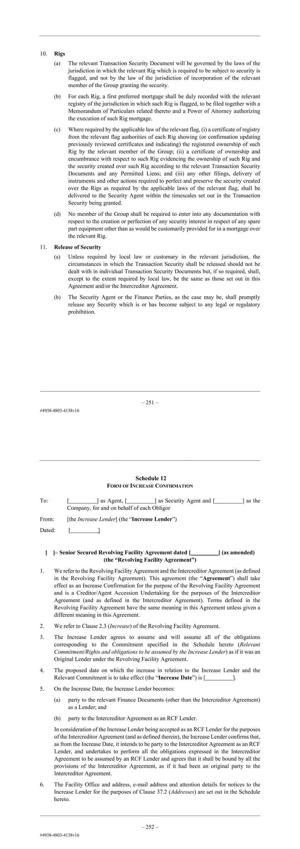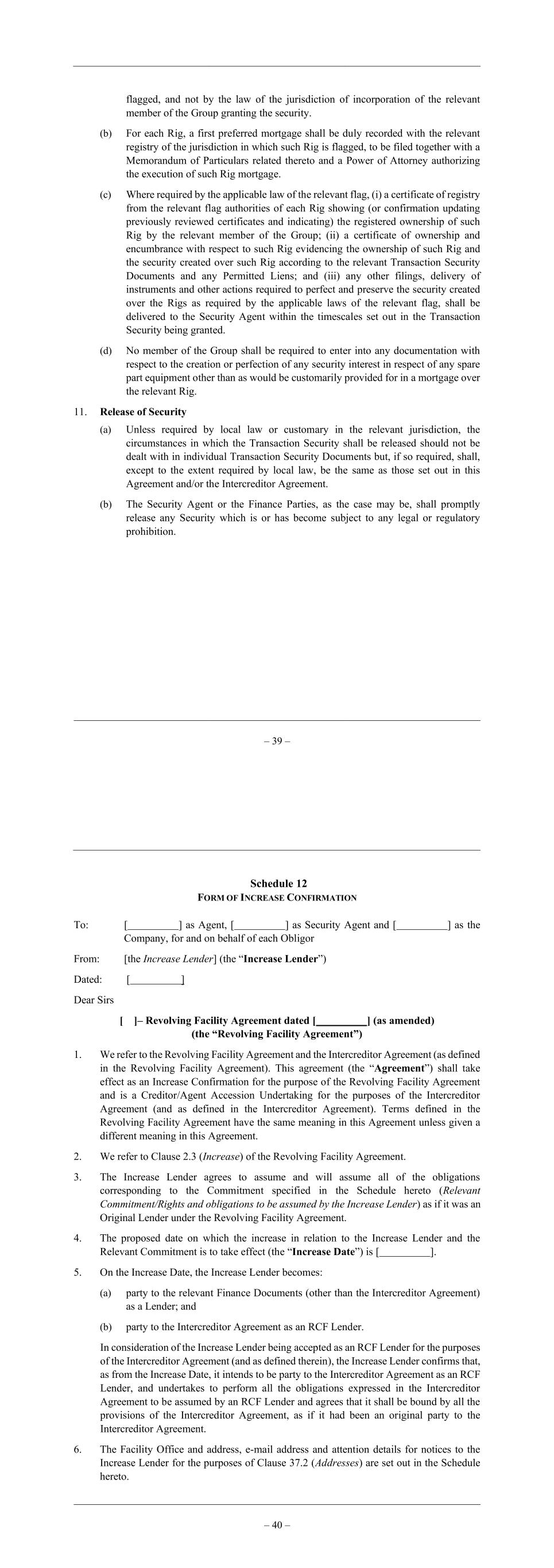 – 39 – flagged, and not by the law of the jurisdiction of incorporation of the relevant member of the Group granting the security. (b) For each Rig, a first preferred mortgage shall be duly recorded with the relevant registry of the jurisdiction in which such Rig is flagged, to be filed together with a Memorandum of Particulars related thereto and a Power of Attorney authorizing the execution of such Rig mortgage. (c) Where required by the applicable law of the relevant flag, (i) a certificate of registry from the relevant flag authorities of each Rig showing (or confirmation updating previously reviewed certificates and indicating) the registered ownership of such Rig by the relevant member of the Group; (ii) a certificate of ownership and encumbrance with respect to such Rig evidencing the ownership of such Rig and the security created over such Rig according to the relevant Transaction Security Documents and any Permitted Liens; and (iii) any other filings, delivery of instruments and other actions required to perfect and preserve the security created over the Rigs as required by the applicable laws of the relevant flag, shall be delivered to the Security Agent within the timescales set out in the Transaction Security being granted. (d) No member of the Group shall be required to enter into any documentation with respect to the creation or perfection of any security interest in respect of any spare part equipment other than as would be customarily provided for in a mortgage over the relevant Rig. 11. Release of Security (a) Unless required by local law or customary in the relevant jurisdiction, the circumstances in which the Transaction Security shall be released should not be dealt with in individual Transaction Security Documents but, if so required, shall, except to the extent required by local law, be the same as those set out in this Agreement and/or the Intercreditor Agreement. (b) The Security Agent or the Finance Parties, as the case may be, shall promptly release any Security which is or has become subject to any legal or regulatory prohibition. – 40 – Schedule 12 FORM OF INCREASE CONFIRMATION To: [ ] as Agent, [ ] as Security Agent and [ ] as the Company, for and on behalf of each Obligor From: [the Increase Lender] (the “Increase Lender”) Dated: [ ] Dear Sirs [ ]– Revolving Facility Agreement dated [ ] (as amended) (the “Revolving Facility Agreement”) 1. We refer to the Revolving Facility Agreement and the Intercreditor Agreement (as defined in the Revolving Facility Agreement). This agreement (the “Agreement”) shall take effect as an Increase Confirmation for the purpose of the Revolving Facility Agreement and is a Creditor/Agent Accession Undertaking for the purposes of the Intercreditor Agreement (and as defined in the Intercreditor Agreement). Terms defined in the Revolving Facility Agreement have the same meaning in this Agreement unless given a different meaning in this Agreement. 2. We refer to Clause 2.3 (Increase) of the Revolving Facility Agreement. 3. The Increase Lender agrees to assume and will assume all of the obligations corresponding to the Commitment specified in the Schedule hereto (Relevant Commitment/Rights and obligations to be assumed by the Increase Lender) as if it was an Original Lender under the Revolving Facility Agreement. 4. The proposed date on which the increase in relation to the Increase Lender and the Relevant Commitment is to take effect (the “Increase Date”) is [ ]. 5. On the Increase Date, the Increase Lender becomes: (a) party to the relevant Finance Documents (other than the Intercreditor Agreement) as a Lender; and (b) party to the Intercreditor Agreement as an RCF Lender. In consideration of the Increase Lender being accepted as an RCF Lender for the purposes of the Intercreditor Agreement (and as defined therein), the Increase Lender confirms that, as from the Increase Date, it intends to be party to the Intercreditor Agreement as an RCF Lender, and undertakes to perform all the obligations expressed in the Intercreditor Agreement to be assumed by an RCF Lender and agrees that it shall be bound by all the provisions of the Intercreditor Agreement, as if it had been an original party to the Intercreditor Agreement. 6. The Facility Office and address, e-mail address and attention details for notices to the Increase Lender for the purposes of Clause 37.2 (Addresses) are set out in the Schedule hereto.
