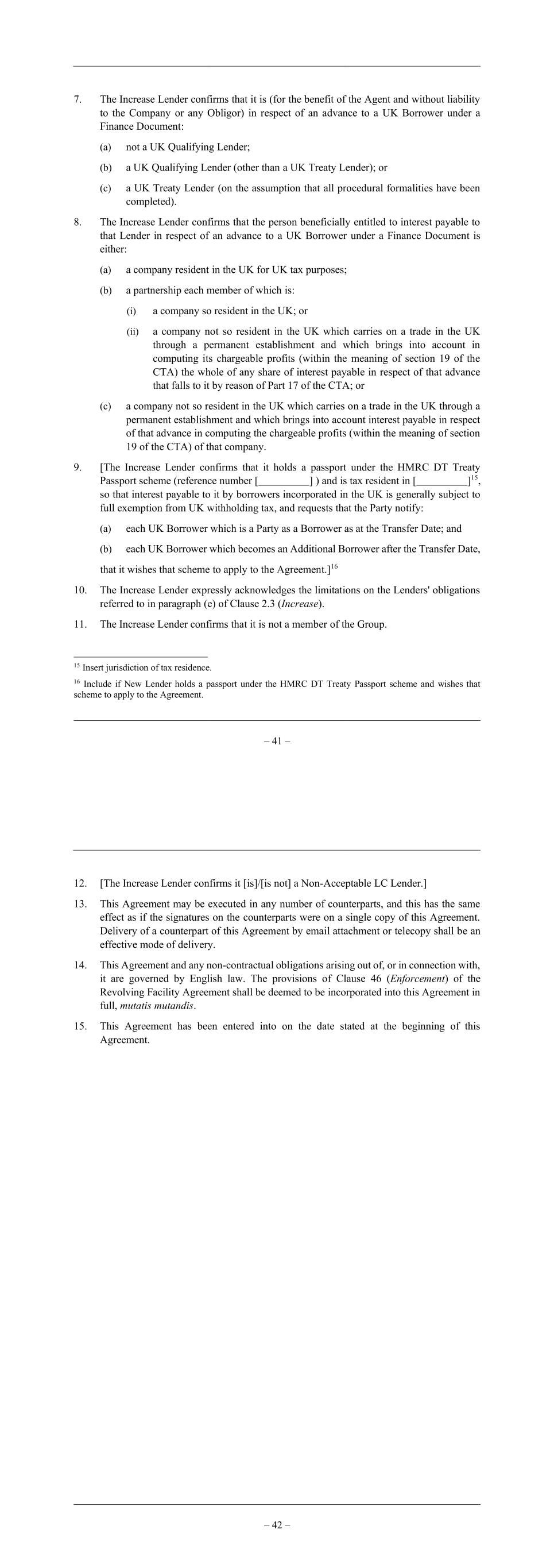 – 41 – 7. The Increase Lender confirms that it is (for the benefit of the Agent and without liability to the Company or any Obligor) in respect of an advance to a UK Borrower under a Finance Document: (a) not a UK Qualifying Lender; (b) a UK Qualifying Lender (other than a UK Treaty Lender); or (c) a UK Treaty Lender (on the assumption that all procedural formalities have been completed). 8. The Increase Lender confirms that the person beneficially entitled to interest payable to that Lender in respect of an advance to a UK Borrower under a Finance Document is either: (a) a company resident in the UK for UK tax purposes; (b) a partnership each member of which is: (i) a company so resident in the UK; or (ii) a company not so resident in the UK which carries on a trade in the UK through a permanent establishment and which brings into account in computing its chargeable profits (within the meaning of section 19 of the CTA) the whole of any share of interest payable in respect of that advance that falls to it by reason of Part 17 of the CTA; or (c) a company not so resident in the UK which carries on a trade in the UK through a permanent establishment and which brings into account interest payable in respect of that advance in computing the chargeable profits (within the meaning of section 19 of the CTA) of that company. 9. [The Increase Lender confirms that it holds a passport under the HMRC DT Treaty Passport scheme (reference number [ ] ) and is tax resident in [ ]15, so that interest payable to it by borrowers incorporated in the UK is generally subject to full exemption from UK withholding tax, and requests that the Party notify: (a) each UK Borrower which is a Party as a Borrower as at the Transfer Date; and (b) each UK Borrower which becomes an Additional Borrower after the Transfer Date, that it wishes that scheme to apply to the Agreement.]16 10. The Increase Lender expressly acknowledges the limitations on the Lenders' obligations referred to in paragraph (e) of Clause 2.3 (Increase). 11. The Increase Lender confirms that it is not a member of the Group. 15 Insert jurisdiction of tax residence. 16 Include if New Lender holds a passport under the HMRC DT Treaty Passport scheme and wishes that scheme to apply to the Agreement. – 42 – 12. [The Increase Lender confirms it [is]/[is not] a Non-Acceptable LC Lender.] 13. This Agreement may be executed in any number of counterparts, and this has the same effect as if the signatures on the counterparts were on a single copy of this Agreement. Delivery of a counterpart of this Agreement by email attachment or telecopy shall be an effective mode of delivery. 14. This Agreement and any non-contractual obligations arising out of, or in connection with, it are governed by English law. The provisions of Clause 46 (Enforcement) of the Revolving Facility Agreement shall be deemed to be incorporated into this Agreement in full, mutatis mutandis. 15. This Agreement has been entered into on the date stated at the beginning of this Agreement.