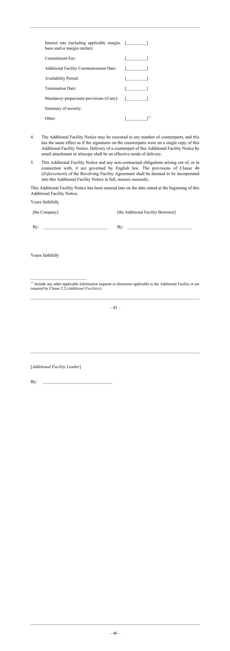 – 45 – Interest rate (including applicable margin, basis and/or margin ratchet): [ ] Commitment Fee: [ ] Additional Facility Commencement Date: [ ] Availability Period: [ ] Termination Date: [ ] Mandatory prepayment provisions (if any): [ ] Summary of security: Other: [ ]17 4. The Additional Facility Notice may be executed in any number of counterparts, and this has the same effect as if the signatures on the counterparts were on a single copy of this Additional Facility Notice. Delivery of a counterpart of this Additional Facility Notice by email attachment or telecopy shall be an effective mode of delivery. 5. This Additional Facility Notice and any non-contractual obligations arising out of, or in connection with, it are governed by English law. The provisions of Clause 46 (Enforcement) of the Revolving Facility Agreement shall be deemed to be incorporated into this Additional Facility Notice in full, mutatis mutandis. This Additional Facility Notice has been entered into on the date stated at the beginning of this Additional Facility Notice. Yours faithfully [the Company] By: ______________________________ [the Additional Facility Borrower] By: ______________________________ Yours faithfully 17 Include any other applicable information requests or directions applicable to the Additional Facility or are required by Clause 2.2 (Additional Facilities). – 46 – [Additional Facility Lender] By:
