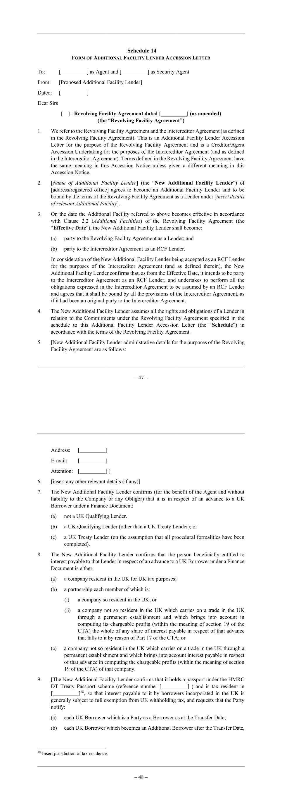 – 47 – Schedule 14 FORM OF ADDITIONAL FACILITY LENDER ACCESSION LETTER To: [ ] as Agent and [ ] as Security Agent From: [Proposed Additional Facility Lender] Dated: [ ] Dear Sirs [ ]– Revolving Facility Agreement dated [ ] (as amended) (the “Revolving Facility Agreement”) 1. We refer to the Revolving Facility Agreement and the Intercreditor Agreement (as defined in the Revolving Facility Agreement). This is an Additional Facility Lender Accession Letter for the purpose of the Revolving Facility Agreement and is a Creditor/Agent Accession Undertaking for the purposes of the Intercreditor Agreement (and as defined in the Intercreditor Agreement). Terms defined in the Revolving Facility Agreement have the same meaning in this Accession Notice unless given a different meaning in this Accession Notice. 2. [Name of Additional Facility Lender] (the “New Additional Facility Lender”) of [address/registered office] agrees to become an Additional Facility Lender and to be bound by the terms of the Revolving Facility Agreement as a Lender under [insert details of relevant Additional Facility]. 3. On the date the Additional Facility referred to above becomes effective in accordance with Clause 2.2 (Additional Facilities) of the Revolving Facility Agreement (the “Effective Date”), the New Additional Facility Lender shall become: (a) party to the Revolving Facility Agreement as a Lender; and (b) party to the Intercreditor Agreement as an RCF Lender. In consideration of the New Additional Facility Lender being accepted as an RCF Lender for the purposes of the Intercreditor Agreement (and as defined therein), the New Additional Facility Lender confirms that, as from the Effective Date, it intends to be party to the Intercreditor Agreement as an RCF Lender, and undertakes to perform all the obligations expressed in the Intercreditor Agreement to be assumed by an RCF Lender and agrees that it shall be bound by all the provisions of the Intercreditor Agreement, as if it had been an original party to the Intercreditor Agreement. 4. The New Additional Facility Lender assumes all the rights and obligations of a Lender in relation to the Commitments under the Revolving Facility Agreement specified in the schedule to this Additional Facility Lender Accession Letter (the “Schedule”) in accordance with the terms of the Revolving Facility Agreement. 5. [New Additional Facility Lender administrative details for the purposes of the Revolving Facility Agreement are as follows: – 48 – Address: [ ] E-mail: [ ] Attention: [ ] ] 6. [insert any other relevant details (if any)] 7. The New Additional Facility Lender confirms (for the benefit of the Agent and without liability to the Company or any Obligor) that it is in respect of an advance to a UK Borrower under a Finance Document: (a) not a UK Qualifying Lender. (b) a UK Qualifying Lender (other than a UK Treaty Lender); or (c) a UK Treaty Lender (on the assumption that all procedural formalities have been completed). 8. The New Additional Facility Lender confirms that the person beneficially entitled to interest payable to that Lender in respect of an advance to a UK Borrower under a Finance Document is either: (a) a company resident in the UK for UK tax purposes; (b) a partnership each member of which is: (i) a company so resident in the UK; or (ii) a company not so resident in the UK which carries on a trade in the UK through a permanent establishment and which brings into account in computing its chargeable profits (within the meaning of section 19 of the CTA) the whole of any share of interest payable in respect of that advance that falls to it by reason of Part 17 of the CTA; or (c) a company not so resident in the UK which carries on a trade in the UK through a permanent establishment and which brings into account interest payable in respect of that advance in computing the chargeable profits (within the meaning of section 19 of the CTA) of that company. 9. [The New Additional Facility Lender confirms that it holds a passport under the HMRC DT Treaty Passport scheme (reference number [ ] ) and is tax resident in [ ]18, so that interest payable to it by borrowers incorporated in the UK is generally subject to full exemption from UK withholding tax, and requests that the Party notify: (a) each UK Borrower which is a Party as a Borrower as at the Transfer Date; (b) each UK Borrower which becomes an Additional Borrower after the Transfer Date, 18 Insert jurisdiction of tax residence.