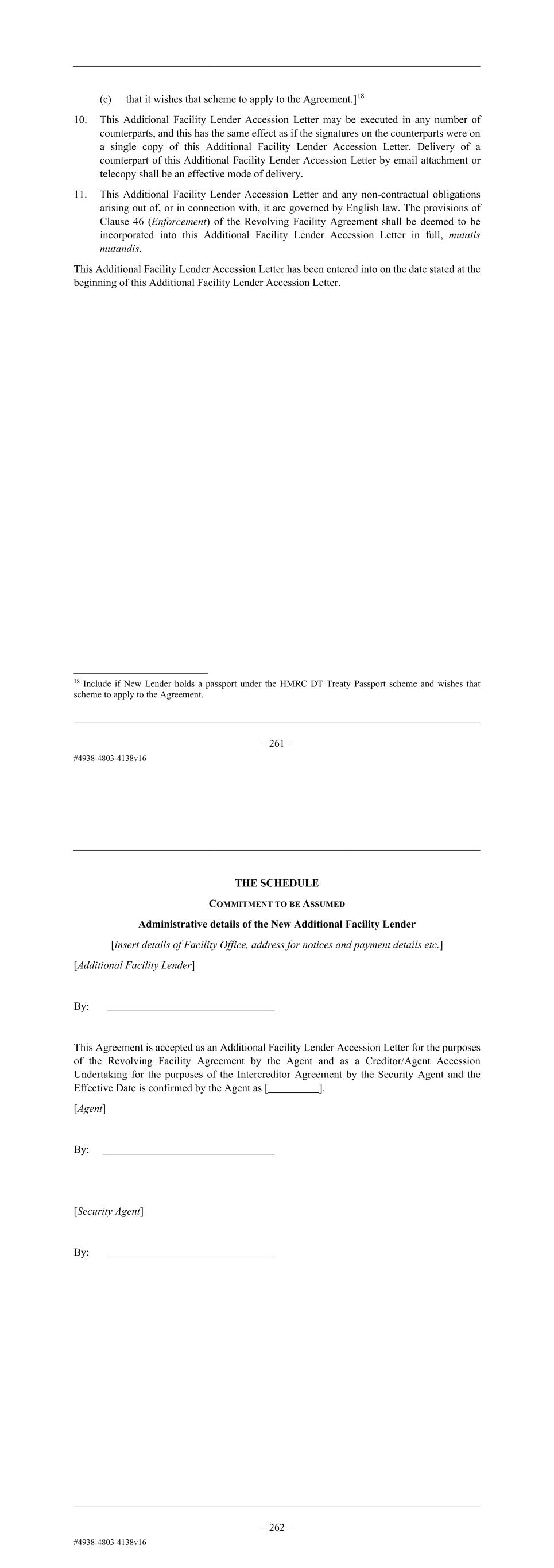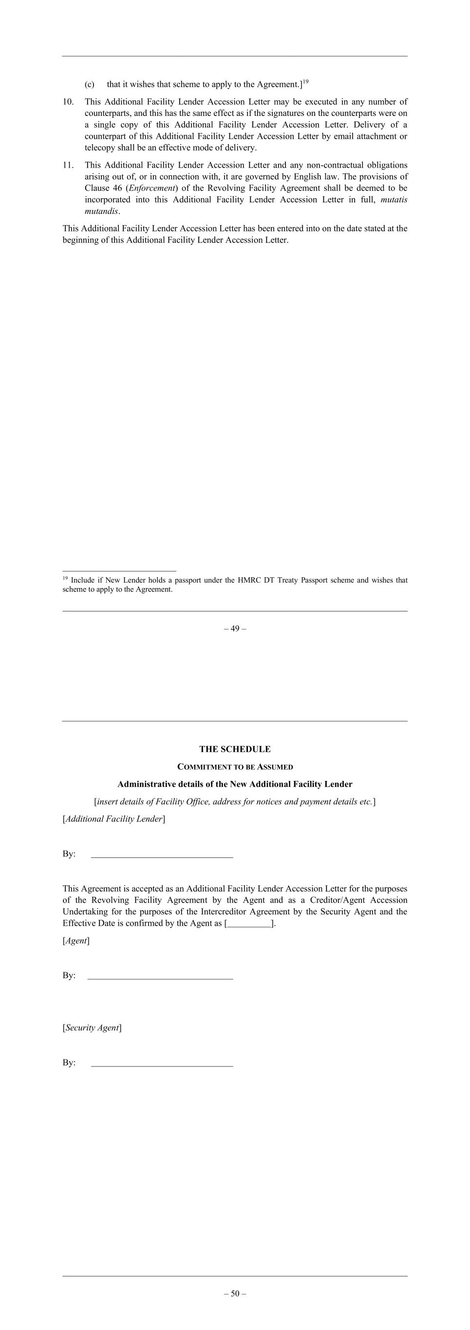 – 49 – (c) that it wishes that scheme to apply to the Agreement.]19 10. This Additional Facility Lender Accession Letter may be executed in any number of counterparts, and this has the same effect as if the signatures on the counterparts were on a single copy of this Additional Facility Lender Accession Letter. Delivery of a counterpart of this Additional Facility Lender Accession Letter by email attachment or telecopy shall be an effective mode of delivery. 11. This Additional Facility Lender Accession Letter and any non-contractual obligations arising out of, or in connection with, it are governed by English law. The provisions of Clause 46 (Enforcement) of the Revolving Facility Agreement shall be deemed to be incorporated into this Additional Facility Lender Accession Letter in full, mutatis mutandis. This Additional Facility Lender Accession Letter has been entered into on the date stated at the beginning of this Additional Facility Lender Accession Letter. 19 Include if New Lender holds a passport under the HMRC DT Treaty Passport scheme and wishes that scheme to apply to the Agreement. – 50 – THE SCHEDULE COMMITMENT TO BE ASSUMED Administrative details of the New Additional Facility Lender [insert details of Facility Office, address for notices and payment details etc.] [Additional Facility Lender] By: This Agreement is accepted as an Additional Facility Lender Accession Letter for the purposes of the Revolving Facility Agreement by the Agent and as a Creditor/Agent Accession Undertaking for the purposes of the Intercreditor Agreement by the Security Agent and the Effective Date is confirmed by the Agent as [ ]. [Agent] By: [Security Agent] By:
