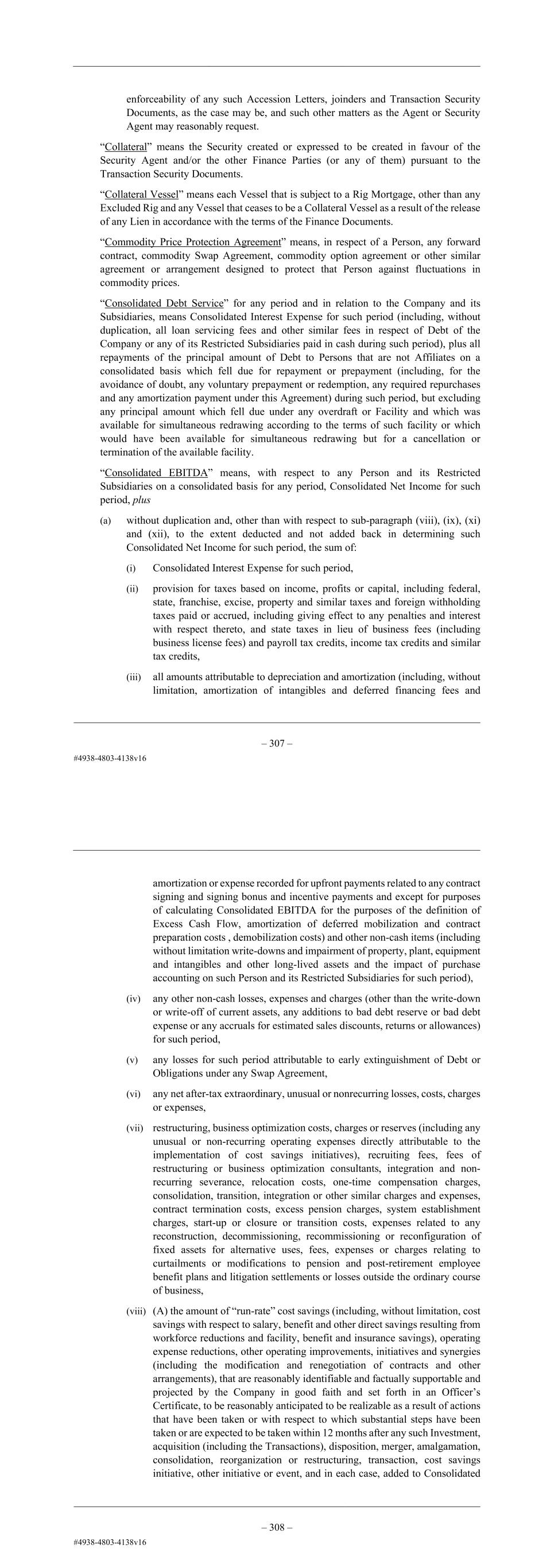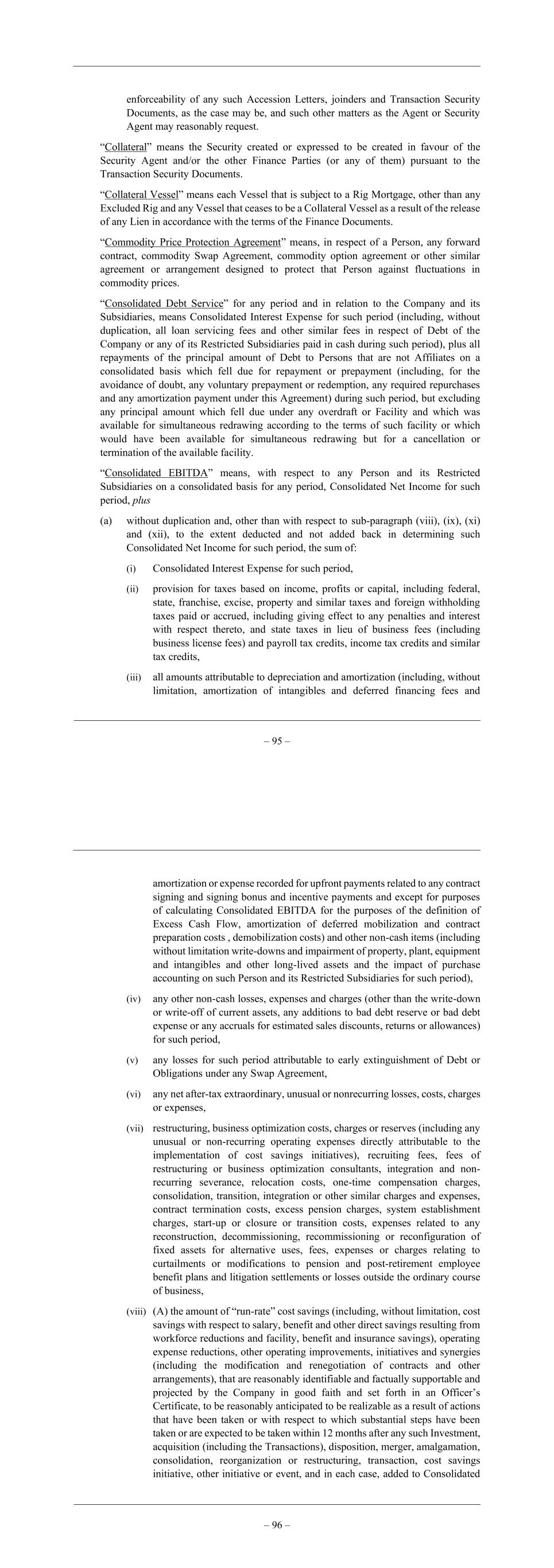 – 95 – enforceability of any such Accession Letters, joinders and Transaction Security Documents, as the case may be, and such other matters as the Agent or Security Agent may reasonably request. “Collateral” means the Security created or expressed to be created in favour of the Security Agent and/or the other Finance Parties (or any of them) pursuant to the Transaction Security Documents. “Collateral Vessel” means each Vessel that is subject to a Rig Mortgage, other than any Excluded Rig and any Vessel that ceases to be a Collateral Vessel as a result of the release of any Lien in accordance with the terms of the Finance Documents. “Commodity Price Protection Agreement” means, in respect of a Person, any forward contract, commodity Swap Agreement, commodity option agreement or other similar agreement or arrangement designed to protect that Person against fluctuations in commodity prices. “Consolidated Debt Service” for any period and in relation to the Company and its Subsidiaries, means Consolidated Interest Expense for such period (including, without duplication, all loan servicing fees and other similar fees in respect of Debt of the Company or any of its Restricted Subsidiaries paid in cash during such period), plus all repayments of the principal amount of Debt to Persons that are not Affiliates on a consolidated basis which fell due for repayment or prepayment (including, for the avoidance of doubt, any voluntary prepayment or redemption, any required repurchases and any amortization payment under this Agreement) during such period, but excluding any principal amount which fell due under any overdraft or Facility and which was available for simultaneous redrawing according to the terms of such facility or which would have been available for simultaneous redrawing but for a cancellation or termination of the available facility. “Consolidated EBITDA” means, with respect to any Person and its Restricted Subsidiaries on a consolidated basis for any period, Consolidated Net Income for such period, plus (a) without duplication and, other than with respect to sub-paragraph (viii), (ix), (xi) and (xii), to the extent deducted and not added back in determining such Consolidated Net Income for such period, the sum of: (i) Consolidated Interest Expense for such period, (ii) provision for taxes based on income, profits or capital, including federal, state, franchise, excise, property and similar taxes and foreign withholding taxes paid or accrued, including giving effect to any penalties and interest with respect thereto, and state taxes in lieu of business fees (including business license fees) and payroll tax credits, income tax credits and similar tax credits, (iii) all amounts attributable to depreciation and amortization (including, without limitation, amortization of intangibles and deferred financing fees and – 96 – amortization or expense recorded for upfront payments related to any contract signing and signing bonus and incentive payments and except for purposes of calculating Consolidated EBITDA for the purposes of the definition of Excess Cash Flow, amortization of deferred mobilization and contract preparation costs , demobilization costs) and other non-cash items (including without limitation write-downs and impairment of property, plant, equipment and intangibles and other long-lived assets and the impact of purchase accounting on such Person and its Restricted Subsidiaries for such period), (iv) any other non-cash losses, expenses and charges (other than the write-down or write-off of current assets, any additions to bad debt reserve or bad debt expense or any accruals for estimated sales discounts, returns or allowances) for such period, (v) any losses for such period attributable to early extinguishment of Debt or Obligations under any Swap Agreement, (vi) any net after-tax extraordinary, unusual or nonrecurring losses, costs, charges or expenses, (vii) restructuring, business optimization costs, charges or reserves (including any unusual or non-recurring operating expenses directly attributable to the implementation of cost savings initiatives), recruiting fees, fees of restructuring or business optimization consultants, integration and non- recurring severance, relocation costs, one-time compensation charges, consolidation, transition, integration or other similar charges and expenses, contract termination costs, excess pension charges, system establishment charges, start-up or closure or transition costs, expenses related to any reconstruction, decommissioning, recommissioning or reconfiguration of fixed assets for alternative uses, fees, expenses or charges relating to curtailments or modifications to pension and post-retirement employee benefit plans and litigation settlements or losses outside the ordinary course of business, (viii) (A) the amount of “run-rate” cost savings (including, without limitation, cost savings with respect to salary, benefit and other direct savings resulting from workforce reductions and facility, benefit and insurance savings), operating expense reductions, other operating improvements, initiatives and synergies (including the modification and renegotiation of contracts and other arrangements), that are reasonably identifiable and factually supportable and projected by the Company in good faith and set forth in an Officer’s Certificate, to be reasonably anticipated to be realizable as a result of actions that have been taken or with respect to which substantial steps have been taken or are expected to be taken within 12 months after any such Investment, acquisition (including the Transactions), disposition, merger, amalgamation, consolidation, reorganization or restructuring, transaction, cost savings initiative, other initiative or event, and in each case, added to Consolidated