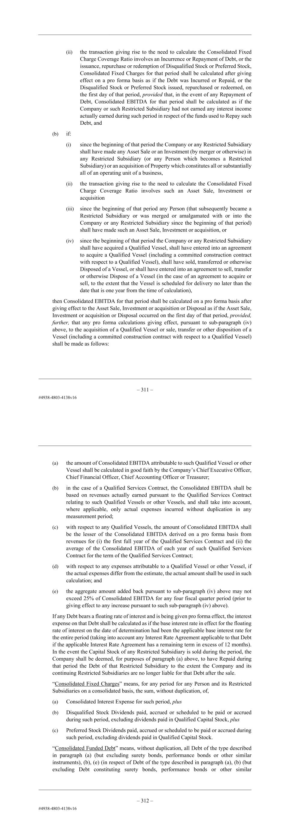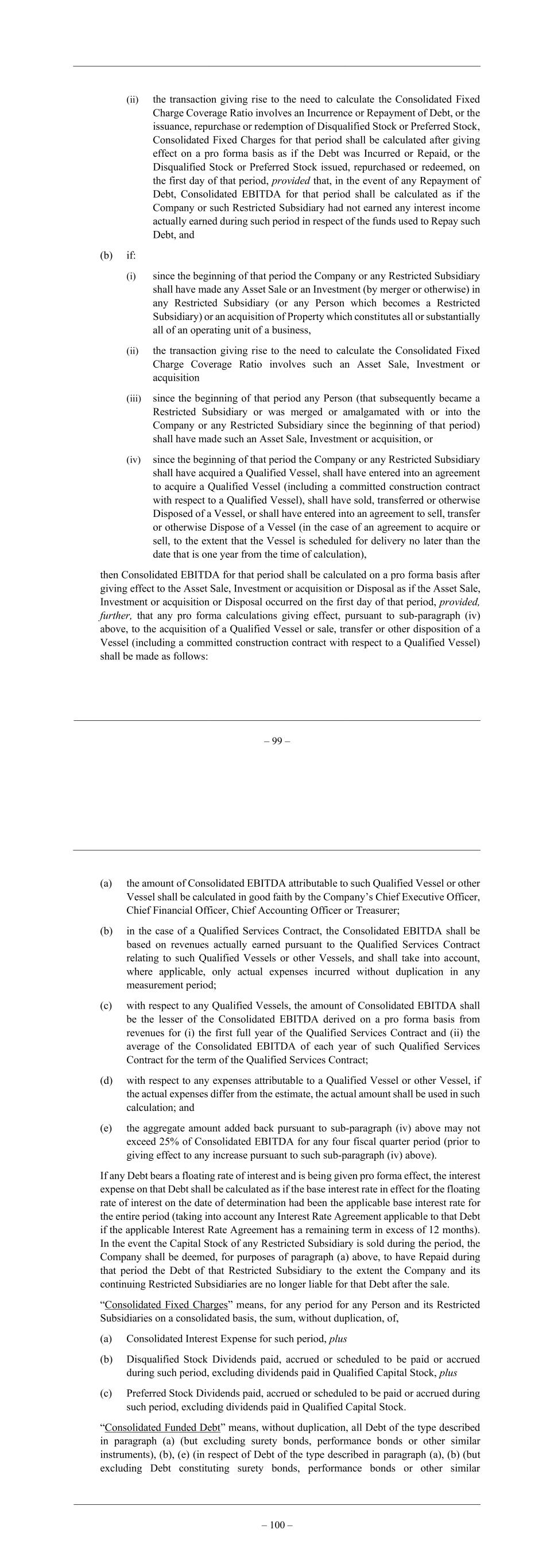 – 99 – (ii) the transaction giving rise to the need to calculate the Consolidated Fixed Charge Coverage Ratio involves an Incurrence or Repayment of Debt, or the issuance, repurchase or redemption of Disqualified Stock or Preferred Stock, Consolidated Fixed Charges for that period shall be calculated after giving effect on a pro forma basis as if the Debt was Incurred or Repaid, or the Disqualified Stock or Preferred Stock issued, repurchased or redeemed, on the first day of that period, provided that, in the event of any Repayment of Debt, Consolidated EBITDA for that period shall be calculated as if the Company or such Restricted Subsidiary had not earned any interest income actually earned during such period in respect of the funds used to Repay such Debt, and (b) if: (i) since the beginning of that period the Company or any Restricted Subsidiary shall have made any Asset Sale or an Investment (by merger or otherwise) in any Restricted Subsidiary (or any Person which becomes a Restricted Subsidiary) or an acquisition of Property which constitutes all or substantially all of an operating unit of a business, (ii) the transaction giving rise to the need to calculate the Consolidated Fixed Charge Coverage Ratio involves such an Asset Sale, Investment or acquisition (iii) since the beginning of that period any Person (that subsequently became a Restricted Subsidiary or was merged or amalgamated with or into the Company or any Restricted Subsidiary since the beginning of that period) shall have made such an Asset Sale, Investment or acquisition, or (iv) since the beginning of that period the Company or any Restricted Subsidiary shall have acquired a Qualified Vessel, shall have entered into an agreement to acquire a Qualified Vessel (including a committed construction contract with respect to a Qualified Vessel), shall have sold, transferred or otherwise Disposed of a Vessel, or shall have entered into an agreement to sell, transfer or otherwise Dispose of a Vessel (in the case of an agreement to acquire or sell, to the extent that the Vessel is scheduled for delivery no later than the date that is one year from the time of calculation), then Consolidated EBITDA for that period shall be calculated on a pro forma basis after giving effect to the Asset Sale, Investment or acquisition or Disposal as if the Asset Sale, Investment or acquisition or Disposal occurred on the first day of that period, provided, further, that any pro forma calculations giving effect, pursuant to sub-paragraph (iv) above, to the acquisition of a Qualified Vessel or sale, transfer or other disposition of a Vessel (including a committed construction contract with respect to a Qualified Vessel) shall be made as follows: – 100 – (a) the amount of Consolidated EBITDA attributable to such Qualified Vessel or other Vessel shall be calculated in good faith by the Company’s Chief Executive Officer, Chief Financial Officer, Chief Accounting Officer or Treasurer; (b) in the case of a Qualified Services Contract, the Consolidated EBITDA shall be based on revenues actually earned pursuant to the Qualified Services Contract relating to such Qualified Vessels or other Vessels, and shall take into account, where applicable, only actual expenses incurred without duplication in any measurement period; (c) with respect to any Qualified Vessels, the amount of Consolidated EBITDA shall be the lesser of the Consolidated EBITDA derived on a pro forma basis from revenues for (i) the first full year of the Qualified Services Contract and (ii) the average of the Consolidated EBITDA of each year of such Qualified Services Contract for the term of the Qualified Services Contract; (d) with respect to any expenses attributable to a Qualified Vessel or other Vessel, if the actual expenses differ from the estimate, the actual amount shall be used in such calculation; and (e) the aggregate amount added back pursuant to sub-paragraph (iv) above may not exceed 25% of Consolidated EBITDA for any four fiscal quarter period (prior to giving effect to any increase pursuant to such sub-paragraph (iv) above). If any Debt bears a floating rate of interest and is being given pro forma effect, the interest expense on that Debt shall be calculated as if the base interest rate in effect for the floating rate of interest on the date of determination had been the applicable base interest rate for the entire period (taking into account any Interest Rate Agreement applicable to that Debt if the applicable Interest Rate Agreement has a remaining term in excess of 12 months). In the event the Capital Stock of any Restricted Subsidiary is sold during the period, the Company shall be deemed, for purposes of paragraph (a) above, to have Repaid during that period the Debt of that Restricted Subsidiary to the extent the Company and its continuing Restricted Subsidiaries are no longer liable for that Debt after the sale. “Consolidated Fixed Charges” means, for any period for any Person and its Restricted Subsidiaries on a consolidated basis, the sum, without duplication, of, (a) Consolidated Interest Expense for such period, plus (b) Disqualified Stock Dividends paid, accrued or scheduled to be paid or accrued during such period, excluding dividends paid in Qualified Capital Stock, plus (c) Preferred Stock Dividends paid, accrued or scheduled to be paid or accrued during such period, excluding dividends paid in Qualified Capital Stock. “Consolidated Funded Debt” means, without duplication, all Debt of the type described in paragraph (a) (but excluding surety bonds, performance bonds or other similar instruments), (b), (e) (in respect of Debt of the type described in paragraph (a), (b) (but excluding Debt constituting surety bonds, performance bonds or other similar