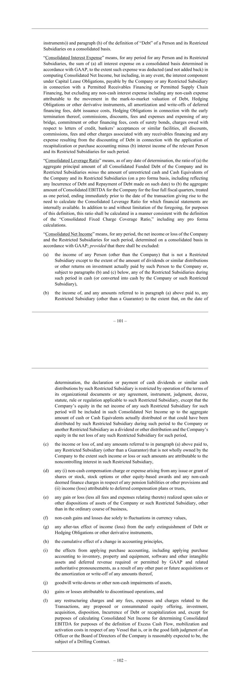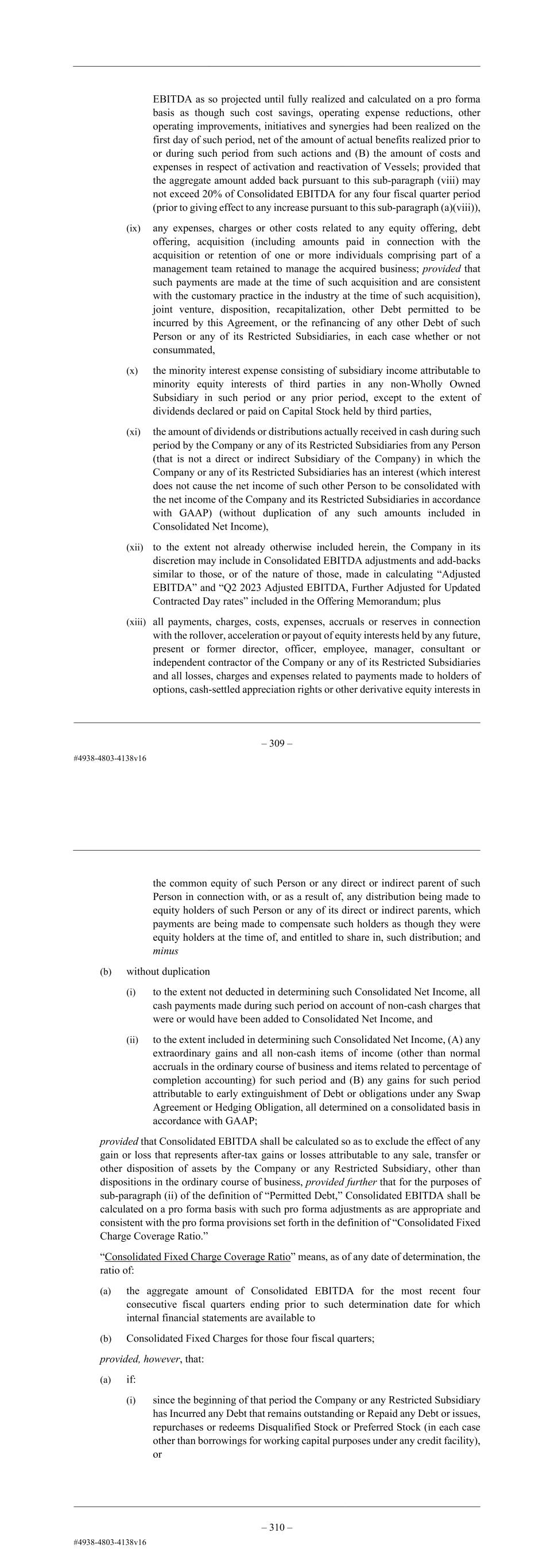 – 97 – EBITDA as so projected until fully realized and calculated on a pro forma basis as though such cost savings, operating expense reductions, other operating improvements, initiatives and synergies had been realized on the first day of such period, net of the amount of actual benefits realized prior to or during such period from such actions and (B) the amount of costs and expenses in respect of activation and reactivation of Vessels; provided that the aggregate amount added back pursuant to this sub-paragraph (viii) may not exceed 20% of Consolidated EBITDA for any four fiscal quarter period (prior to giving effect to any increase pursuant to this sub-paragraph (a)(viii)), (ix) any expenses, charges or other costs related to any equity offering, debt offering, acquisition (including amounts paid in connection with the acquisition or retention of one or more individuals comprising part of a management team retained to manage the acquired business; provided that such payments are made at the time of such acquisition and are consistent with the customary practice in the industry at the time of such acquisition), joint venture, disposition, recapitalization, other Debt permitted to be incurred by this Agreement, or the refinancing of any other Debt of such Person or any of its Restricted Subsidiaries, in each case whether or not consummated, (x) the minority interest expense consisting of subsidiary income attributable to minority equity interests of third parties in any non-Wholly Owned Subsidiary in such period or any prior period, except to the extent of dividends declared or paid on Capital Stock held by third parties, (xi) the amount of dividends or distributions actually received in cash during such period by the Company or any of its Restricted Subsidiaries from any Person (that is not a direct or indirect Subsidiary of the Company) in which the Company or any of its Restricted Subsidiaries has an interest (which interest does not cause the net income of such other Person to be consolidated with the net income of the Company and its Restricted Subsidiaries in accordance with GAAP) (without duplication of any such amounts included in Consolidated Net Income), (xii) to the extent not already otherwise included herein, the Company in its discretion may include in Consolidated EBITDA adjustments and add-backs similar to those, or of the nature of those, made in calculating “Adjusted EBITDA” and “Q2 2023 Adjusted EBITDA, Further Adjusted for Updated Contracted Day rates” included in the Offering Memorandum; plus (xiii) all payments, charges, costs, expenses, accruals or reserves in connection with the rollover, acceleration or payout of equity interests held by any future, present or former director, officer, employee, manager, consultant or independent contractor of the Company or any of its Restricted Subsidiaries and all losses, charges and expenses related to payments made to holders of options, cash-settled appreciation rights or other derivative equity interests in – 98 – the common equity of such Person or any direct or indirect parent of such Person in connection with, or as a result of, any distribution being made to equity holders of such Person or any of its direct or indirect parents, which payments are being made to compensate such holders as though they were equity holders at the time of, and entitled to share in, such distribution; and minus (b) without duplication (i) to the extent not deducted in determining such Consolidated Net Income, all cash payments made during such period on account of non-cash charges that were or would have been added to Consolidated Net Income, and (ii) to the extent included in determining such Consolidated Net Income, (A) any extraordinary gains and all non-cash items of income (other than normal accruals in the ordinary course of business and items related to percentage of completion accounting) for such period and (B) any gains for such period attributable to early extinguishment of Debt or obligations under any Swap Agreement or Hedging Obligation, all determined on a consolidated basis in accordance with GAAP; provided that Consolidated EBITDA shall be calculated so as to exclude the effect of any gain or loss that represents after-tax gains or losses attributable to any sale, transfer or other disposition of assets by the Company or any Restricted Subsidiary, other than dispositions in the ordinary course of business, provided further that for the purposes of sub-paragraph (ii) of the definition of “Permitted Debt,” Consolidated EBITDA shall be calculated on a pro forma basis with such pro forma adjustments as are appropriate and consistent with the pro forma provisions set forth in the definition of “Consolidated Fixed Charge Coverage Ratio.” “Consolidated Fixed Charge Coverage Ratio” means, as of any date of determination, the ratio of: (a) the aggregate amount of Consolidated EBITDA for the most recent four consecutive fiscal quarters ending prior to such determination date for which internal financial statements are available to (b) Consolidated Fixed Charges for those four fiscal quarters; provided, however, that: (a) if: (i) since the beginning of that period the Company or any Restricted Subsidiary has Incurred any Debt that remains outstanding or Repaid any Debt or issues, repurchases or redeems Disqualified Stock or Preferred Stock (in each case other than borrowings for working capital purposes under any credit facility), or