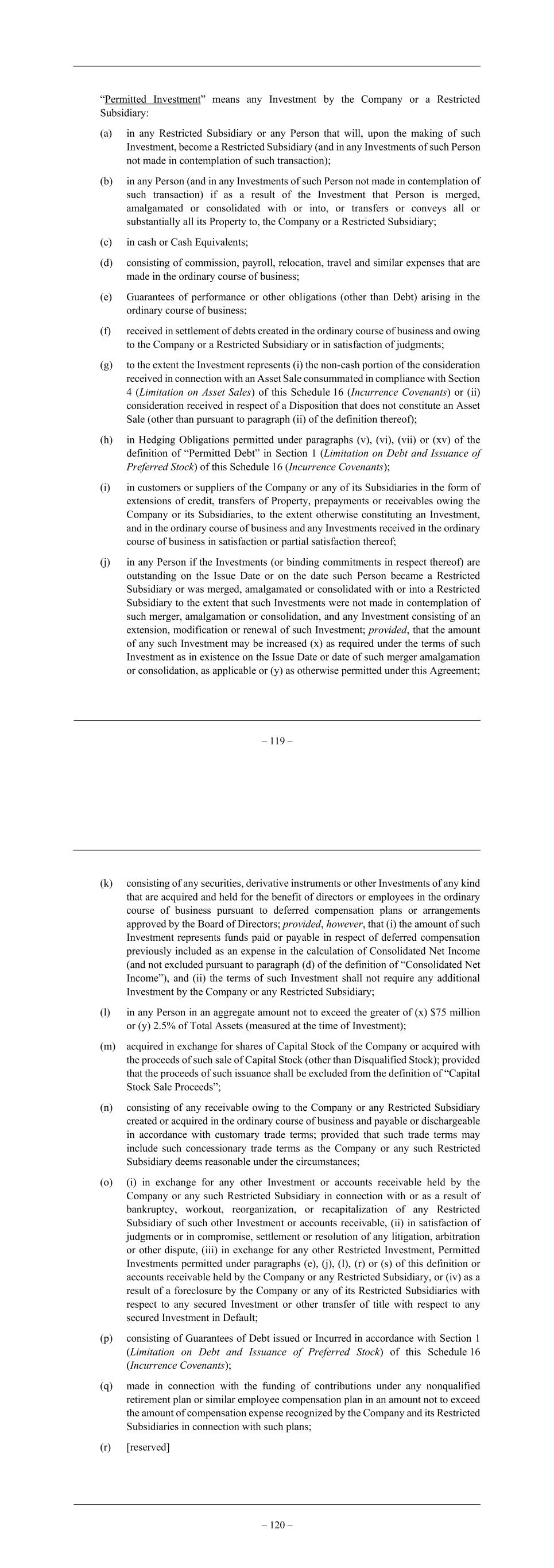 – 119 – “Permitted Investment” means any Investment by the Company or a Restricted Subsidiary: (a) in any Restricted Subsidiary or any Person that will, upon the making of such Investment, become a Restricted Subsidiary (and in any Investments of such Person not made in contemplation of such transaction); (b) in any Person (and in any Investments of such Person not made in contemplation of such transaction) if as a result of the Investment that Person is merged, amalgamated or consolidated with or into, or transfers or conveys all or substantially all its Property to, the Company or a Restricted Subsidiary; (c) in cash or Cash Equivalents; (d) consisting of commission, payroll, relocation, travel and similar expenses that are made in the ordinary course of business; (e) Guarantees of performance or other obligations (other than Debt) arising in the ordinary course of business; (f) received in settlement of debts created in the ordinary course of business and owing to the Company or a Restricted Subsidiary or in satisfaction of judgments; (g) to the extent the Investment represents (i) the non-cash portion of the consideration received in connection with an Asset Sale consummated in compliance with Section 4 (Limitation on Asset Sales) of this Schedule 16 (Incurrence Covenants) or (ii) consideration received in respect of a Disposition that does not constitute an Asset Sale (other than pursuant to paragraph (ii) of the definition thereof); (h) in Hedging Obligations permitted under paragraphs (v), (vi), (vii) or (xv) of the definition of “Permitted Debt” in Section 1 (Limitation on Debt and Issuance of Preferred Stock) of this Schedule 16 (Incurrence Covenants); (i) in customers or suppliers of the Company or any of its Subsidiaries in the form of extensions of credit, transfers of Property, prepayments or receivables owing the Company or its Subsidiaries, to the extent otherwise constituting an Investment, and in the ordinary course of business and any Investments received in the ordinary course of business in satisfaction or partial satisfaction thereof; (j) in any Person if the Investments (or binding commitments in respect thereof) are outstanding on the Issue Date or on the date such Person became a Restricted Subsidiary or was merged, amalgamated or consolidated with or into a Restricted Subsidiary to the extent that such Investments were not made in contemplation of such merger, amalgamation or consolidation, and any Investment consisting of an extension, modification or renewal of such Investment; provided, that the amount of any such Investment may be increased (x) as required under the terms of such Investment as in existence on the Issue Date or date of such merger amalgamation or consolidation, as applicable or (y) as otherwise permitted under this Agreement; – 120 – (k) consisting of any securities, derivative instruments or other Investments of any kind that are acquired and held for the benefit of directors or employees in the ordinary course of business pursuant to deferred compensation plans or arrangements approved by the Board of Directors; provided, however, that (i) the amount of such Investment represents funds paid or payable in respect of deferred compensation previously included as an expense in the calculation of Consolidated Net Income (and not excluded pursuant to paragraph (d) of the definition of “Consolidated Net Income”), and (ii) the terms of such Investment shall not require any additional Investment by the Company or any Restricted Subsidiary; (l) in any Person in an aggregate amount not to exceed the greater of (x) $75 million or (y) 2.5% of Total Assets (measured at the time of Investment); (m) acquired in exchange for shares of Capital Stock of the Company or acquired with the proceeds of such sale of Capital Stock (other than Disqualified Stock); provided that the proceeds of such issuance shall be excluded from the definition of “Capital Stock Sale Proceeds”; (n) consisting of any receivable owing to the Company or any Restricted Subsidiary created or acquired in the ordinary course of business and payable or dischargeable in accordance with customary trade terms; provided that such trade terms may include such concessionary trade terms as the Company or any such Restricted Subsidiary deems reasonable under the circumstances; (o) (i) in exchange for any other Investment or accounts receivable held by the Company or any such Restricted Subsidiary in connection with or as a result of bankruptcy, workout, reorganization, or recapitalization of any Restricted Subsidiary of such other Investment or accounts receivable, (ii) in satisfaction of judgments or in compromise, settlement or resolution of any litigation, arbitration or other dispute, (iii) in exchange for any other Restricted Investment, Permitted Investments permitted under paragraphs (e), (j), (l), (r) or (s) of this definition or accounts receivable held by the Company or any Restricted Subsidiary, or (iv) as a result of a foreclosure by the Company or any of its Restricted Subsidiaries with respect to any secured Investment or other transfer of title with respect to any secured Investment in Default; (p) consisting of Guarantees of Debt issued or Incurred in accordance with Section 1 (Limitation on Debt and Issuance of Preferred Stock) of this Schedule 16 (Incurrence Covenants); (q) made in connection with the funding of contributions under any nonqualified retirement plan or similar employee compensation plan in an amount not to exceed the amount of compensation expense recognized by the Company and its Restricted Subsidiaries in connection with such plans; (r) [reserved]