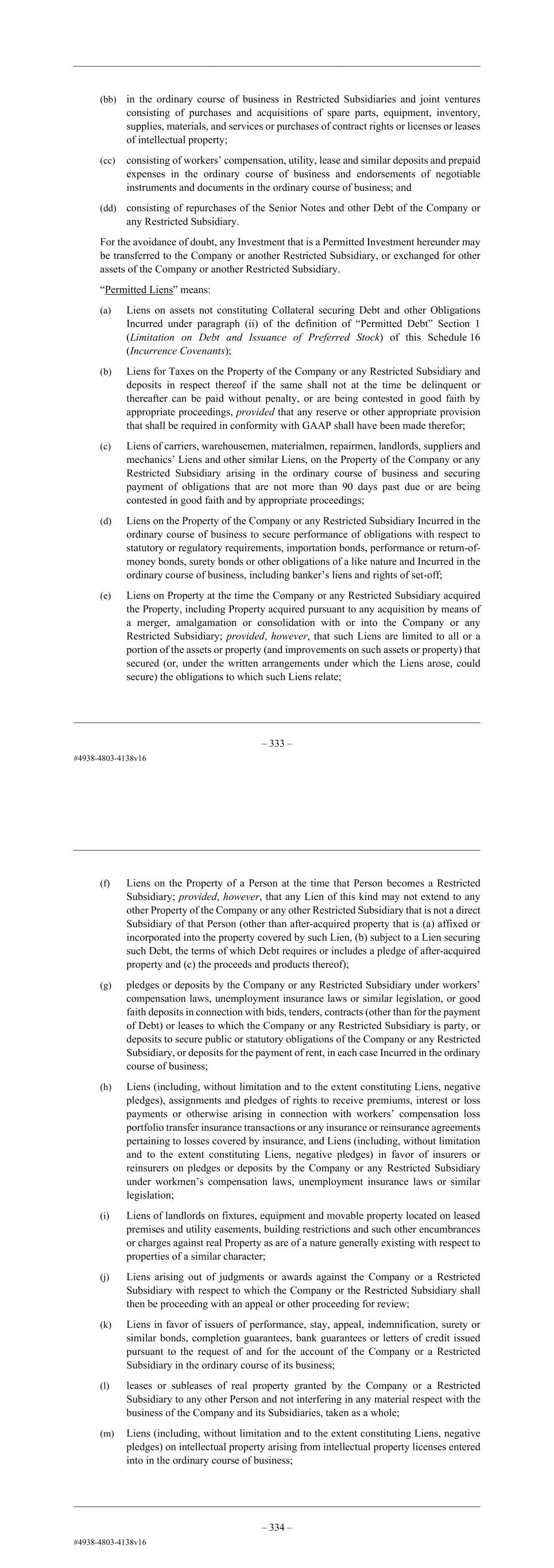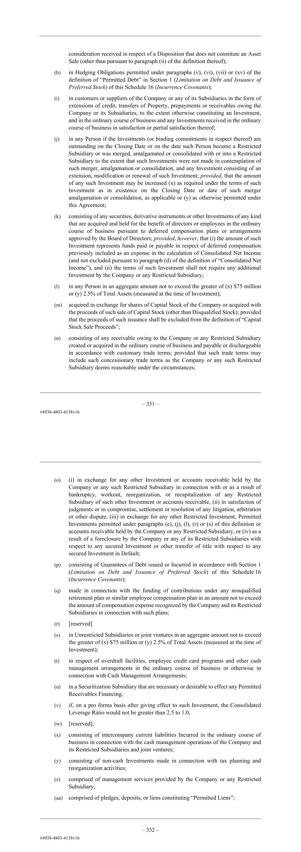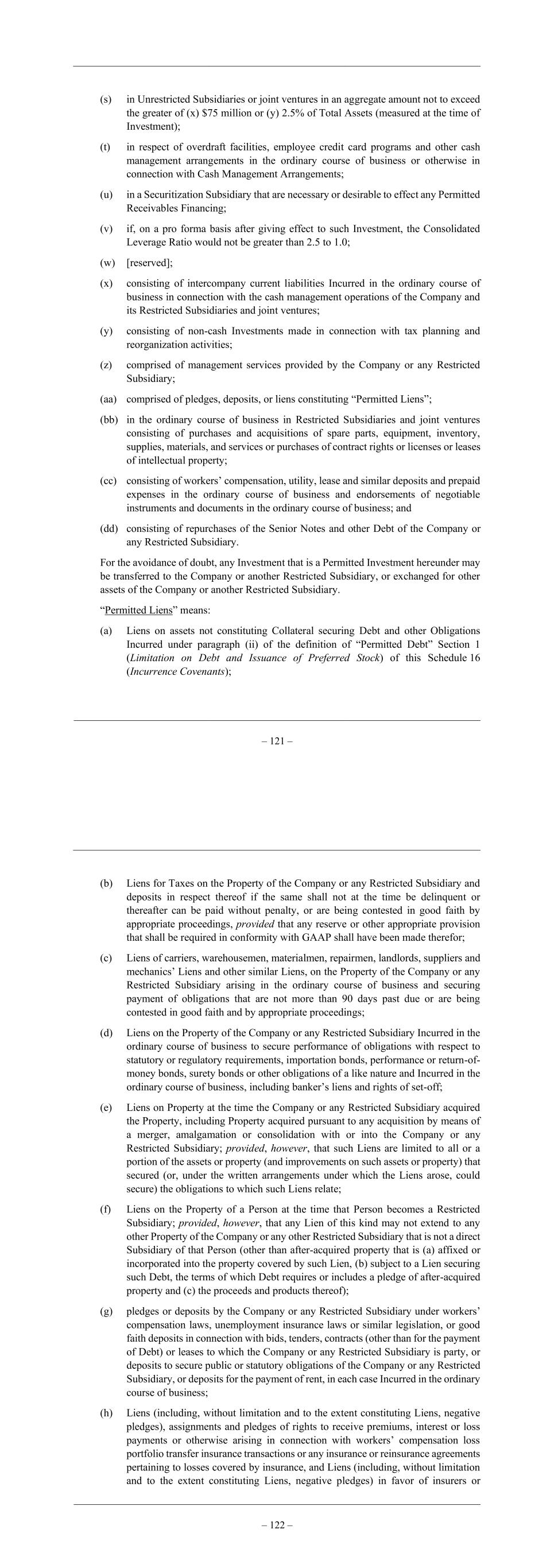 – 121 – (s) in Unrestricted Subsidiaries or joint ventures in an aggregate amount not to exceed the greater of (x) $75 million or (y) 2.5% of Total Assets (measured at the time of Investment); (t) in respect of overdraft facilities, employee credit card programs and other cash management arrangements in the ordinary course of business or otherwise in connection with Cash Management Arrangements; (u) in a Securitization Subsidiary that are necessary or desirable to effect any Permitted Receivables Financing; (v) if, on a pro forma basis after giving effect to such Investment, the Consolidated Leverage Ratio would not be greater than 2.5 to 1.0; (w) [reserved]; (x) consisting of intercompany current liabilities Incurred in the ordinary course of business in connection with the cash management operations of the Company and its Restricted Subsidiaries and joint ventures; (y) consisting of non-cash Investments made in connection with tax planning and reorganization activities; (z) comprised of management services provided by the Company or any Restricted Subsidiary; (aa) comprised of pledges, deposits, or liens constituting “Permitted Liens”; (bb) in the ordinary course of business in Restricted Subsidiaries and joint ventures consisting of purchases and acquisitions of spare parts, equipment, inventory, supplies, materials, and services or purchases of contract rights or licenses or leases of intellectual property; (cc) consisting of workers’ compensation, utility, lease and similar deposits and prepaid expenses in the ordinary course of business and endorsements of negotiable instruments and documents in the ordinary course of business; and (dd) consisting of repurchases of the Senior Notes and other Debt of the Company or any Restricted Subsidiary. For the avoidance of doubt, any Investment that is a Permitted Investment hereunder may be transferred to the Company or another Restricted Subsidiary, or exchanged for other assets of the Company or another Restricted Subsidiary. “Permitted Liens” means: (a) Liens on assets not constituting Collateral securing Debt and other Obligations Incurred under paragraph (ii) of the definition of “Permitted Debt” Section 1 (Limitation on Debt and Issuance of Preferred Stock) of this Schedule 16 (Incurrence Covenants); – 122 – (b) Liens for Taxes on the Property of the Company or any Restricted Subsidiary and deposits in respect thereof if the same shall not at the time be delinquent or thereafter can be paid without penalty, or are being contested in good faith by appropriate proceedings, provided that any reserve or other appropriate provision that shall be required in conformity with GAAP shall have been made therefor; (c) Liens of carriers, warehousemen, materialmen, repairmen, landlords, suppliers and mechanics’ Liens and other similar Liens, on the Property of the Company or any Restricted Subsidiary arising in the ordinary course of business and securing payment of obligations that are not more than 90 days past due or are being contested in good faith and by appropriate proceedings; (d) Liens on the Property of the Company or any Restricted Subsidiary Incurred in the ordinary course of business to secure performance of obligations with respect to statutory or regulatory requirements, importation bonds, performance or return-of- money bonds, surety bonds or other obligations of a like nature and Incurred in the ordinary course of business, including banker’s liens and rights of set-off; (e) Liens on Property at the time the Company or any Restricted Subsidiary acquired the Property, including Property acquired pursuant to any acquisition by means of a merger, amalgamation or consolidation with or into the Company or any Restricted Subsidiary; provided, however, that such Liens are limited to all or a portion of the assets or property (and improvements on such assets or property) that secured (or, under the written arrangements under which the Liens arose, could secure) the obligations to which such Liens relate; (f) Liens on the Property of a Person at the time that Person becomes a Restricted Subsidiary; provided, however, that any Lien of this kind may not extend to any other Property of the Company or any other Restricted Subsidiary that is not a direct Subsidiary of that Person (other than after-acquired property that is (a) affixed or incorporated into the property covered by such Lien, (b) subject to a Lien securing such Debt, the terms of which Debt requires or includes a pledge of after-acquired property and (c) the proceeds and products thereof); (g) pledges or deposits by the Company or any Restricted Subsidiary under workers’ compensation laws, unemployment insurance laws or similar legislation, or good faith deposits in connection with bids, tenders, contracts (other than for the payment of Debt) or leases to which the Company or any Restricted Subsidiary is party, or deposits to secure public or statutory obligations of the Company or any Restricted Subsidiary, or deposits for the payment of rent, in each case Incurred in the ordinary course of business; (h) Liens (including, without limitation and to the extent constituting Liens, negative pledges), assignments and pledges of rights to receive premiums, interest or loss payments or otherwise arising in connection with workers’ compensation loss portfolio transfer insurance transactions or any insurance or reinsurance agreements pertaining to losses covered by insurance, and Liens (including, without limitation and to the extent constituting Liens, negative pledges) in favor of insurers or