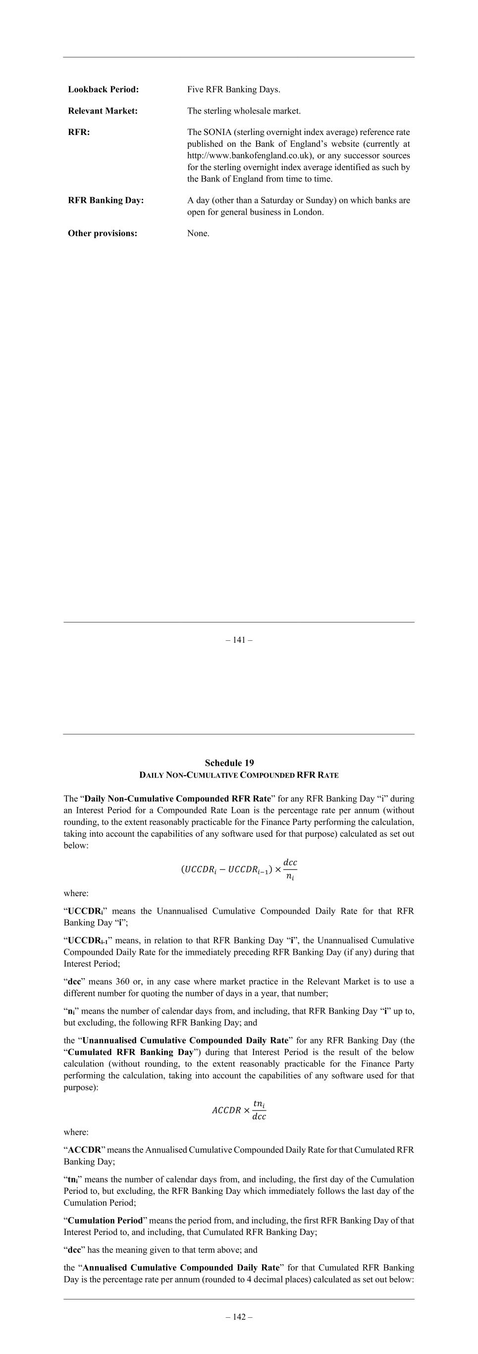 – 141 – Lookback Period: Five RFR Banking Days. Relevant Market: The sterling wholesale market. RFR: The SONIA (sterling overnight index average) reference rate published on the Bank of England’s website (currently at http://www.bankofengland.co.uk), or any successor sources for the sterling overnight index average identified as such by the Bank of England from time to time. RFR Banking Day: A day (other than a Saturday or Sunday) on which banks are open for general business in London. Other provisions: None. – 142 – Schedule 19 DAILY NON-CUMULATIVE COMPOUNDED RFR RATE The “Daily Non-Cumulative Compounded RFR Rate” for any RFR Banking Day “i” during an Interest Period for a Compounded Rate Loan is the percentage rate per annum (without rounding, to the extent reasonably practicable for the Finance Party performing the calculation, taking into account the capabilities of any software used for that purpose) calculated as set out below: (𝑈𝐶𝐶𝐷𝑅𝑖 − 𝑈𝐶𝐶𝐷𝑅𝑖−1) × 𝑑𝑐𝑐 𝑛𝑖 where: “UCCDRi” means the Unannualised Cumulative Compounded Daily Rate for that RFR Banking Day “i”; “UCCDRi-1” means, in relation to that RFR Banking Day “i”, the Unannualised Cumulative Compounded Daily Rate for the immediately preceding RFR Banking Day (if any) during that Interest Period; “dcc” means 360 or, in any case where market practice in the Relevant Market is to use a different number for quoting the number of days in a year, that number; “ni” means the number of calendar days from, and including, that RFR Banking Day “i” up to, but excluding, the following RFR Banking Day; and the “Unannualised Cumulative Compounded Daily Rate” for any RFR Banking Day (the “Cumulated RFR Banking Day”) during that Interest Period is the result of the below calculation (without rounding, to the extent reasonably practicable for the Finance Party performing the calculation, taking into account the capabilities of any software used for that purpose): 𝐴𝐶𝐶𝐷𝑅 × 𝑡𝑛𝑖 𝑑𝑐𝑐 where: “ACCDR” means the Annualised Cumulative Compounded Daily Rate for that Cumulated RFR Banking Day; “tni” means the number of calendar days from, and including, the first day of the Cumulation Period to, but excluding, the RFR Banking Day which immediately follows the last day of the Cumulation Period; “Cumulation Period” means the period from, and including, the first RFR Banking Day of that Interest Period to, and including, that Cumulated RFR Banking Day; “dcc” has the meaning given to that term above; and the “Annualised Cumulative Compounded Daily Rate” for that Cumulated RFR Banking Day is the percentage rate per annum (rounded to 4 decimal places) calculated as set out below: