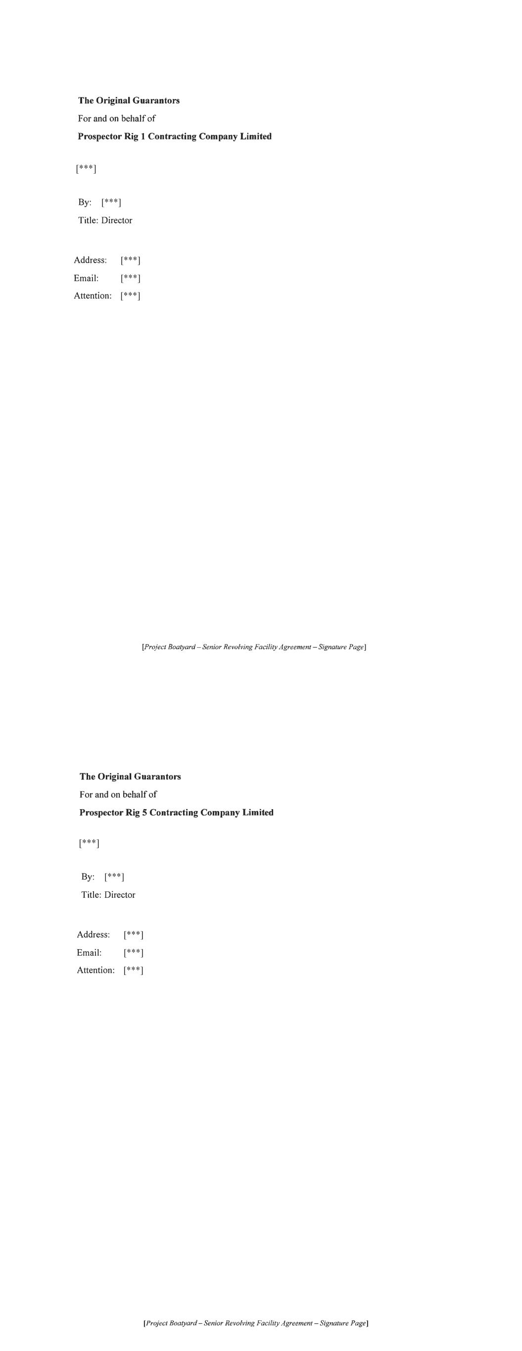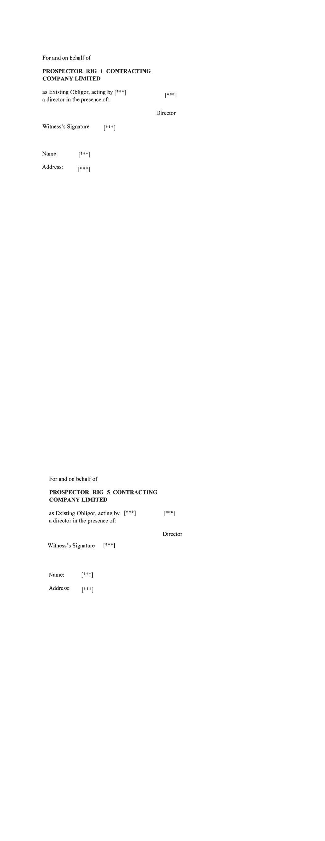 For and on behalf of PROSPECTOR RIG 1 CONTRACTING COMPANY LIMITED as Existing Ob1igor, acting by a director in the presence of: Witness's Signature Name: Director Address: [***] [***] [***] [***] [***] For and on behalf of PROSPECTOR RIG 5 CONTRACTING COMP ANY LIMITED as Existing Obligor, acting by a director in the presence of: Name: Director Address: Witness's Signature [***] [***] [***] [***] [***]