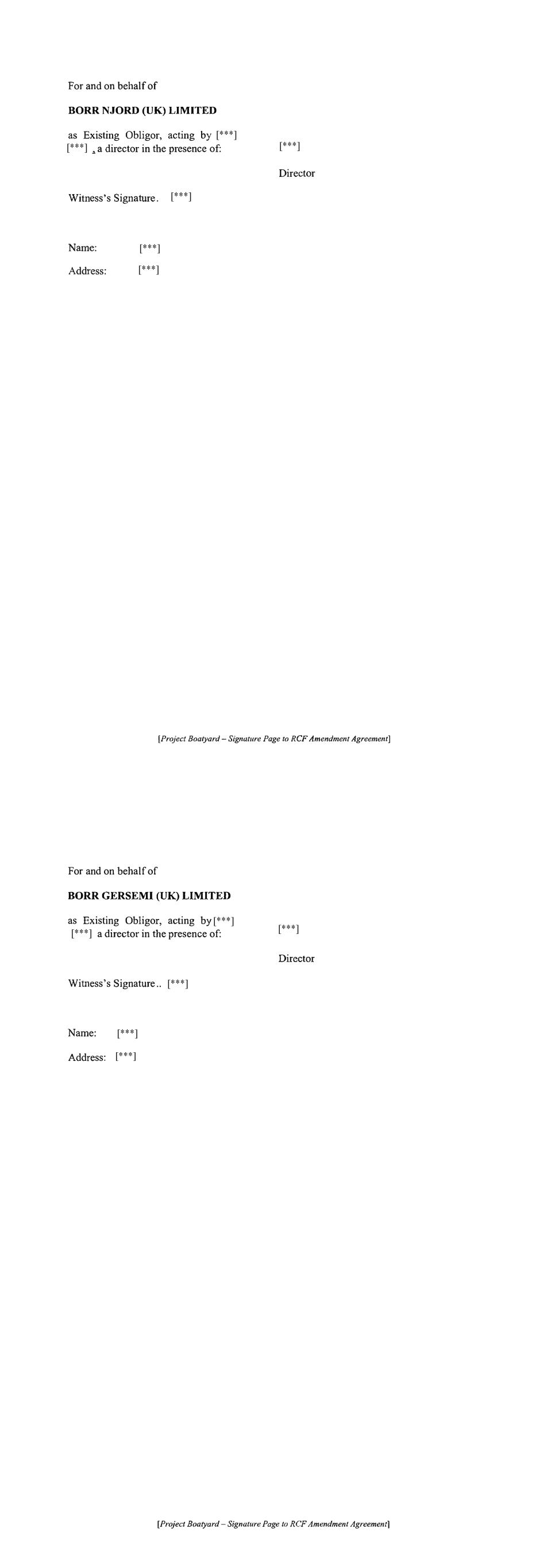 For and on behalf of BORR NJORD (UK) LIMITED as Existing Obligor, acting by , a director in the presence of: Witness's Signature . Director Name: Address: [Project Boatyard- Signature Page to RCF Amendment Agreement] [***] [***] [***] [***] [***] [***] For and on behalf of BORR GERSEMI (UK) LIMITED as Existing Obligor, acting by a director in the presence of: Director Witness's Signature .. Name: Address: [Project Boatyard - Signature Page to RCF Amendment Agreement] [***] [***] [***] [***] [***] [***]