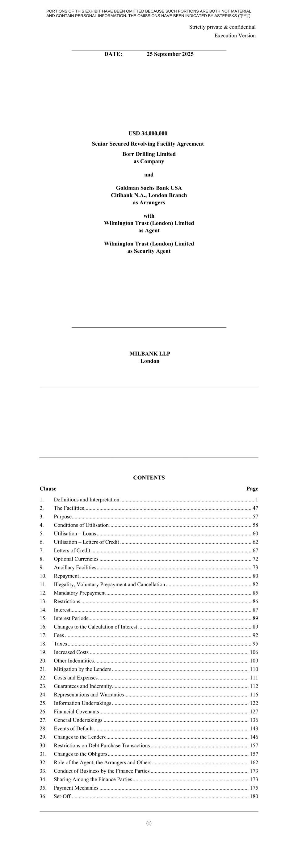 4910-0705-9804 AMENDMENT AGREEMENT dated ______________ 2025 relating to the super senior revolving facility agreement originally dated 7 November 2023 made between BORR DRILLING LIMITED as Company DNB BANK ASA as Agent WILMINGTON TRUST (LONDON) LIMITED as Security Agent and others 25 September PORTIONS OF THIS EXHIBIT HAVE BEEN OMITTED BECAUSE SUCH PORTIONS ARE BOTH NOT MATERIAL AND CONTAIN PERSONAL INFORMATION. THE OMISSIONS HAVE BEEN INDICATED BY ASTERISKS ("[***]") CONTENTS Clause Page 1. Definitions and Interpretation ................................................................................................ 2 2. Amendments ......................................................................................................................... 3 3. Representations ..................................................................................................................... 3 4. Guarantee and Security Confirmations .................................................................................. 4 5. DNB Guarantee Facility ........................................................................................................ 4 6. Miscellaneous ....................................................................................................................... 4 7. Governing law ...................................................................................................................... 5 Schedule 1 Existing Obligors .................................................................................................. 6 Schedule 2 Third Party Security Providers............................................................................... 8 Schedule 3 Conditions Precedent to the Effective Date ............................................................ 9 Schedule 4 Liberia and Vanuatu Rig Mortgages .................................................................... 13 Schedule 5 Amended Facility Agreement .............................................................................. 16