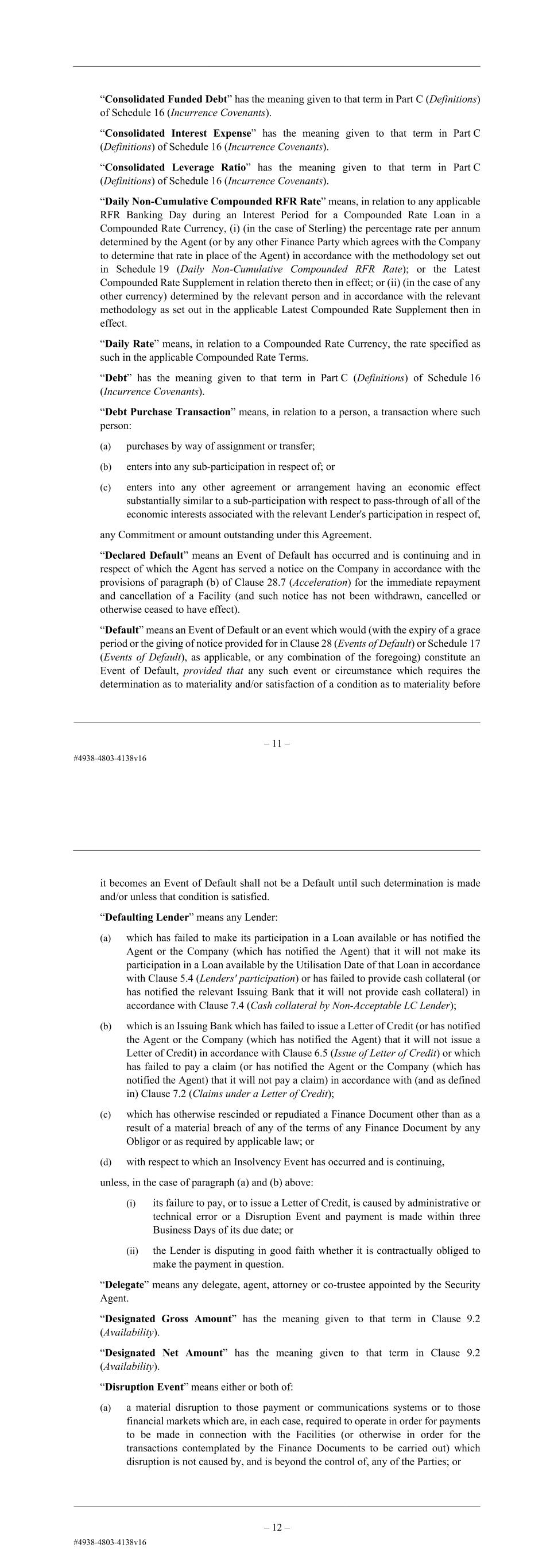 – 12 – “Daily Rate” means, in relation to a Compounded Rate Currency, the rate specified as such in the applicable Compounded Rate Terms. “Debt Purchase Transaction” means, in relation to a person, a transaction where such person: (a) purchases by way of assignment or transfer; (b) enters into any sub-participation in respect of; or (c) enters into any other agreement or arrangement having an economic effect substantially similar to a sub-participation with respect to pass-through of all of the economic interests associated with the relevant Lender's participation in respect of, any Commitment or amount outstanding under this Agreement. “Declared Default” means an Event of Default has occurred and is continuing and in respect of which the Agent has served a notice on the Company in accordance with the provisions of paragraph (b) of Clause 28.7 (Acceleration) for the immediate repayment and cancellation of a Facility (and such notice has not been withdrawn, cancelled or otherwise ceased to have effect). “Default” means an Event of Default or an event which would (with the expiry of a grace period or the giving of notice provided for in Clause 28 (Events of Default) or Schedule 17 (Events of Default), as applicable, or any combination of the foregoing) constitute an Event of Default, provided that any such event or circumstance which requires the determination as to materiality and/or satisfaction of a condition as to materiality before it becomes an Event of Default shall not be a Default until such determination is made and/or unless that condition is satisfied. “Defaulting Lender” means any Lender: (a) which has failed to make its participation in a Loan available or has notified the Agent or the Company (which has notified the Agent) that it will not make its participation in a Loan available by the Utilisation Date of that Loan in accordance with Clause 5.4 (Lenders' participation) or has failed to provide cash collateral (or has notified the relevant Issuing Bank that it will not provide cash collateral) in accordance with Clause 7.4 (Cash collateral by Non-Acceptable LC Lender); (b) which is an Issuing Bank which has failed to issue a Letter of Credit (or has notified the Agent or the Company (which has notified the Agent) that it will not issue a Letter of Credit) in accordance with Clause 6.5 (Issue of Letter of Credit) or which has failed to pay a claim (or has notified the Agent or the Company (which has notified the Agent) that it will not pay a claim) in accordance with (and as defined in) Clause 7.2 (Claims under a Letter of Credit); (c) which has otherwise rescinded or repudiated a Finance Document other than as a result of a material breach of any of the terms of any Finance Document by any Obligor or as required by applicable law; or (d) with respect to which an Insolvency Event has occurred and is continuing, – 13 – unless, in the case of paragraph (a) and (b) above: (i) its failure to pay, or to issue a Letter of Credit, is caused by administrative or technical error or a Disruption Event and payment is made within three Business Days of its due date; or (ii) the Lender is disputing in good faith whether it is contractually obliged to make the payment in question. “Delegate” means any delegate, agent, attorney or co-trustee appointed by the Security Agent. “Designated Gross Amount” has the meaning given to that term in Clause 9.2 (Availability). “Designated Net Amount” has the meaning given to that term in Clause 9.2 (Availability). “Disruption Event” means either or both of: (a) a material disruption to those payment or communications systems or to those financial markets which are, in each case, required to operate in order for payments to be made in connection with the Facilities (or otherwise in order for the transactions contemplated by the Finance Documents to be carried out) which disruption is not caused by, and is beyond the control of, any of the Parties; or (b) the occurrence of any other event which results in a disruption (of a technical or systems-related nature) to the treasury or payments operations of a Party preventing that, or any other Party: (i) from performing its payment obligations under the Finance Documents; or (ii) from communicating with other Parties in accordance with the terms of the Finance Documents, and which (in either such case) is not caused by, and is beyond the control of, the Party whose operations are disrupted. “EEA Member Country” means any member state of the European Union, Iceland, Liechtenstein and Norway. “Environment” means humans, animals, plants and all other living organisms including the ecological systems of which they form part and the following media: (a) air (including, without limitation, air within natural or man-made structures, whether above or below ground); (b) water (including, without limitation, territorial, coastal and inland waters, water under or within land and water in drains and sewers); and (c) land (including, without limitation, land under water).
