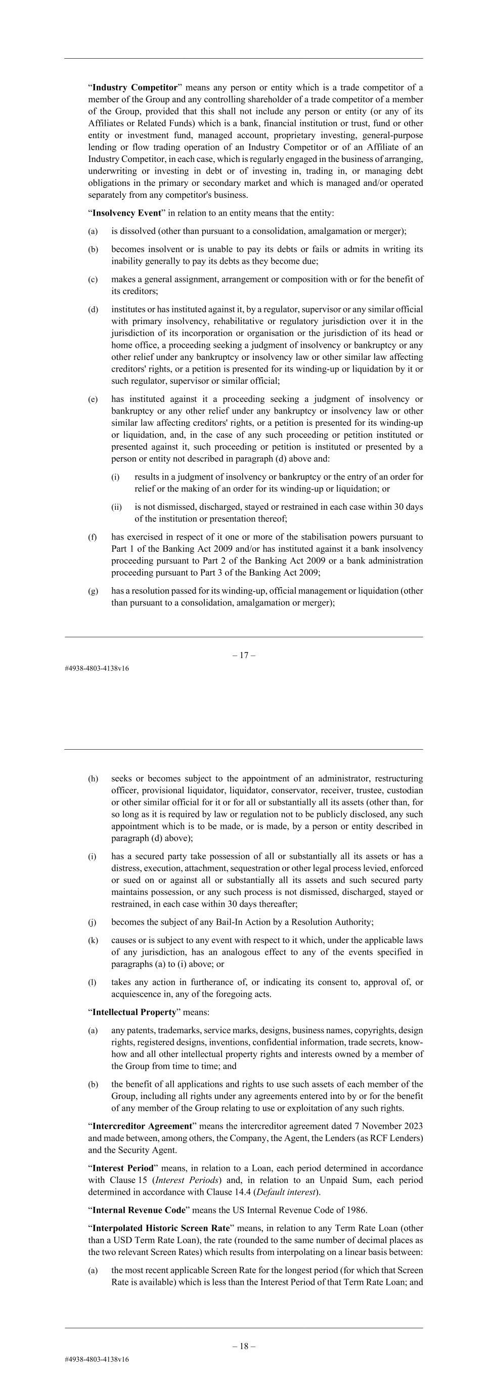– 18 – “IFRS” means international accounting standards within the meaning of IAS Regulation 1606/2002 to the extent applicable to the relevant financial statements. “Impaired Agent” means the Agent at any time when: (a) it has failed to make (or has notified a Party that it will not make) a payment required to be made by it under the Finance Documents by the due date for payment; (b) the Agent otherwise rescinds or repudiates a Finance Document; (c) (if the Agent is also a Lender) it is a Defaulting Lender under paragraphs (a), (b) or (c) of the definition of “Defaulting Lender”; or (d) an Insolvency Event has occurred and is continuing with respect to the Agent, unless, in the case of paragraph (a) above: (i) its failure to pay is caused by administrative or technical error or a Disruption Event and payment is made within three Business Days of its due date; or (ii) the Agent is disputing in good faith whether it is contractually obliged to make the payment in question. “Increase Confirmation” means a confirmation substantially in the form set out in Schedule 12 (Form of Increase Confirmation) or in any other form agreed between the Agent and the Company (acting reasonably). “Increase Lender” has the meaning given to that term in Clause 2.3 (Increase). “Increased Costs Lender” means a Lender to whom any Obligor becomes obligated to any amount pursuant to Clause 11.1 (Illegality), Clause 16.2 (Market disruption), Clause 18 (Taxes) or Clause 19 (Increased Costs). “Industry Competitor” means any person or entity which is a trade competitor of a member of the Group and any controlling shareholder of a trade competitor of a member of the Group, provided that this shall not include any person or entity (or any of its Affiliates or Related Funds) which is a bank, financial institution or trust, fund or other entity or investment fund, managed account, proprietary investing, general-purpose lending or flow trading operation of an Industry Competitor or of an Affiliate of an Industry Competitor, in each case, which is regularly engaged in the business of arranging, underwriting or investing in debt or of investing in, trading in, or managing debt obligations in the primary or secondary market and which is managed and/or operated separately from any competitor's business. “Insolvency Event” in relation to an entity means that the entity: (a) is dissolved (other than pursuant to a consolidation, amalgamation or merger); (b) becomes insolvent or is unable to pay its debts or fails or admits in writing its inability generally to pay its debts as they become due; (c) makes a general assignment, arrangement or composition with or for the benefit of its creditors; – 19 – (d) institutes or has instituted against it, by a regulator, supervisor or any similar official with primary insolvency, rehabilitative or regulatory jurisdiction over it in the jurisdiction of its incorporation or organisation or the jurisdiction of its head or home office, a proceeding seeking a judgment of insolvency or bankruptcy or any other relief under any bankruptcy or insolvency law or other similar law affecting creditors' rights, or a petition is presented for its winding-up or liquidation by it or such regulator, supervisor or similar official; (e) has instituted against it a proceeding seeking a judgment of insolvency or bankruptcy or any other relief under any bankruptcy or insolvency law or other similar law affecting creditors' rights, or a petition is presented for its winding-up or liquidation, and, in the case of any such proceeding or petition instituted or presented against it, such proceeding or petition is instituted or presented by a person or entity not described in paragraph (d) above and: (i) results in a judgment of insolvency or bankruptcy or the entry of an order for relief or the making of an order for its winding-up or liquidation; or (ii) is not dismissed, discharged, stayed or restrained in each case within 30 days of the institution or presentation thereof; (f) has exercised in respect of it one or more of the stabilisation powers pursuant to Part 1 of the Banking Act 2009 and/or has instituted against it a bank insolvency proceeding pursuant to Part 2 of the Banking Act 2009 or a bank administration proceeding pursuant to Part 3 of the Banking Act 2009; (g) has a resolution passed for its winding-up, official management or liquidation (other than pursuant to a consolidation, amalgamation or merger); (h) seeks or becomes subject to the appointment of an administrator, restructuring officer, provisional liquidator, liquidator, conservator, receiver, trustee, custodian or other similar official for it or for all or substantially all its assets (other than, for so long as it is required by law or regulation not to be publicly disclosed, any such appointment which is to be made, or is made, by a person or entity described in paragraph (d) above); (i) has a secured party take possession of all or substantially all its assets or has a distress, execution, attachment, sequestration or other legal process levied, enforced or sued on or against all or substantially all its assets and such secured party maintains possession, or any such process is not dismissed, discharged, stayed or restrained, in each case within 30 days thereafter; (j) becomes the subject of any Bail-In Action by a Resolution Authority; (k) causes or is subject to any event with respect to it which, under the applicable laws of any jurisdiction, has an analogous effect to any of the events specified in paragraphs (a) to (i) above; or (l) takes any action in furtherance of, or indicating its consent to, approval of, or acquiescence in, any of the foregoing acts.