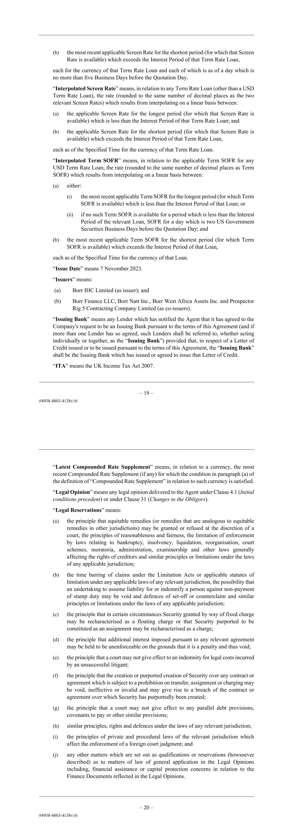 – 20 – “Intellectual Property” means: (a) any patents, trademarks, service marks, designs, business names, copyrights, design rights, registered designs, inventions, confidential information, trade secrets, know- how and all other intellectual property rights and interests owned by a member of the Group from time to time; and (b) the benefit of all applications and rights to use such assets of each member of the Group, including all rights under any agreements entered into by or for the benefit of any member of the Group relating to use or exploitation of any such rights. “Intercreditor Agreement” means the intercreditor agreement dated on around the date hereof and made between, among others, the Company, the Agent, the Lenders (as RCF Lenders), the Original Obligors and the Security Agent. “Interest Period” means, in relation to a Loan, each period determined in accordance with Clause 15 (Interest Periods) and, in relation to an Unpaid Sum, each period determined in accordance with Clause 14.4 (Default interest). “Internal Revenue Code” means the US Internal Revenue Code of 1986. “Interpolated Historic Screen Rate” means, in relation to any Term Rate Loan (other than a USD Term Rate Loan), the rate (rounded to the same number of decimal places as the two relevant Screen Rates) which results from interpolating on a linear basis between: (a) the most recent applicable Screen Rate for the longest period (for which that Screen Rate is available) which is less than the Interest Period of that Term Rate Loan; and (b) the most recent applicable Screen Rate for the shortest period (for which that Screen Rate is available) which exceeds the Interest Period of that Term Rate Loan, each for the currency of that Term Rate Loan and each of which is as of a day which is no more than five Business Days before the Quotation Day. “Interpolated Screen Rate” means, in relation to any Term Rate Loan (other than a USD Term Rate Loan), the rate (rounded to the same number of decimal places as the two relevant Screen Rates) which results from interpolating on a linear basis between: (a) the applicable Screen Rate for the longest period (for which that Screen Rate is available) which is less than the Interest Period of that Term Rate Loan; and (b) the applicable Screen Rate for the shortest period (for which that Screen Rate is available) which exceeds the Interest Period of that Term Rate Loan, each as of the Specified Time for the currency of that Term Rate Loan. “Interpolated Term SOFR” means, in relation to the applicable Term SOFR for any USD Term Rate Loan, the rate (rounded to the same number of decimal places as Term SOFR) which results from interpolating on a linear basis between: (a) either: – 21 – (i) the most recent applicable Term SOFR for the longest period (for which Term SOFR is available) which is less than the Interest Period of that Loan; or (ii) if no such Term SOFR is available for a period which is less than the Interest Period of the relevant Loan, SOFR for a day which is two US Government Securities Business Days before the Quotation Day; and (b) the most recent applicable Term SOFR for the shortest period (for which Term SOFR is available) which exceeds the Interest Period of that Loan, each as of the Specified Time for the currency of that Loan. “Issue Date” has the meaning given to that term in the Original Senior Secured Notes Indenture. “Issuers” means: (a) Borr IHC Limited (as issuer); and (b) Borr Finance LLC, Borr Natt Inc., Borr West Africa Assets Inc. and Prospector Rig 5 Contracting Company Limited (as co-issuers). “Issuing Bank” means any Lender which has notified the Agent that it has agreed to the Company's request to be an Issuing Bank pursuant to the terms of this Agreement (and if more than one Lender has so agreed, such Lenders shall be referred to, whether acting individually or together, as the “Issuing Bank”) provided that, in respect of a Letter of Credit issued or to be issued pursuant to the terms of this Agreement, the “Issuing Bank” shall be the Issuing Bank which has issued or agreed to issue that Letter of Credit. “ITA” means the UK Income Tax Act 2007. “Latest Compounded Rate Supplement” means, in relation to a currency, the most recent Compounded Rate Supplement (if any) for which the condition in paragraph (a) of the definition of “Compounded Rate Supplement” in relation to such currency is satisfied. “Legal Opinion” means any legal opinion delivered to the Agent under Clause 4.1 (Initial conditions precedent) or under Clause 31 (Changes to the Obligors). “Legal Reservations” means: (a) the principle that equitable remedies (or remedies that are analogous to equitable remedies in other jurisdictions) may be granted or refused at the discretion of a court, the principles of reasonableness and fairness, the limitation of enforcement by laws relating to bankruptcy, insolvency, liquidation, reorganisation, court schemes, moratoria, administration, examinership and other laws generally affecting the rights of creditors and similar principles or limitations under the laws of any applicable jurisdiction; (b) the time barring of claims under the Limitation Acts or applicable statutes of limitation under any applicable laws of any relevant jurisdiction, the possibility that an undertaking to assume liability for or indemnify a person against non-payment