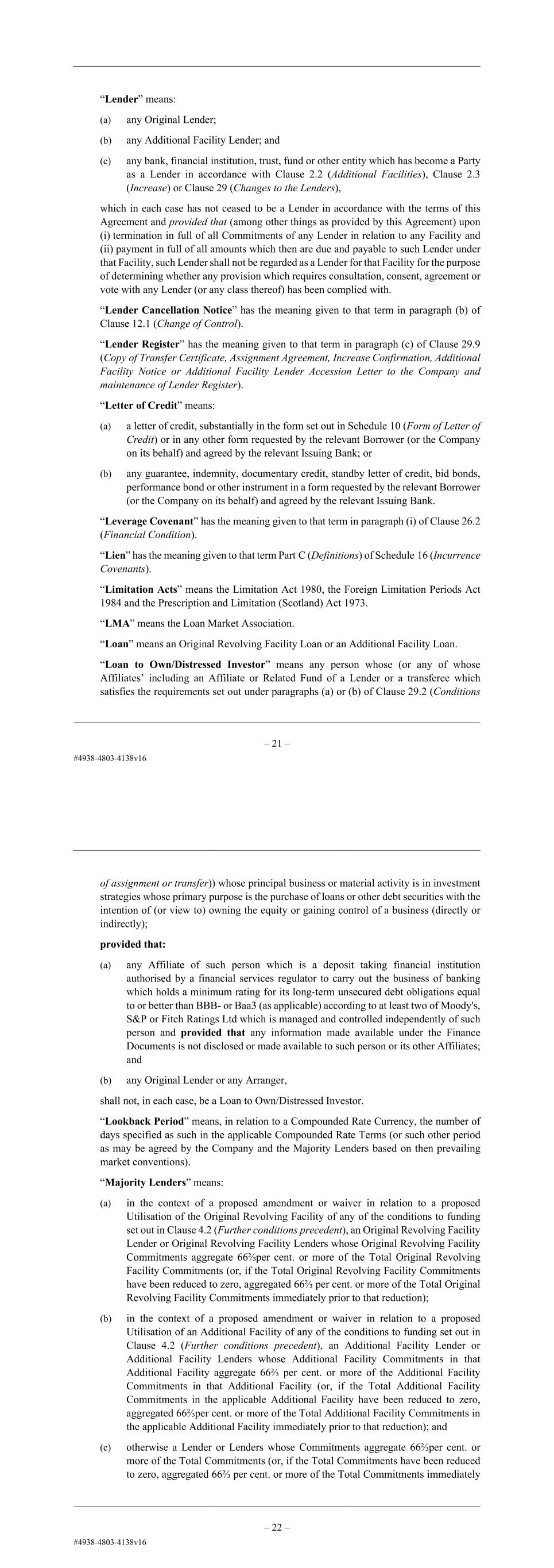 – 22 – of stamp duty may be void and defences of set-off or counterclaim and similar principles or limitations under the laws of any applicable jurisdiction; (c) the principle that in certain circumstances Security granted by way of fixed charge may be recharacterised as a floating charge or that Security purported to be constituted as an assignment may be recharacterised as a charge; (d) the principle that additional interest imposed pursuant to any relevant agreement may be held to be unenforceable on the grounds that it is a penalty and thus void; (e) the principle that a court may not give effect to an indemnity for legal costs incurred by an unsuccessful litigant; (f) the principle that the creation or purported creation of Security over any contract or agreement which is subject to a prohibition on transfer, assignment or charging may be void, ineffective or invalid and may give rise to a breach of the contract or agreement over which Security has purportedly been created; (g) the principle that a court may not give effect to any parallel debt provisions, covenants to pay or other similar provisions; (h) similar principles, rights and defences under the laws of any relevant jurisdiction; (i) the principles of private and procedural laws of the relevant jurisdiction which affect the enforcement of a foreign court judgment; and (j) any other matters which are set out as qualifications or reservations (howsoever described) as to matters of law of general application in the Legal Opinions including, financial assistance or capital protection concerns in relation to the Finance Documents reflected in the Legal Opinions. “Lender” means: (a) any Original Lender; (b) any Additional Facility Lender; and (c) any bank, financial institution, trust, fund or other entity which has become a Party as a Lender in accordance with Clause 2.2 (Additional Facilities), Clause 2.3 (Increase) or Clause 29 (Changes to the Lenders), which in each case has not ceased to be a Lender in accordance with the terms of this Agreement and provided that (among other things as provided by this Agreement) upon (i) termination in full of all Commitments of any Lender in relation to any Facility and (ii) payment in full of all amounts which then are due and payable to such Lender under that Facility, such Lender shall not be regarded as a Lender for that Facility for the purpose of determining whether any provision which requires consultation, consent, agreement or vote with any Lender (or any class thereof) has been complied with. “Lender Cancellation Notice” has the meaning given to that term in paragraph (b) of Clause 12.1 (Change of Control). – 23 – “Lender Register” has the meaning given to that term in paragraph (c) of Clause 29.9 (Copy of Transfer Certificate, Assignment Agreement, Increase Confirmation, Additional Facility Notice or Additional Facility Lender Accession Letter to the Company and maintenance of Lender Register). “Letter of Credit” means: (a) a letter of credit, substantially in the form set out in Schedule 10 (Form of Letter of Credit) or in any other form requested by the relevant Borrower (or the Company on its behalf) and agreed by the relevant Issuing Bank; or (b) any guarantee, indemnity, documentary credit, standby letter of credit, bid bonds, performance bond or other instrument in a form requested by the relevant Borrower (or the Company on its behalf) and agreed by the relevant Issuing Bank. “Leverage Covenant” has the meaning given to that term in paragraph (i) of Clause 26.2 (Financial Condition). “Lien” has the meaning given to that term Part C (Definitions) of Schedule 16 (Incurrence Covenants). “Limitation Acts” means the Limitation Act 1980, the Foreign Limitation Periods Act 1984 and the Prescription and Limitation (Scotland) Act 1973. “LMA” means the Loan Market Association. “Loan” means an Original Revolving Facility Loan or an Additional Facility Loan. “Loan to Own/Distressed Investor” means any person whose (or any of whose Affiliates’ including an Affiliate or Related Fund of a Lender or a transferee which satisfies the requirements set out under paragraphs (a) or (b) of Clause 29.2 (Conditions of assignment or transfer)) whose principal business or material activity is in investment strategies whose primary purpose is the purchase of loans or other debt securities with the intention of (or view to) owning the equity or gaining control of a business (directly or indirectly); provided that: (a) any Affiliate of such person which is a deposit taking financial institution authorised by a financial services regulator to carry out the business of banking which holds a minimum rating for its long-term unsecured debt obligations equal to or better than BBB- or Baa3 (as applicable) according to at least two of Moody's, S&P or Fitch Ratings Ltd which is managed and controlled independently of such person and provided that any information made available under the Finance Documents is not disclosed or made available to such person or its other Affiliates; and (b) any Original Lender or any Arranger, shall not, in each case, be a Loan to Own/Distressed Investor.