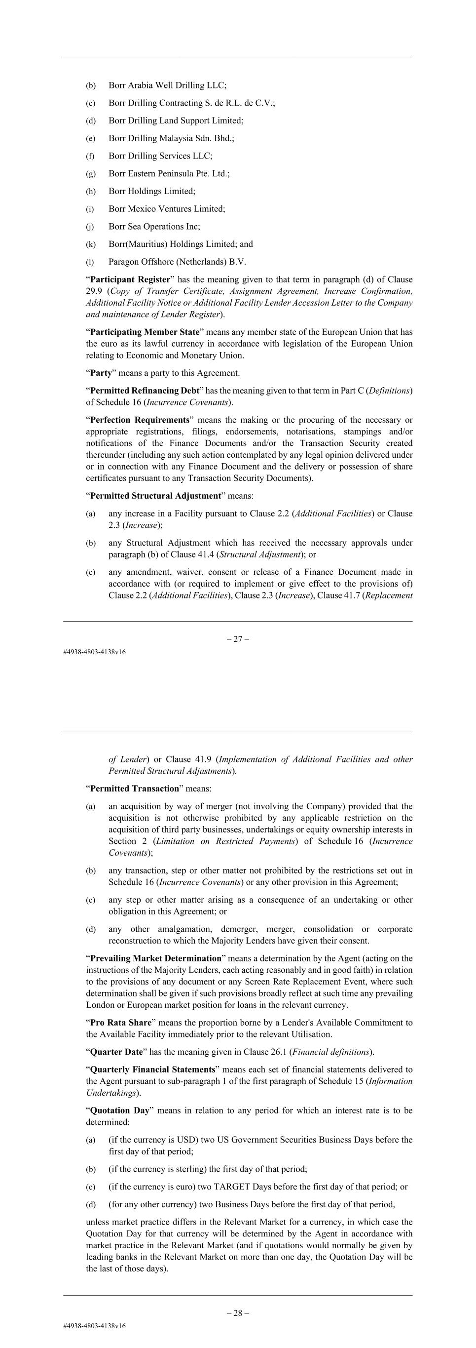– 30 – (b) in relation to any other Lender, the amount in the Base Currency of any Original Revolving Facility Commitment transferred to it under this Agreement or assumed by it in accordance with Clause 2.2 (Additional Facilities) or Clause 2.3 (Increase), to the extent not cancelled, reduced or transferred by it under this Agreement. “Original Revolving Facility Lender” means any Lender who makes available an Original Revolving Facility Commitment or an Original Revolving Facility Loan. “Original Revolving Facility Loan” means a loan made or to be made under the Original Revolving Facility or the principal amount outstanding for the time being of that loan. “Original Senior Secured Notes” has the meaning given to that term in the Intercreditor Agreement. “Original Senior Secured Notes Indenture” has the meaning given to that term in the Intercreditor Agreement. “Original Third Party Security Providers” means: (a) Borr Arabia Well Drilling LLC; (b) Borr Drilling Contracting S. de R.L. de C.V.; (c) Borr Drilling Land Support Limited; (d) Borr Drilling Malaysia Sdn. Bhd.; (e) Borr Drilling Services LLC; (f) Borr Eastern Peninsula Pte. Ltd.; (g) Borr Holdings Limited; (h) Borr Mexico Ventures Limited; (i) Borr (UK) Holdings Limited; (j) Borr Sea Operations Inc; and (k) Paragon Offshore (Netherlands) B.V. “Participant Register” has the meaning given to that term in paragraph (d) of Clause 29.9 (Copy of Transfer Certificate, Assignment Agreement, Increase Confirmation, Additional Facility Notice or Additional Facility Lender Accession Letter to the Company and maintenance of Lender Register). “Participating Member State” means any member state of the European Union that has the euro as its lawful currency in accordance with legislation of the European Union relating to Economic and Monetary Union. “Party” means a party to this Agreement. “Permitted Refinancing Debt” has the meaning given to that term in Part C (Definitions) of Schedule 16 (Incurrence Covenants). – 31 – “Perfection Requirements” means the making or the procuring of the necessary or appropriate registrations, filings, endorsements, notarisations, stampings and/or notifications of the Finance Documents and/or the Transaction Security created thereunder (including any such action contemplated by any legal opinion delivered under or in connection with any Finance Document and the delivery or possession of share certificates pursuant to any Transaction Security Documents). “Permitted Structural Adjustment” means: (a) any increase in a Facility pursuant to Clause 2.2 (Additional Facilities) or Clause 2.3 (Increase); (b) any Structural Adjustment which has received the necessary approvals under paragraph (b) of Clause 41.4 (Structural Adjustment); or (c) any amendment, waiver, consent or release of a Finance Document made in accordance with (or required to implement or give effect to the provisions of) Clause 2.2 (Additional Facilities), Clause 2.3 (Increase), Clause 41.7 (Replacement of Lender) or Clause 41.9 (Implementation of Additional Facilities and other Permitted Structural Adjustments). “Permitted Transaction” means: (a) an acquisition by way of merger (not involving the Company) provided that the acquisition is not otherwise prohibited by any applicable restriction on the acquisition of third party businesses, undertakings or equity ownership interests in Section 2 (Limitation on Restricted Payments) of Schedule 16 (Incurrence Covenants); (b) any transaction, step or other matter not prohibited by the restrictions set out in Schedule 16 (Incurrence Covenants) or any other provision in this Agreement; (c) any step or other matter arising as a consequence of an undertaking or other obligation in this Agreement; or (d) any other amalgamation, demerger, merger, consolidation or corporate reconstruction to which the Majority Lenders have given their consent. “Prevailing Market Determination” means a determination by the Agent (acting on the instructions of the Majority Lenders, each acting reasonably and in good faith) in relation to the provisions of any document or any Screen Rate Replacement Event, where such determination shall be given if such provisions broadly reflect at such time any prevailing London or European market position for loans in the relevant currency. “Pro Rata Share” means the proportion borne by a Lender's Available Commitment to the Available Facility immediately prior to the relevant Utilisation. “Quarter Date” has the meaning given in Clause 26.1 (Financial definitions).