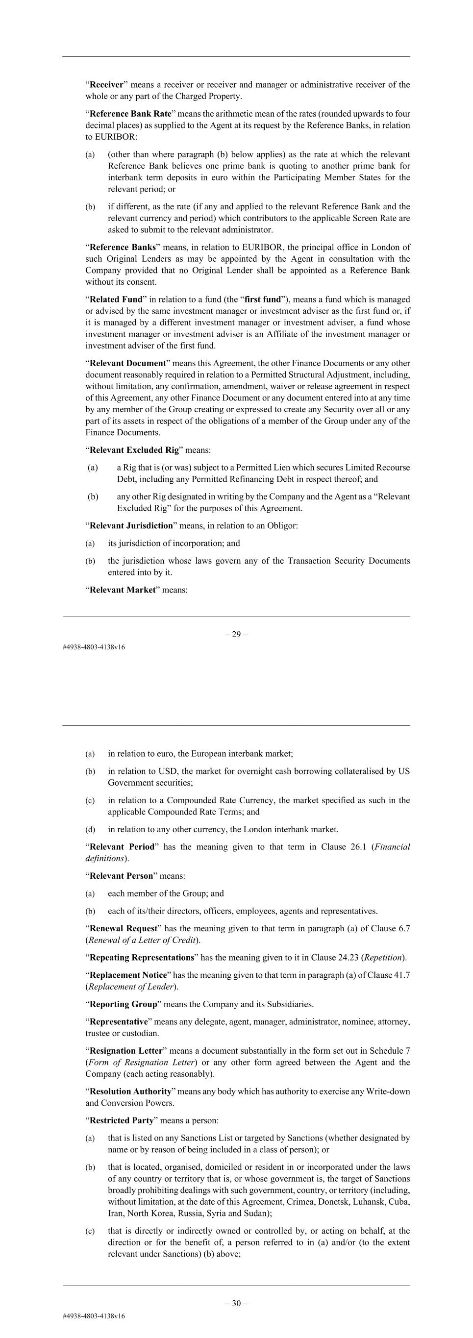 – 2 – “Accounting Principles” means: (a) in relation to any audited consolidated financial statements of the Group, GAAP; and (b) in relation to any other Obligor, generally accepted accounting principles, standards and practices in its jurisdiction of incorporation, including IFRS, in each case, to the extent applicable to the relevant financial statements. “Additional Borrower” means a person which becomes a Borrower in accordance with Clause 31 (Changes to the Obligors). “Additional Business Day” means, in relation to a Compounded Rate Currency, any day specified as such in the applicable Compounded Rate Terms. “Additional Facility” means one or more additional revolving credit facilities made available pursuant to Clause 2.2 (Additional Facilities) which are documented under this Agreement including as new or existing facility commitment(s) and/or as an additional tranche or class of, or an increase of, or an extension of, any existing Facility or a previously incurred Additional Facility. “Additional Facility Borrower” means, in respect of an Additional Facility: (a) an Original Borrower; or (b) any person which is specified as a borrower under that Additional Facility in the applicable Additional Facility Notice and which: (i) is a Borrower under this Agreement; or (ii) accedes as an Additional Borrower under that Additional Facility in accordance with Clause 31 (Changes to the Obligors), unless, in each case, it has ceased to be an Additional Facility Borrower in accordance with Clause 31 (Changes to the Obligors). “Additional Facility Commencement Date” means, in respect of an Additional Facility, the date specified as the Additional Facility Commencement Date (being the date when the relevant Additional Facility is available for utilisation) in the relevant Additional Facility Notice relating to that Additional Facility. “Additional Facility Commitment” means, in respect of an Additional Facility: (a) in relation to an Additional Facility Lender, the amount set out in the Additional Facility Notice in respect of that Additional Facility signed by the Additional Facility Lender and the amount of any other Additional Facility Commitment in respect of that Additional Facility transferred to it under this Agreement or assumed by it in accordance with Clause 2.2 (Additional Facilities) or Clause 2.3 (Increase); and (b) in relation to any other Lender, the amount of any Additional Facility Commitment in respect of that Additional Facility transferred to it under this Agreement or – 3 – assumed by it in accordance with Clause 2.2 (Additional Facilities) or Clause 2.3 (Increase), to the extent, not cancelled, reduced or transferred by it under this Agreement. “Additional Facility Lender” means any Lender or other bank, financial institution, fund, entity or other person which signs an Additional Facility Notice and confirms its willingness to provide all or a part of an Additional Facility. “Additional Facility Lender Accession Letter” means a notice substantially in the form set out in Schedule 14 (Form of Additional Facility Lender Accession Letter) or any other form agreed between the Agent and the Company (each acting reasonably). “Additional Facility Loan” means a loan made or to be made under any Additional Facility or the principal amount outstanding for the time being of that loan. “Additional Facility Notice” means, in respect of an Additional Facility, a notice substantially in the form set out in Schedule 13 (Form of Additional Facility Notice) (or any other form agreed between the Agent and the Company (each acting reasonably)) delivered by the Company to the Agent in accordance with Clause 2.2 (Additional Facilities). “Additional Guarantor” means a person which becomes an Additional Guarantor in accordance with Clause 31 (Changes to the Obligors). “Additional Obligor” means an Additional Borrower or an Additional Guarantor. “Adjusted Term SOFR” means in relation to any Loan in USD, Term SOFR, and if Term SOFR applicable to: (a) an Original Revolving Facility Loan denominated in USD is below zero (0), Adjusted Term SOFR for such Loan will be deemed to be zero (0); and (b) an Additional Facility Loan denominated in USD is below any percentage agreed with the relevant Additional Facility Lenders in the Additional Facility Notice for those Additional Facility Commitments, Adjusted Term SOFR will be deemed to be such percentage rate specified in such Additional Facility Notice. “Affiliate” has the meaning given to that term in Part C (Definitions) of Schedule 16 (Incurrence Covenants). “Agency Fee Letter” means the fee letter dated on or prior to the date of this Agreement between, among others, the Company and the Agent. “Agreed Security Principles” means the principles set out in Schedule 11 (Agreed Security Principles). “Amendment Agreements” means: (a) the First Amendment Agreement; (b) the Second Amendment Agreement; (c) the Third Amendment Agreement;