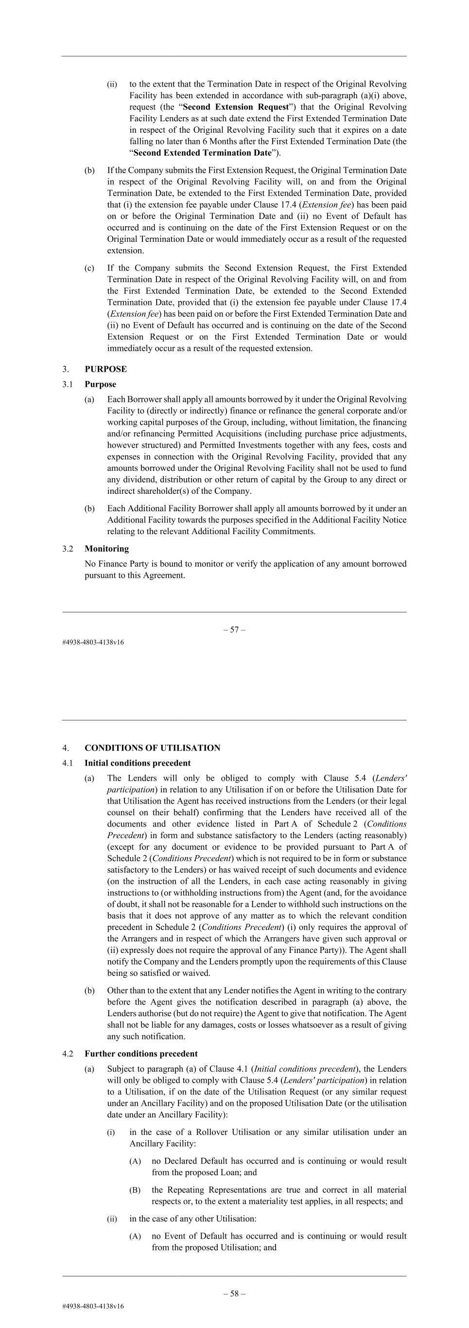 – 60 – (i) any Substitute Affiliate Lender shall be treated for the purposes of paragraph (c) of Clause 18.2 (Tax Gross Up) as having become a Lender on the date of this Agreement; and (ii) the provisions of paragraph (l)(ii) of Clause 29.2 (Conditions of assignment or transfer) shall not apply to or in respect of any Substitute Facility Office or Substitute Affiliate Lender. 3. PURPOSE 3.1 Purpose (a) Each Borrower shall apply all amounts borrowed by it under the Original Revolving Facility to (directly or indirectly) finance or refinance the general corporate and/or working capital purposes of the Group, including, without limitation, the financing and/or refinancing Permitted Acquisitions (including purchase price adjustments, however structured) and Permitted Investments together with any fees, costs and expenses in connection with the Original Revolving Facility, provided that any amounts borrowed under the Original Revolving Facility shall not be used to fund any dividend, distribution or other return of capital by the Group to any direct or indirect shareholder(s) of the Company. (b) Each Additional Facility Borrower shall apply all amounts borrowed by it under an Additional Facility towards the purposes specified in the Additional Facility Notice relating to the relevant Additional Facility Commitments. 3.2 Monitoring No Finance Party is bound to monitor or verify the application of any amount borrowed pursuant to this Agreement. 4. CONDITIONS OF UTILISATION 4.1 Initial conditions precedent (a) The Lenders will only be obliged to comply with Clause 5.4 (Lenders' participation) in relation to any Utilisation if on or before the Utilisation Date for that Utilisation the Agent has received all of the documents and other evidence listed in Part A of Schedule 2 (Conditions Precedent) in form and substance satisfactory to the Agent (acting reasonably) (except for any document or evidence to be provided pursuant to Part A of Schedule 2 (Conditions Precedent) which is not required to be in form or substance satisfactory to the Agent and/or the Lenders) or has waived receipt of such documents and evidence (on the instruction of all the Lenders, in each case acting reasonably in giving instructions to (or withholding instructions from) the Agent (and, for the avoidance of doubt, it shall not be reasonable for a Lender to withhold such instructions on the basis that it does not approve of any matter as to which the relevant condition precedent in Schedule 2 (Conditions Precedent) (i) only requires the approval of the Arrangers and in respect of which the Arrangers have given such approval or (ii) expressly does not – 61 – require the approval of any Finance Party)). The Agent shall notify the Company and the Lenders promptly upon being so satisfied or waived. (b) Other than to the extent that any Lender notifies the Agent in writing to the contrary before the Agent gives the notification described in paragraph (a) above, the Lenders authorise (but do not require) the Agent to give that notification. The Agent shall not be liable for any damages, costs or losses whatsoever as a result of giving any such notification. 4.2 Further conditions precedent (a) Subject to paragraph (a) of Clause 4.1 (Initial conditions precedent), the Lenders will only be obliged to comply with Clause 5.4 (Lenders' participation) in relation to a Utilisation, if on the date of the Utilisation Request (or any similar request under an Ancillary Facility) and on the proposed Utilisation Date (or the utilisation date under an Ancillary Facility): (i) in the case of a Rollover Utilisation or any similar utilisation under an Ancillary Facility: (A) no Event of Default has occurred and is continuing or would result from the proposed Loan; and (B) the Repeating Representations are true and correct in all material respects or, to the extent a materiality test applies, in all respects. (ii) in the case of any other Utilisation: (A) no Default has occurred and is continuing or would result from the proposed Utilisation; and (B) the Repeating Representations or, in respect of any Utilisation on the Closing Date, all the representations under Clause 24 (Representations and Warranties) are true and correct in all material respects or, to the extent a materiality test applies, in all respects. (b) The requirements set out in paragraph (a) above in relation to a proposed Utilisation may be waived by the Agent (acting on the instructions of the relevant Majority Lenders),provided that a non-payment Event of Default under Sections (1) and (2) of Schedule 17 (Events of Default) may not be waived without the consent of each Lender to which the relevant overdue payment is owing. 4.3 Conditions relating to Optional Currencies (a) A currency will constitute an Optional Currency if it is: (i) euro or sterling; (ii) in the case of an Additional Facility, any currencies specified in the Additional Facility Notice relating to those Additional Facility Commitments; or