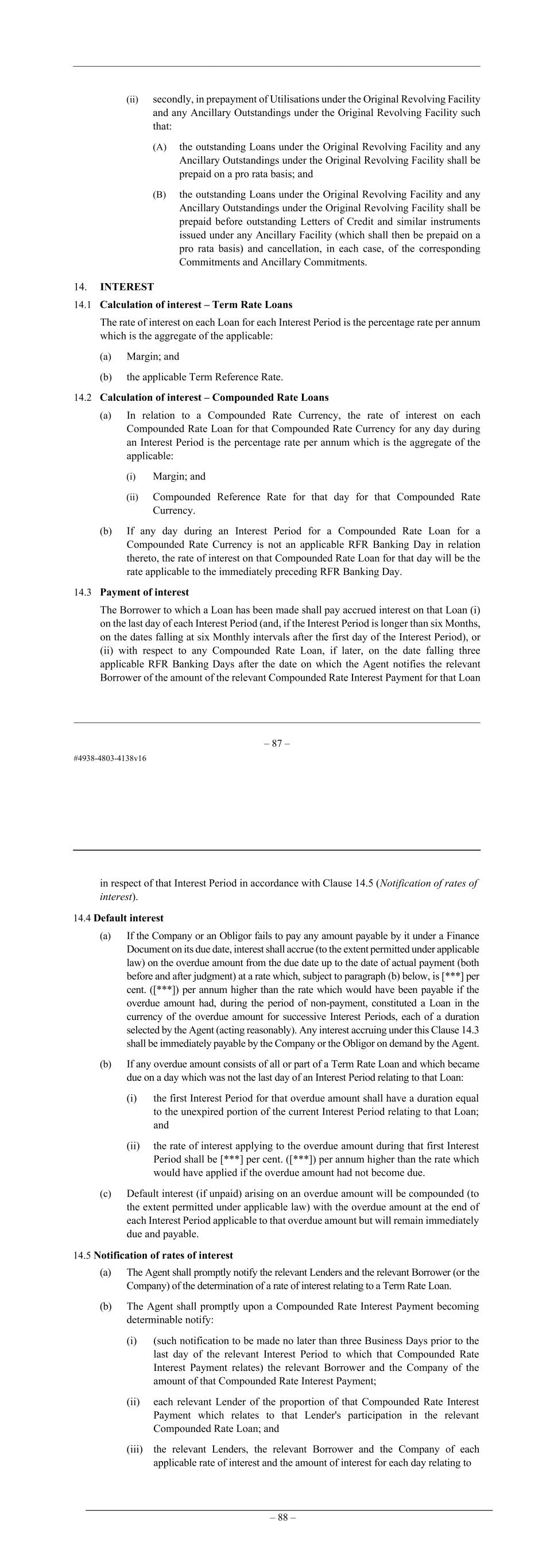 – 88 – 13. RESTRICTIONS (a) Any notice of cancellation, prepayment, authorisation or other election given by any Party under Clause 11 (Illegality, Voluntary Prepayment and Cancellation) shall (subject to the terms of those Clauses), unless a contrary indication appears in this Agreement, specify the date or dates upon which the relevant cancellation or prepayment is to be made and the amount of that cancellation or prepayment. In the event that a Borrower delivers a conditional or revocable notice of voluntary cancellation and/or voluntary prepayment under this Agreement, which it shall be permitted to do, that Borrower shall be liable for any Break Costs (if applicable) if the relevant prepayment is not made. (b) Any prepayment under this Agreement shall be made together with accrued interest on the amount prepaid and, subject to any Break Costs (if applicable), without premium or penalty. (c) Unless a contrary indication appears in this Agreement, any part of a Facility which is prepaid or repaid may be reborrowed in accordance with the terms of this Agreement. (d) No Borrower shall repay or prepay all or any part of the Utilisations or cancel all or any part of the Commitments except at the times and in the manner expressly provided for in this Agreement. (e) Subject to Clause 2.3 (Increase), no amount of the Total Commitments cancelled under this Agreement may be subsequently reinstated. (f) If the Agent receives a notice under Clause 11 (Illegality, Voluntary Prepayment and Cancellation), it shall promptly forward a copy of that notice or election to either the Company or the affected Lender, as appropriate. (g) Any prepayment of a Utilisation pursuant to Clause 11.5 (Voluntary prepayment) shall be applied pro rata to each Lender's participation in that Utilisation. (h) Any prepayment of a Utilisation pursuant to Clause 12.1 (Change of Control) shall be applied to the participations in such Utilisation of each Lender that has served a Lender Cancellation Notice in accordance with paragraph (b) of Clause 12.1 (Change of Control). (i) Any prepayment of a Utilisation or cancellation of Available Commitments pursuant to Clause 12.2 (Note Purchase Condition application) shall be applied in the following order: (i) firstly, in cancellation of Available Commitments under the Original Revolving Facility and any Additional Facility and Ancillary Commitments under the Original Revolving Facility and any Additional Facility pro rata (and the Available Commitments and/or, as applicable Ancillary Commitments of the Lenders under the Original Revolving Facility and any Additional Facility will be cancelled rateably); and – 89 – (ii) secondly, in prepayment of Utilisations under the Original Revolving Facility and any Additional Facility and any Ancillary Outstandings such that: (A) the outstanding Loans under the Original Revolving Facility and any Additional Facility and any Ancillary Outstandings shall be prepaid on a pro rata basis; and (B) the outstanding Loans under the Original Revolving Facility and any Additional Facility and any Ancillary Outstandings shall be prepaid before outstanding Letters of Credit and similar instruments issued under any Ancillary Facility (which shall then be prepaid on a pro rata basis) and cancellation, in each case, of the corresponding Commitments and Ancillary Commitments. 14. INTEREST 14.1 Calculation of interest – Term Rate Loans The rate of interest on each Loan for each Interest Period is the percentage rate per annum which is the aggregate of the applicable: (a) Margin; and (b) the applicable Term Reference Rate. 14.2 Calculation of interest – Compounded Rate Loans (a) In relation to a Compounded Rate Currency, the rate of interest on each Compounded Rate Loan for that Compounded Rate Currency for any day during an Interest Period is the percentage rate per annum which is the aggregate of the applicable: (i) Margin; and (ii) Compounded Reference Rate for that day for that Compounded Rate Currency. (b) If any day during an Interest Period for a Compounded Rate Loan for a Compounded Rate Currency is not an applicable RFR Banking Day in relation thereto, the rate of interest on that Compounded Rate Loan for that day will be the rate applicable to the immediately preceding RFR Banking Day. 14.3 Payment of interest The Borrower to which a Loan has been made shall pay accrued interest on that Loan (i) on the last day of each Interest Period (and, if the Interest Period is longer than six Months, on the dates falling at six Monthly intervals after the first day of the Interest Period), or (ii) with respect to any Compounded Rate Loan, if later, on the date falling three applicable RFR Banking Days after the date on which the Agent notifies the relevant Borrower of the amount of the relevant Compounded Rate Interest Payment for that Loan in respect of that Interest Period in accordance with Clause 14.5 (Notification of rates of interest).
