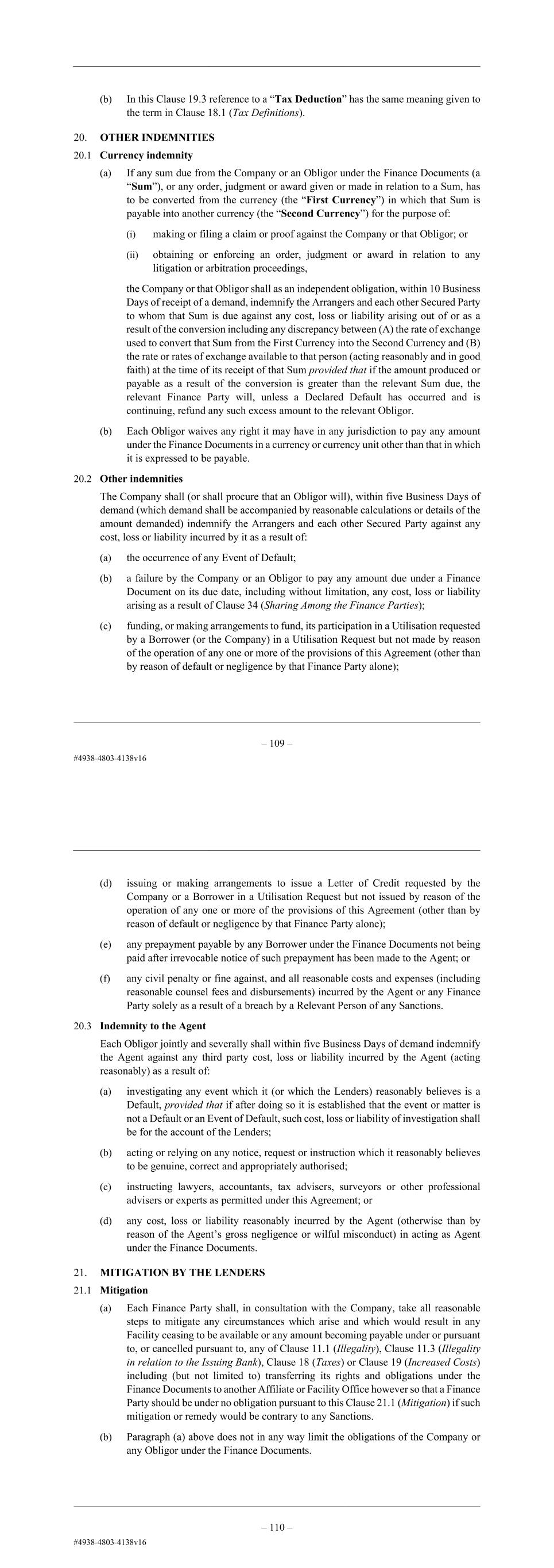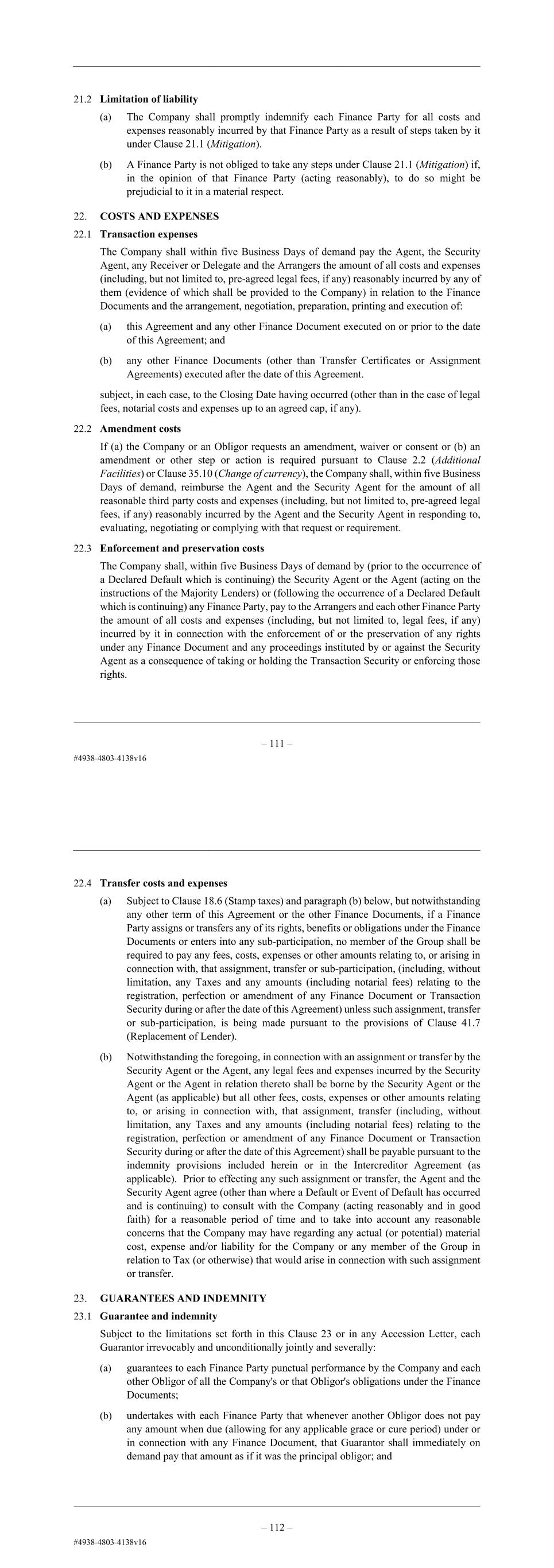– 112 – (b) acting or relying on any notice, request or instruction which it reasonably believes to be genuine, correct and appropriately authorised; (c) instructing lawyers, accountants, tax advisers, surveyors or other professional advisers or experts as permitted under this Agreement; or (d) any cost, loss or liability reasonably incurred by the Agent (otherwise than by reason of the Agent’s gross negligence or wilful misconduct) in acting as Agent under the Finance Documents. 21. MITIGATION BY THE LENDERS 21.1 Mitigation (a) Each Finance Party shall, in consultation with the Company, take all reasonable steps to mitigate any circumstances which arise and which would result in any Facility ceasing to be available or any amount becoming payable under or pursuant to, or cancelled pursuant to, any of Clause 11.1 (Illegality), Clause 11.3 (Illegality in relation to the Issuing Bank), Clause 18 (Taxes) or Clause 19 (Increased Costs) including (but not limited to) transferring its rights and obligations under the Finance Documents to another Affiliate or Facility Office however so that a Finance Party should be under no obligation pursuant to this Clause 21.1 (Mitigation) if such mitigation or remedy would be contrary to any Sanctions. (b) Paragraph (a) above does not in any way limit the obligations of the Company or any Obligor under the Finance Documents. 21.2 Limitation of liability (a) The Company shall promptly indemnify each Finance Party for all costs and expenses reasonably incurred by that Finance Party as a result of steps taken by it under Clause 21.1 (Mitigation). (b) A Finance Party is not obliged to take any steps under Clause 21.1 (Mitigation) if, in the opinion of that Finance Party (acting reasonably), to do so might be prejudicial to it in a material respect. 22. COSTS AND EXPENSES 22.1 Transaction expenses The Company shall within five Business Days of demand pay the Agent, the Security Agent, any Receiver or Delegate and the Arrangers the amount of all costs and expenses (including, but not limited to, pre-agreed legal fees, if any) reasonably incurred by any of them (evidence of which shall be provided to the Company) in relation to the Finance Documents and the arrangement, negotiation, preparation, printing and execution of: (a) this Agreement and any other Finance Document executed on or prior to the date of this Agreement; and (b) any other Finance Documents (other than Transfer Certificates or Assignment Agreements) executed after the date of this Agreement. – 113 – subject, in each case, to the Closing Date having occurred (other than in the case of legal fees, notarial costs and expenses up to an agreed cap, if any). 22.2 Amendment costs If (a) the Company or an Obligor requests an amendment, waiver or consent or (b) an amendment or other step or action is required pursuant to Clause 2.2 (Additional Facilities) or Clause 35.10 (Change of currency), the Company shall, within five Business Days of demand, reimburse the Agent and the Security Agent for the amount of all reasonable third party costs and expenses (including, but not limited to, pre-agreed legal fees, if any) reasonably incurred by the Agent and the Security Agent in responding to, evaluating, negotiating or complying with that request or requirement. 22.3 Enforcement and preservation costs The Company shall, within five Business Days of demand by (prior to the occurrence of a Declared Default which is continuing) the Security Agent or the Agent (acting on the instructions of the Majority Lenders) or (following the occurrence of a Declared Default which is continuing) any Finance Party, pay to the Arrangers and each other Finance Party the amount of all costs and expenses (including, but not limited to, legal fees, if any) incurred by it in connection with the enforcement of or the preservation of any rights under any Finance Document and any proceedings instituted by or against the Security Agent as a consequence of taking or holding the Transaction Security or enforcing those rights. 22.4 Transfer costs and expenses (a) Subject to Clause 18.6 (Stamp taxes) and paragraph (b) below, but notwithstanding any other term of this Agreement or the other Finance Documents, if a Finance Party assigns or transfers any of its rights, benefits or obligations under the Finance Documents or enters into any sub-participation, no member of the Group shall be required to pay any fees, costs, expenses or other amounts relating to, or arising in connection with, that assignment, transfer or sub-participation, (including, without limitation, any Taxes and any amounts (including notarial fees) relating to the registration, perfection or amendment of any Finance Document or Transaction Security during or after the date of this Agreement) unless such assignment, transfer or sub-participation, is being made pursuant to the provisions of Clause 41.7 (Replacement of Lender). (b) Notwithstanding the foregoing, in connection with an assignment or transfer by the Security Agent, any legal fees and expenses incurred by the Security Agent in relation thereto shall be borne by the Security Agent but all other fees, costs, expenses or other amounts relating to, or arising in connection with, that assignment, transfer (including, without limitation, any Taxes and any amounts (including notarial fees) relating to the registration, perfection or amendment of any Finance Document or Transaction Security during or after the date of this Agreement) shall be payable pursuant to the indemnity provisions included in the Intercreditor Agreement. Prior to effecting any such assignment or transfer, the Security Agent agrees (other than where a Default or Event of Default has occurred