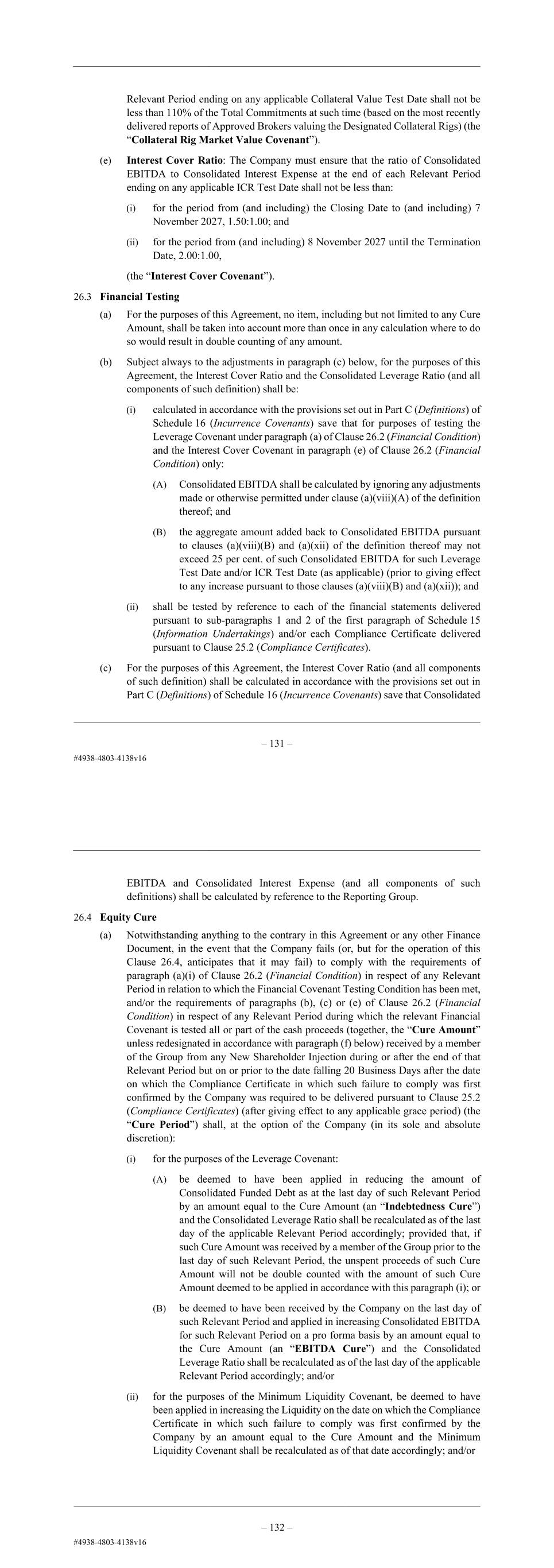 – 132 – (ii) For the avoidance of doubt and notwithstanding anything to the contrary in this Agreement or any other Finance Document: (A) sub-paragraph (a)(i) above shall not apply nor be in effect if the Financial Covenant Testing Condition has not been met at 5:00 p.m. on the applicable Leverage Test Date; and (B) the Company shall not be required to provide any calculations or confirmations with respect to the Leverage Covenant with respect to any Relevant Period in respect of which the Financial Covenant Testing Condition is not met. (b) Minimum Liquidity: The Company shall ensure that Liquidity during the Relevant Period shall not at any time be less than USD 30,000,000 (the “Minimum Liquidity Covenant”). (c) Minimum Equity: The Company shall ensure that the Book Equity Ratio in respect of the Relevant Period ending on any applicable Book Equity Test Date shall be equal to or higher than: (i) from (and including) the Closing Date to (and including) 31 December 2024, 20%; (ii) from (and including) 1 January 2025 to (and including) the date immediately preceding the date which is 6 Months prior to the Termination Date, 25%; and (iii) for the period from (and including) the date which is 6 Months prior to the Termination Date until the Termination Date, 30%, (the “Minimum Equity Covenant”). (d) Collateral Rig Market Value: The Company shall ensure that the aggregate Collateral Rig Market Value of all Designated Collateral Rigs in respect of the Relevant Period ending on any applicable Collateral Value Test Date shall not be less than 500% of the Total Commitments at such time (based on the most recently delivered reports of Approved Brokers valuing the Designated Collateral Rigs) (the “Collateral Rig Market Value Covenant”). (e) Interest Cover Ratio: The Company must ensure that the ratio of Consolidated EBITDA to Consolidated Interest Expense at the end of each Relevant Period ending on any applicable ICR Test Date shall not be less than: (i) for the period from (and including) the Closing Date to (and including) 30 June 2025, 2.00:1.00; (ii) for the period from (and including) 1 July 2025 to (and including) the date immediately preceding the date which is 6 Months prior to the Termination Date; 1.50:1.00; and – 133 – (iii) for the period from (and including) the date which is 6 Months prior to the Termination Date until the Termination Date, 2.00:1.00, (the “Interest Cover Covenant”). 26.3 Financial Testing (a) For the purposes of this Agreement, no item, including but not limited to any Cure Amount, shall be taken into account more than once in any calculation where to do so would result in double counting of any amount. (b) Subject always to the adjustments in paragraph (c) below, for the purposes of this Agreement, the Interest Cover Ratio and the Consolidated Leverage Ratio (and all components of such definition) shall be: (i) calculated in accordance with the provisions set out in Part C (Definitions) of Schedule 16 (Incurrence Covenants) save that for purposes of testing the Leverage Covenant under paragraph (a) of Clause 26.2 (Financial Condition) and the Interest Cover Covenant in paragraph (e) of Clause 26.2 (Financial Condition) only: (A) Consolidated EBITDA shall be calculated by ignoring any adjustments made or otherwise permitted under clause (a)(viii)(A) of the definition thereof; and (B) the aggregate amount added back to Consolidated EBITDA pursuant to clauses (a)(viii)(B) and (a)(xii) of the definition thereof may not exceed 25 per cent. of such Consolidated EBITDA for such Leverage Test Date and/or ICR Test Date (as applicable) (prior to giving effect to any increase pursuant to those clauses (a)(viii)(B) and (a)(xii)); and (ii) shall be tested by reference to each of the financial statements delivered pursuant to sub-paragraphs 1 and 2 of the first paragraph of Schedule 15 (Information Undertakings) and/or each Compliance Certificate delivered pursuant to Clause 25.2 (Compliance Certificates). (c) For the purposes of this Agreement, the Interest Cover Ratio (and all components of such definition) shall be calculated in accordance with the provisions set out in Part C (Definitions) of Schedule 16 (Incurrence Covenants) save that Consolidated EBITDA and Consolidated Interest Expense (and all components of such definitions) shall be calculated by reference to the Reporting Group. 26.4 Equity Cure (a) Notwithstanding anything to the contrary in this Agreement or any other Finance Document, in the event that the Company fails (or, but for the operation of this Clause 26.4, anticipates that it may fail) to comply with the requirements of paragraph (a)(i) of Clause 26.2 (Financial Condition) in respect of any Relevant Period in relation to which the Financial Covenant Testing Condition has been met, and/or the requirements of paragraphs (b), (c) or (e) of Clause 26.2 (Financial Condition) in respect of any Relevant Period during which the relevant Financial