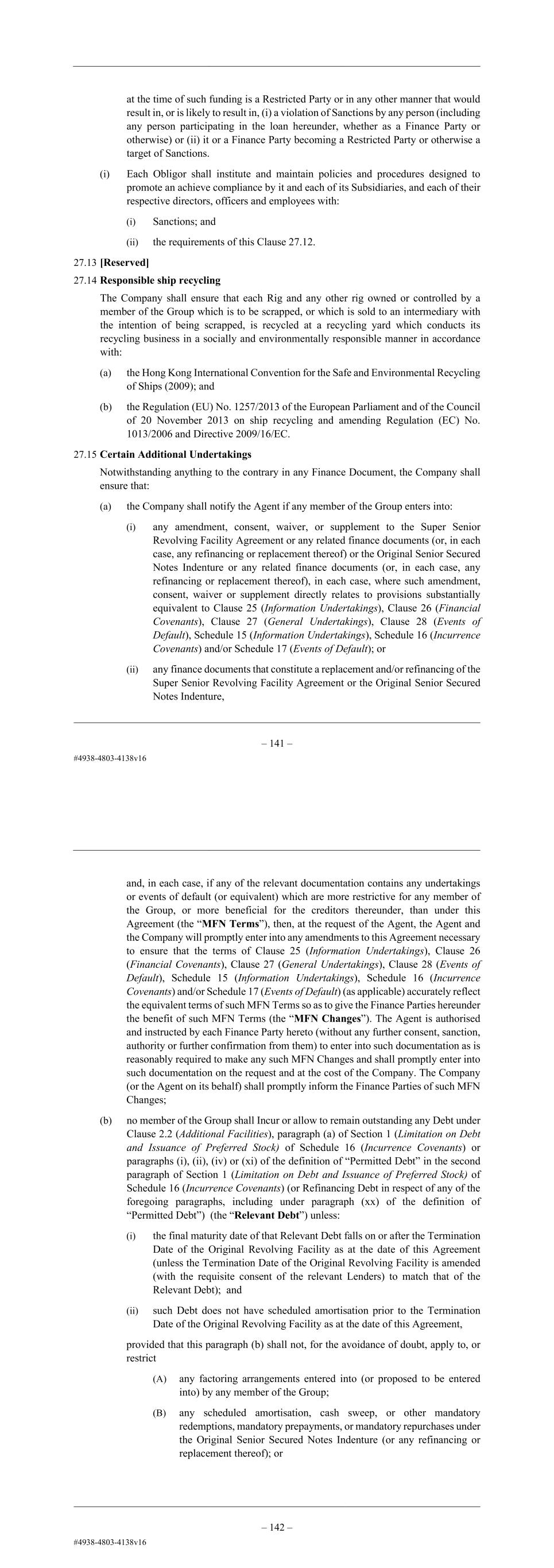 – 144 – (B) the amount of any prepayments or cancellations made prior to such Notes Payment pursuant to this paragraph (c)(ii). (d) Subject to paragraph (b) above, in this Clause 27.13: “Prepayment Threshold” means an amount equal to 50 per cent. of the principal amount of the Notes Repurchase Debt as at the Closing Date. “Relevant Proportion” means, with respect to a Notes Payment, the proportion that (x) the amount by which the Prepayment Threshold exceeds the principal amount of the Notes Repurchase Debt immediately following such Notes Payment bears to (y) the original amount of the Prepayment Threshold. 27.14 Responsible ship recycling The Company shall ensure that each Rig and any other rig owned or controlled by a member of the Group which is to be scrapped, or which is sold to an intermediary with the intention of being scrapped, is recycled at a recycling yard which conducts its recycling business in a socially and environmentally responsible manner in accordance with: (a) the Hong Kong International Convention for the Safe and Environmental Recycling of Ships (2009); and (b) the Regulation (EU) No. 1257/2013 of the European Parliament and of the Council of 20 November 2013 on ship recycling and amending Regulation (EC) No. 1013/2006 and Directive 2009/16/EC. 27.15 Additional undertakings The Company and each Obligor shall comply with the covenants set out in Schedule 16 (Incurrence Covenants). 27.16 Conditions Subsequent By no later than 60 days after (and excluding) the date of this Agreement, the Company shall provide evidence of the full and final release and discharge of all security provided for the Existing Debt (other than the Convertible Bonds (2028) and any other Debt permitted under this Agreement). 28. EVENTS OF DEFAULT Each of the events or circumstances set out in this Clause 28 (save for Clause 28.7 (Acceleration) to Clause 28.8 (Clean-Up Period)) and Schedule 17 (Events of Default) shall constitute an Event of Default. 28.1 Financial Covenants Subject to Clause 26.4 (Equity Cure) and the expiry of any applicable Cure Period, the Company fails to comply with any Financial Covenant when required to be tested in accordance with Clause 26.2 (Financial Condition). – 145 – 28.2 Misrepresentation (a) Any representation, warranty or written statement made or deemed to be made by a Third Party Security Provider or an Obligor in the Finance Documents is or proves to have been incorrect or misleading in any material respect when made or deemed to be made. (b) No Event of Default will occur under paragraph (a) above if the circumstances giving rise to that misrepresentation are capable of remedy and are remedied within 15 Business Days of the earlier of: (i) the giving of notice by the Agent to the Company in respect of such misrepresentation and (ii) the Company becoming aware of the failure to comply. 28.3 Intercreditor Agreement (a) Any Obligor fails to comply in any material respect with the provisions of, or does not perform its material obligations under, the Intercreditor Agreement. (b) No Event of Default will occur under paragraph (a) above if such failure: (i) does not materially and adversely affect the interests of the Lenders as a whole; or (ii) is capable of remedy, and is remedied within 15 Business Days of the earlier of (i) the giving of notice by the Agent to the Company in respect of such failure and (ii) the Company becoming aware of the failure to comply. 28.4 Unlawfulness and invalidity (a) Subject to the Legal Reservations and Perfection Requirements, it is or becomes unlawful for an Obligor or Third Party Security Provider to perform any of its material obligations under the Finance Documents, any Finance Document ceases to be in full force and effect or any Transaction Security created or expressed to be created or evidenced by the Transaction Security Documents ceases to be effective or any subordination created under the Intercreditor Agreement is or becomes unlawful and this could reasonably be expected to materially and adversely affect the interests of the Finance Parties (taken as a whole) under the Finance Documents. (b) Subject to the Legal Reservations and Perfection Requirements, any material obligation of any Obligor or Third Party Security Provider that is a party to the Intercreditor Agreement is not or ceases to be legal, valid, binding or enforceable. (c) No Event of Default will occur under paragraphs (a) or (b) above if such circumstance: (i) does not materially and adversely affect the interests of the Lenders as a whole; or (ii) is capable of remedy, and is remedied within 15 Business Days of the earlier of: (i) the giving of notice by the Agent to the Company in respect of such circumstance and (ii) the Company becoming aware of the failure to comply.