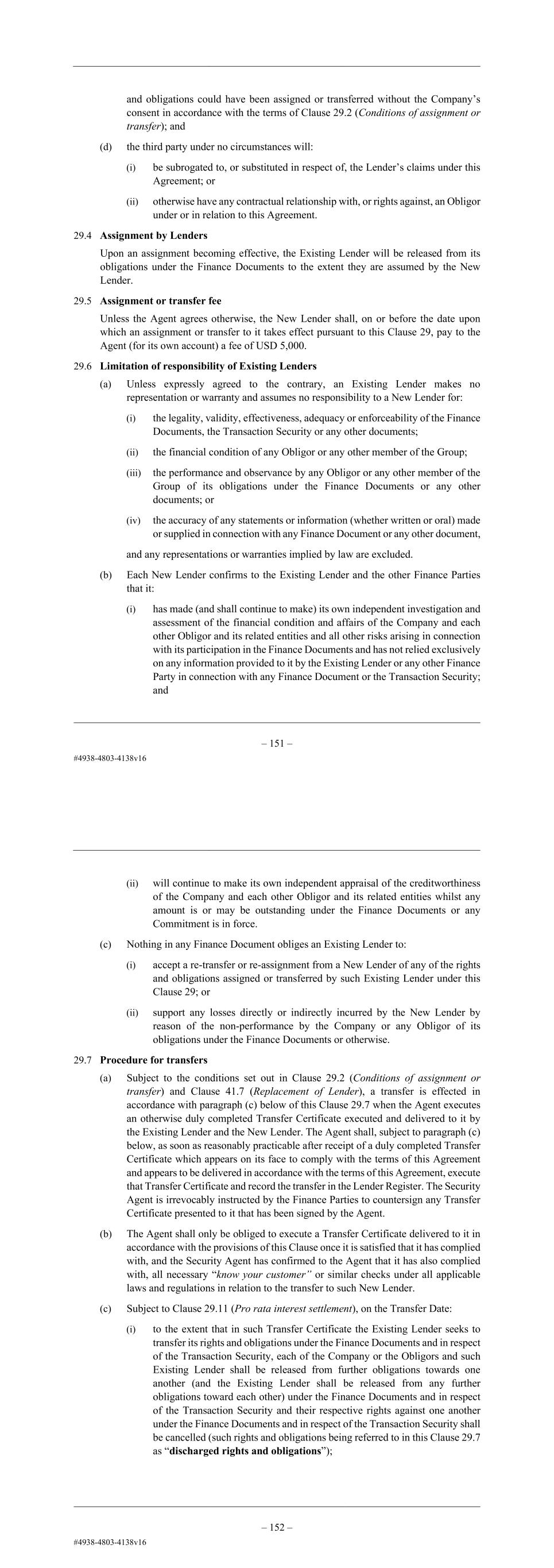 – 152 – arrangement with another person under which such Lender transfers its exposure in full or part to that other person, unless under such arrangement throughout the life of such arrangement: (a) the relationship between the Lender and the third party is that of a debtor and creditor (including during the bankruptcy or similar event affecting the Lender or a Borrower); (b) the third party has no proprietary interest in the benefit of this Agreement or in any monies received by the Lender under or in relation to this Agreement; (c) the Lender does not divest itself, either expressly or implicitly or based on any common understanding with the third party, of any of its voting rights under the Finance Documents unless the third party is a person to whom the relevant rights and obligations could have been assigned or transferred without the Company’s consent in accordance with the terms of Clause 29.2 (Conditions of assignment or transfer); and (d) the third party under no circumstances will: (i) be subrogated to, or substituted in respect of, the Lender’s claims under this Agreement; or (ii) otherwise have any contractual relationship with, or rights against, an Obligor under or in relation to this Agreement. 29.4 Assignment by Lenders Upon an assignment becoming effective, the Existing Lender will be released from its obligations under the Finance Documents to the extent they are assumed by the New Lender. 29.5 Assignment or transfer fee Unless the Agent agrees otherwise, the New Lender shall, on or before the date upon which an assignment or transfer to it takes effect pursuant to this Clause 29, pay to the Agent (for its own account) a fee of USD 5,000. 29.6 Limitation of responsibility of Existing Lenders (a) Unless expressly agreed to the contrary, an Existing Lender makes no representation or warranty and assumes no responsibility to a New Lender for: (i) the legality, validity, effectiveness, adequacy or enforceability of the Finance Documents, the Transaction Security or any other documents; (ii) the financial condition of any Obligor or any other member of the Group; (iii) the performance and observance by any Obligor or any other member of the Group of its obligations under the Finance Documents or any other documents; or – 153 – (iv) the accuracy of any statements or information (whether written or oral) made or supplied in connection with any Finance Document or any other document, and any representations or warranties implied by law are excluded. (b) Each New Lender confirms to the Existing Lender and the other Finance Parties that it: (i) has made (and shall continue to make) its own independent investigation and assessment of the financial condition and affairs of the Company and each other Obligor and its related entities and all other risks arising in connection with its participation in the Finance Documents and has not relied exclusively on any information provided to it by the Existing Lender or any other Finance Party in connection with any Finance Document or the Transaction Security; and (ii) will continue to make its own independent appraisal of the creditworthiness of the Company and each other Obligor and its related entities whilst any amount is or may be outstanding under the Finance Documents or any Commitment is in force. (c) Nothing in any Finance Document obliges an Existing Lender to: (i) accept a re-transfer or re-assignment from a New Lender of any of the rights and obligations assigned or transferred by such Existing Lender under this Clause 29; or (ii) support any losses directly or indirectly incurred by the New Lender by reason of the non-performance by the Company or any Obligor of its obligations under the Finance Documents or otherwise. 29.7 Procedure for transfers (a) Subject to the conditions set out in Clause 29.2 (Conditions of assignment or transfer) and Clause 41.7 (Replacement of Lender), a transfer is effected in accordance with paragraph (c) below of this Clause 29.7 when the Agent executes an otherwise duly completed Transfer Certificate executed and delivered to it by the Existing Lender and the New Lender. The Agent shall, subject to paragraph (c) below, as soon as reasonably practicable after receipt of a duly completed Transfer Certificate which appears on its face to comply with the terms of this Agreement and appears to be delivered in accordance with the terms of this Agreement, execute that Transfer Certificate and record the transfer in the Lender Register. The Security Agent is irrevocably instructed by the Finance Parties to countersign any Transfer Certificate presented to it that has been signed by the Agent. (b) The Agent shall only be obliged to execute a Transfer Certificate delivered to it in accordance with the provisions of this Clause once it is satisfied that it has complied with, and the Security Agent has confirmed to the Agent that it has also complied with, all necessary “know your customer” or similar checks under all applicable laws and regulations in relation to the transfer to such New Lender.