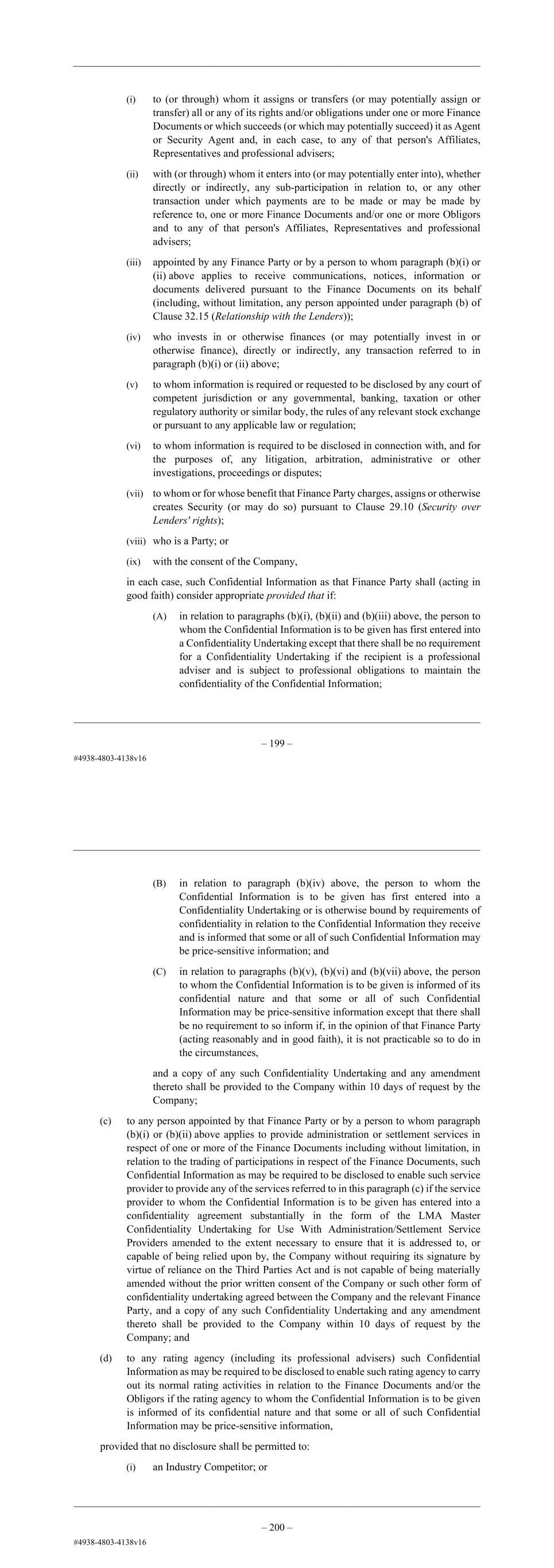 – 200 – 42.2 Disclosure of Confidential Information Any Finance Party may disclose: (a) to any of its Affiliates, its Related Funds and any of its Affiliates or its Related Funds officers, directors, employees, professional advisers, auditors, partners and Representatives such Confidential Information as that Finance Party shall consider appropriate if any person to whom the Confidential Information is to be given pursuant to this paragraph (a) is informed in writing of its confidential nature and that some or all of such Confidential Information may be price-sensitive information except that there shall be no such requirement to so inform if the recipient is subject to professional obligations to maintain the confidentiality of the information or is otherwise bound by requirements of confidentiality in relation to the Confidential Information; (b) to any person: (i) to (or through) whom it assigns or transfers (or may potentially assign or transfer) all or any of its rights and/or obligations under one or more Finance Documents or which succeeds (or which may potentially succeed) it as Agent or Security Agent and, in each case, to any of that person's Affiliates, Representatives and professional advisers; (ii) with (or through) whom it enters into (or may potentially enter into), whether directly or indirectly, any sub-participation in relation to, or any other transaction under which payments are to be made or may be made by reference to, one or more Finance Documents and/or one or more Obligors and to any of that person's Affiliates, Representatives and professional advisers; (iii) appointed by any Finance Party or by a person to whom paragraph (b)(i) or (ii) above applies to receive communications, notices, information or documents delivered pursuant to the Finance Documents on its behalf (including, without limitation, any person appointed under paragraph (b) of Clause 32.15 (Relationship with the Lenders)); (iv) who invests in or otherwise finances (or may potentially invest in or otherwise finance), directly or indirectly, any transaction referred to in paragraph (b)(i) or (ii) above; (v) to whom information is required or requested to be disclosed by any court of competent jurisdiction or any governmental, banking, taxation or other regulatory authority or similar body, the rules of any relevant stock exchange or pursuant to any applicable law or regulation; (vi) to whom information is required to be disclosed in connection with, and for the purposes of, any litigation, arbitration, administrative or other investigations, proceedings or disputes; – 201 – (vii) to whom or for whose benefit that Finance Party charges, assigns or otherwise creates Security (or may do so) pursuant to Clause 29.10 (Security over Lenders' rights); (viii) who is a Party; or (ix) with the consent of the Company, in each case, such Confidential Information as that Finance Party shall (acting in good faith) consider appropriate provided that if: (A) in relation to paragraphs (b)(i), (b)(ii) and (b)(iii) above, the person to whom the Confidential Information is to be given has first entered into a Confidentiality Undertaking except that there shall be no requirement for a Confidentiality Undertaking if the recipient is a professional adviser and is subject to professional obligations to maintain the confidentiality of the Confidential Information; (B) in relation to paragraph (b)(iv) above, the person to whom the Confidential Information is to be given has first entered into a Confidentiality Undertaking or is otherwise bound by requirements of confidentiality in relation to the Confidential Information they receive and is informed that some or all of such Confidential Information may be price-sensitive information; and (C) in relation to paragraphs (b)(v), (b)(vi) and (b)(vii) above, the person to whom the Confidential Information is to be given is informed of its confidential nature and that some or all of such Confidential Information may be price-sensitive information except that there shall be no requirement to so inform if, in the opinion of that Finance Party (acting reasonably and in good faith), it is not practicable so to do in the circumstances, and a copy of any such Confidentiality Undertaking and any amendment thereto shall be provided to the Company within 10 days of request by the Company; (c) to any person appointed by that Finance Party or by a person to whom paragraph (b)(i) or (b)(ii) above applies to provide administration or settlement services in respect of one or more of the Finance Documents including without limitation, in relation to the trading of participations in respect of the Finance Documents, such Confidential Information as may be required to be disclosed to enable such service provider to provide any of the services referred to in this paragraph (c) if the service provider to whom the Confidential Information is to be given has entered into a confidentiality agreement substantially in the form of the LMA Master Confidentiality Undertaking for Use With Administration/Settlement Service Providers amended to the extent necessary to ensure that it is addressed to, or capable of being relied upon by, the Company without requiring its signature by virtue of reliance on the Third Parties Act and is not capable of being materially