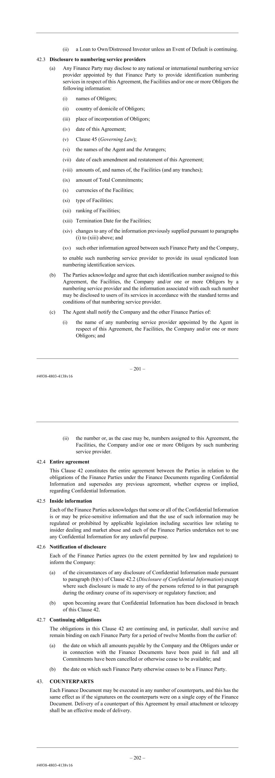 – 202 – amended without the prior written consent of the Company or such other form of confidentiality undertaking agreed between the Company and the relevant Finance Party, and a copy of any such Confidentiality Undertaking and any amendment thereto shall be provided to the Company within 10 days of request by the Company; and (d) to any rating agency (including its professional advisers) such Confidential Information as may be required to be disclosed to enable such rating agency to carry out its normal rating activities in relation to the Finance Documents and/or the Obligors if the rating agency to whom the Confidential Information is to be given is informed of its confidential nature and that some or all of such Confidential Information may be price-sensitive information, provided that no disclosure shall be permitted to: (i) an Industry Competitor; or (ii) a Loan to Own/Distressed Investor unless an Event of Default is continuing. 42.3 Disclosure to numbering service providers (a) Any Finance Party may disclose to any national or international numbering service provider appointed by that Finance Party to provide identification numbering services in respect of this Agreement, the Facilities and/or one or more Obligors the following information: (i) names of Obligors; (ii) country of domicile of Obligors; (iii) place of incorporation of Obligors; (iv) date of this Agreement; (v) Clause 45 (Governing Law); (vi) the names of the Agent and the Arrangers; (vii) date of each amendment and restatement of this Agreement; (viii) amounts of, and names of, the Facilities (and any tranches); (ix) amount of Total Commitments; (x) currencies of the Facilities; (xi) type of Facilities; (xii) ranking of Facilities; (xiii) Termination Date for the Facilities; (xiv) changes to any of the information previously supplied pursuant to paragraphs (i) to (xiii) above; and – 203 – (xv) such other information agreed between such Finance Party and the Company, to enable such numbering service provider to provide its usual syndicated loan numbering identification services. (b) The Parties acknowledge and agree that each identification number assigned to this Agreement, the Facilities, the Company and/or one or more Obligors by a numbering service provider and the information associated with each such number may be disclosed to users of its services in accordance with the standard terms and conditions of that numbering service provider. (c) The Agent shall notify the Company and the other Finance Parties of: (i) the name of any numbering service provider appointed by the Agent in respect of this Agreement, the Facilities, the Company and/or one or more Obligors; and (ii) the number or, as the case may be, numbers assigned to this Agreement, the Facilities, the Company and/or one or more Obligors by such numbering service provider. 42.4 Entire agreement This Clause 42 constitutes the entire agreement between the Parties in relation to the obligations of the Finance Parties under the Finance Documents regarding Confidential Information and supersedes any previous agreement, whether express or implied, regarding Confidential Information. 42.5 Inside information Each of the Finance Parties acknowledges that some or all of the Confidential Information is or may be price-sensitive information and that the use of such information may be regulated or prohibited by applicable legislation including securities law relating to insider dealing and market abuse and each of the Finance Parties undertakes not to use any Confidential Information for any unlawful purpose. 42.6 Notification of disclosure Each of the Finance Parties agrees (to the extent permitted by law and regulation) to inform the Company: (a) of the circumstances of any disclosure of Confidential Information made pursuant to paragraph (b)(v) of Clause 42.2 (Disclosure of Confidential Information) except where such disclosure is made to any of the persons referred to in that paragraph during the ordinary course of its supervisory or regulatory function; and (b) upon becoming aware that Confidential Information has been disclosed in breach of this Clause 42. 42.7 Continuing obligations The obligations in this Clause 42 are continuing and, in particular, shall survive and remain binding on each Finance Party for a period of twelve Months from the earlier of: