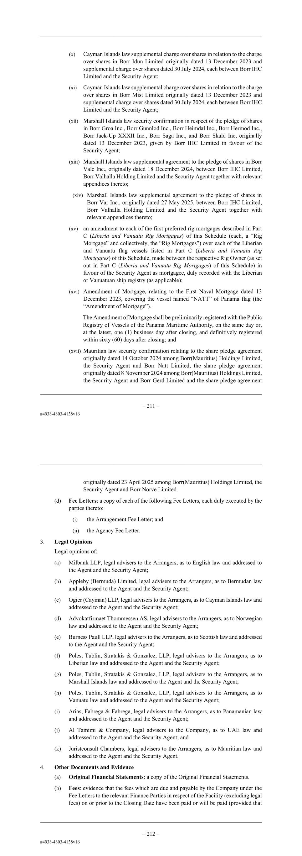 10 2. Transaction Security Documents A copy of the following Transaction Security Documents duly executed by the parties thereto: (a) English law supplemental debenture in relation to the debenture dated 13 December 2023 and supplemental debenture dated 30 July 2024 between, amongst others, the companies listed therein as “Chargors” and the Security Agent. (b) Norwegian law security confirmation and amendment agreement in respect of the account charge agreement originally dated 7 November 2023 (as confirmed and amended from time to time, latest on 8 November 2024) and made between the Company and the Security Agent. (c) Bermuda law deed of confirmation in relation to the debenture dated 7 November 2023 between the Company as “Chargor” and the Security Agent as “Security Agent”. (d) Bermuda law deed of confirmation in relation to the share charge over the shares in the capital of Borr IHC Limited dated 7 November 2023 between the Company as “Chargor” and the Security Agent as “Chargee”. (e) Scots law supplemental restricted asset bond and floating charge (over shares in Borr Gersemi (UK) Limited, Borr Grid (UK) Limited and Borr Odin (UK) Limited) between Borr Mexico Ventures Limited and the Security Agent. (f) Scots law share security agreement (over shares in Borr Gersemi (UK) Limited, Borr Grid (UK) Limited, and Borr Odin (UK) Limited) between Borr Mexico Ventures Limited and the Security Agent. (g) Scots law deed of confirmation by Borr Mexico Ventures Limited as the “Confirming Party” and the Security Agent in relation to (i) the Scots law floating charge executed on 12 December 2023 and delivered on 13 December 2023, and (ii) the Scots law floating charge executed on 26 and 29 July 2024 and delivered on 30 July 2024. (h) Cayman Islands law supplemental charge over shares in relation to the charge over shares in Prospector Rig 1 Contracting Company Limited originally dated 13 December 2023 and supplemental charge over shares dated 30 July 2024, each between Borr Holdings Limited and the Security Agent. (i) Cayman Islands law supplemental charge over shares in relation to the charge over shares in Prospector Rig 5 Contracting Company Limited originally dated 13 December 2023 and supplemental charge over shares dated 30 July 2024, each between Borr Holdings Limited and the Security Agent. (j) Cayman Islands law supplemental charge over shares in relation to the charge over shares in Borr Idun Limited originally dated 13 December 2023 and supplemental charge over shares dated 30 July 2024, each between Borr IHC Limited and the Security Agent. (k) Cayman Islands law supplemental charge over shares in relation to the charge over shares in Borr Mist Limited originally dated 13 December 2023 and supplemental charge over shares dated 30 July 2024, each between Borr IHC Limited and the Security Agent. 11 (l) Marshall Islands law security confirmations in respect of the pledge of shares in Borr Groa Inc., Borr Gunnlod Inc., Borr Heimdal Inc., Borr Hermod Inc., Borr Jack-Up XXXII Inc., Borr Saga Inc. and Borr Skald Inc., originally dated 13 December 2023, given by Borr IHC Limited in favour of the Security Agent. (m) Marshall Islands law supplemental agreement to the pledge of shares in Borr Vale Inc., originally dated 18 December 2024, among Borr IHC Limited as new pledgor, Borr Valhalla Holding Limited as released company and the Security Agent together with relevant appendices thereto. (n) Marshall Islands law supplemental agreement to the pledge of shares in Borr Var Inc., originally dated 27 May 2025, among Borr IHC Limited as new pledgor, Borr Valhalla Holding Limited as released company and the Security Agent together with relevant appendices thereto. (o) an amendment to each of the first preferred rig mortgages described in in schedule 4 (each, a “Rig Mortgage” and collectively, the “Rig Mortgages”) over each of the Liberian and Vanuatu flag vessels listed in Schedule 4, made between the respective Rig Owner (as set out in Schedule 4) in favour of the Security Agent as mortgagee, duly recorded with the Liberian or Vanuatuan ship registry (as applicable). (p) Amendment of Mortgage, relating to the First Naval Mortgage dated 13 December 2023, covering the vessel named “NATT” of Panama flag (the “Amendment of Mortgage”). The Amendment of Mortgage shall be preliminarily registered with the Public Registry of Vessels of the Panama Maritime Authority, on the same day or, at the latest, one (1) business day after the Effective Date, and definitively registered within sixty (60) days after the Effective Date. (q) Mauritian law security confirmation agreements relating to the share pledge agreement originally dated 14 October 2024 among Borr(Mauritius) Holdings Limited, the Security Agent and Borr Natt Limited, the share pledge agreement originally dated 8 November 2024 among Borr(Mauritius) Holdings Limited, the Security Agent and Borr Gerd Limited and the share pledge agreement originally dated 23 April 2025 among Borr(Mauritius) Holdings Limited, the Security Agent and Borr Norve Limited. 3. Legal opinions Legal opinions of: (a) Milbank LLP, legal advisers to the Arrangers and the Agent, as to English law and addressed to the Agent and the Security Agent; (b) Appleby (Bermuda) Limited, legal advisers to the Arrangers and the Agent, as to Bermudan law and addressed to the Agent and the Security Agent; (c) Ogier (Cayman) LLP, legal advisers to the Arrangers and the Agent, as to Cayman Islands law and addressed to the Agent and the Security Agent.